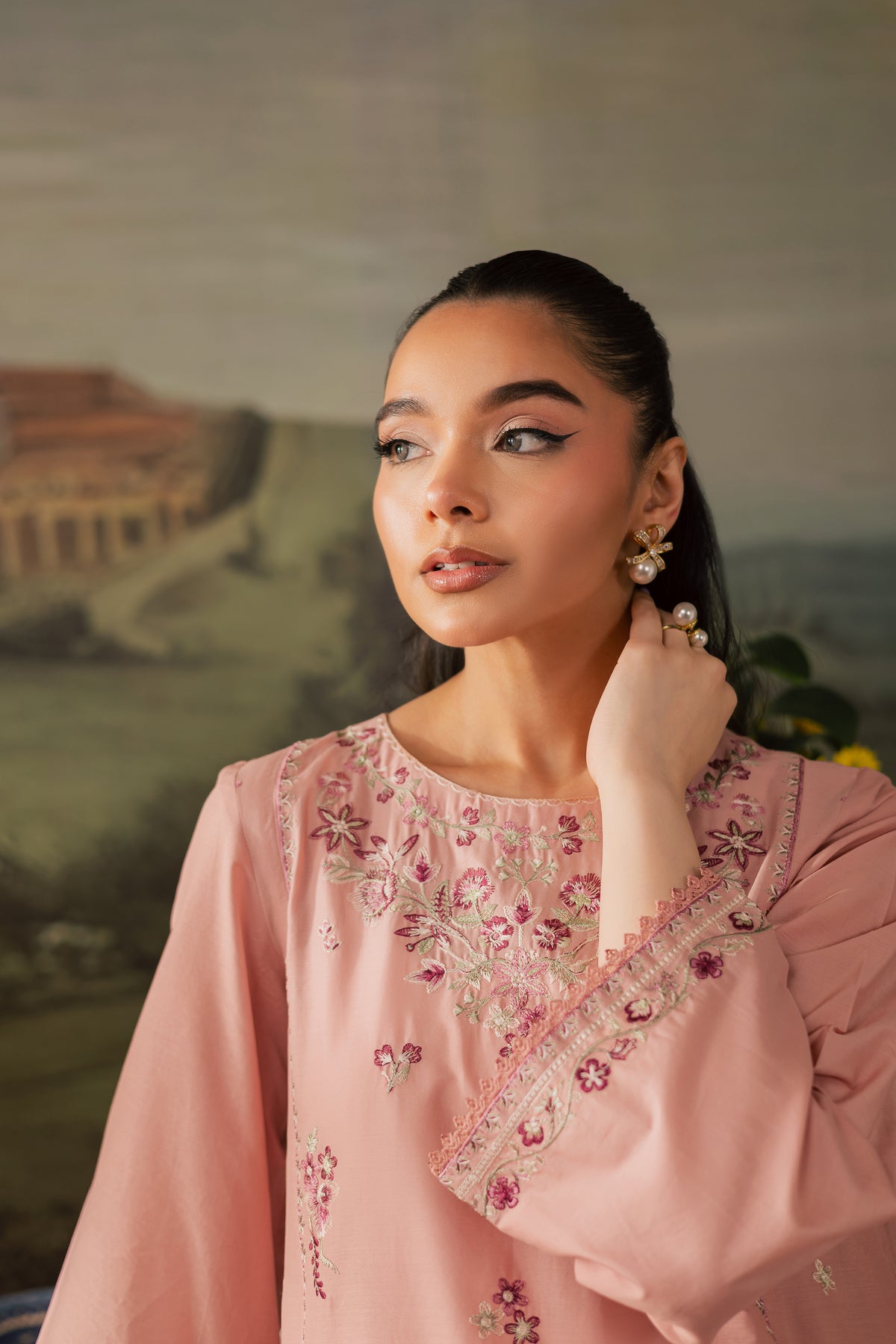 It is paired with loose cambric culottes featuring embroidered borders that echo the shirt’s detailing, bringing balance and elegance to the overall look.