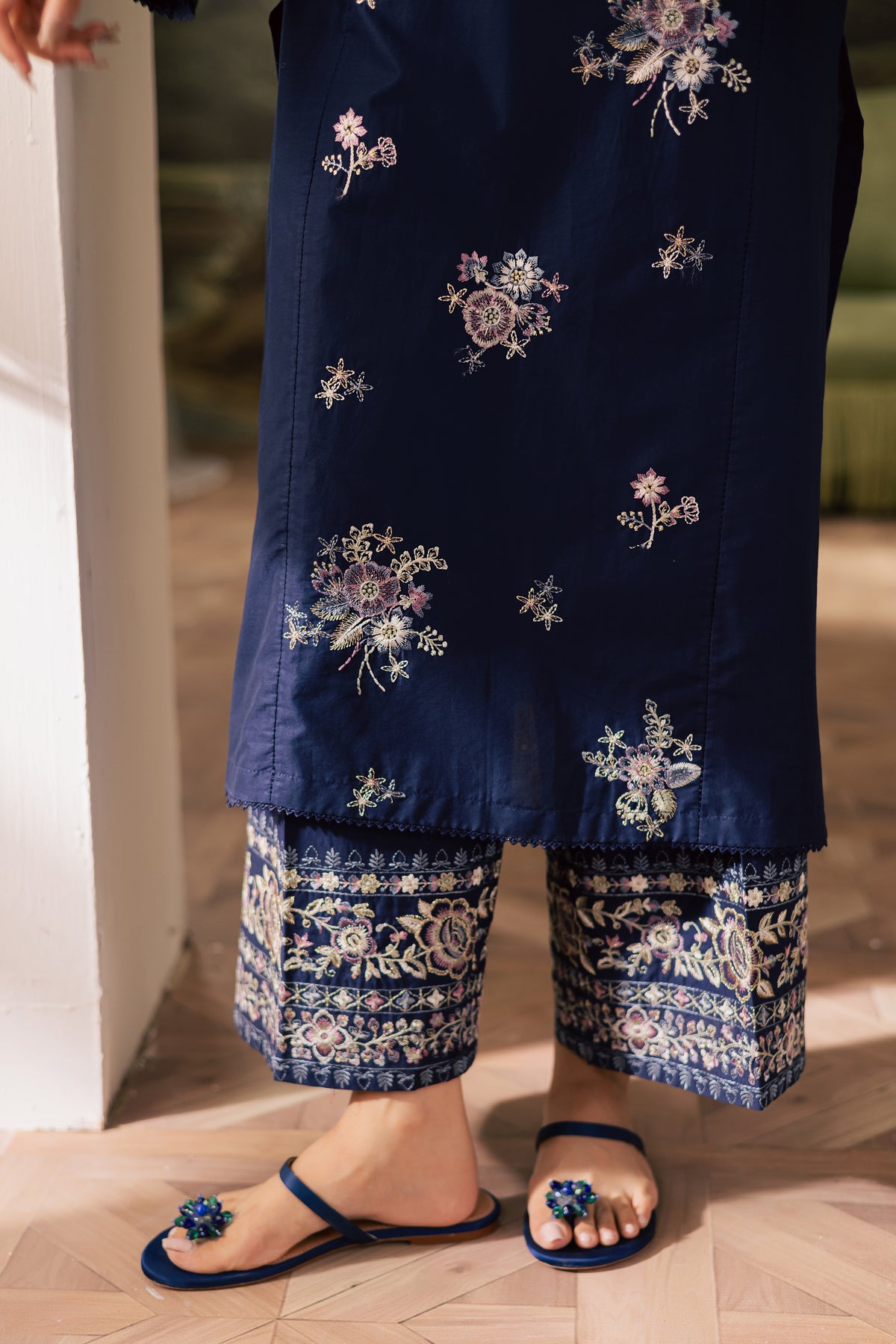 An embroidered paneled midnight blue pima lawn shirt featuring an all-over floral spread that brings a fresh and feminine charm to the ensemble. The sleeves are adorned with intricately embroidered borders, adding definition and a refined touch to the silhouette.