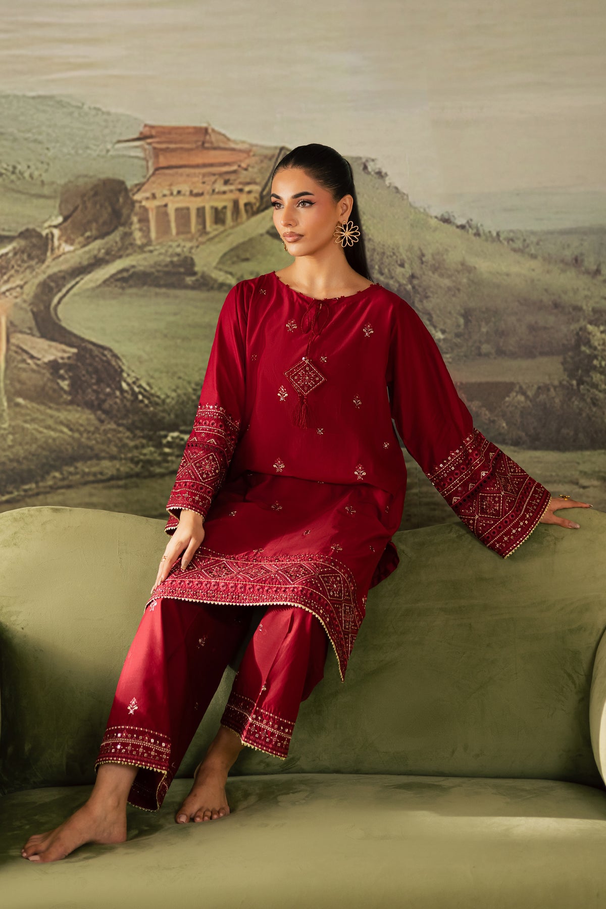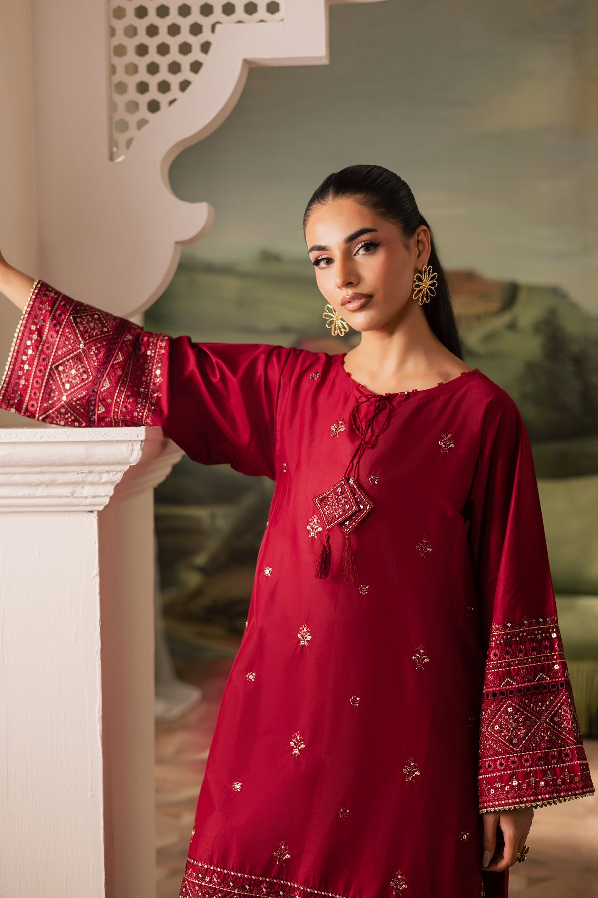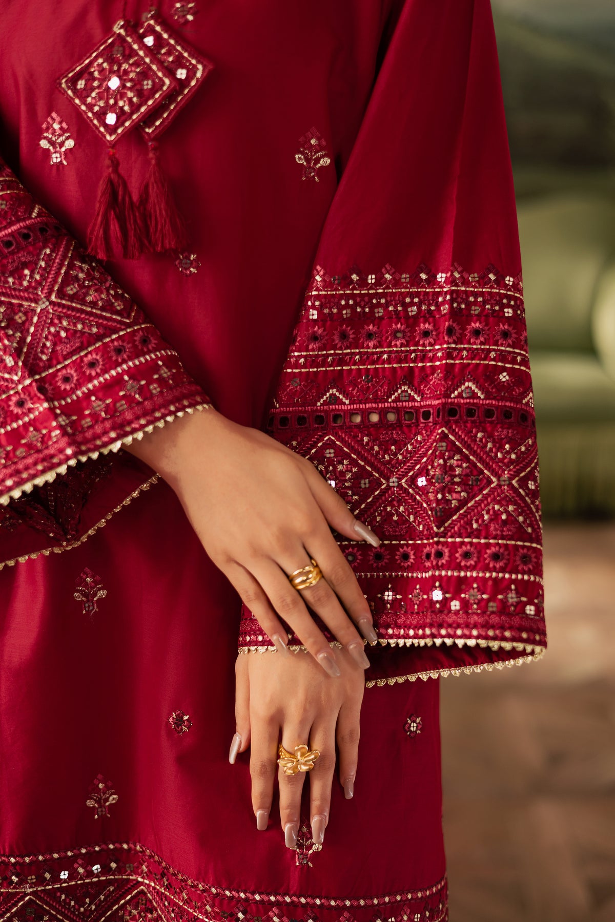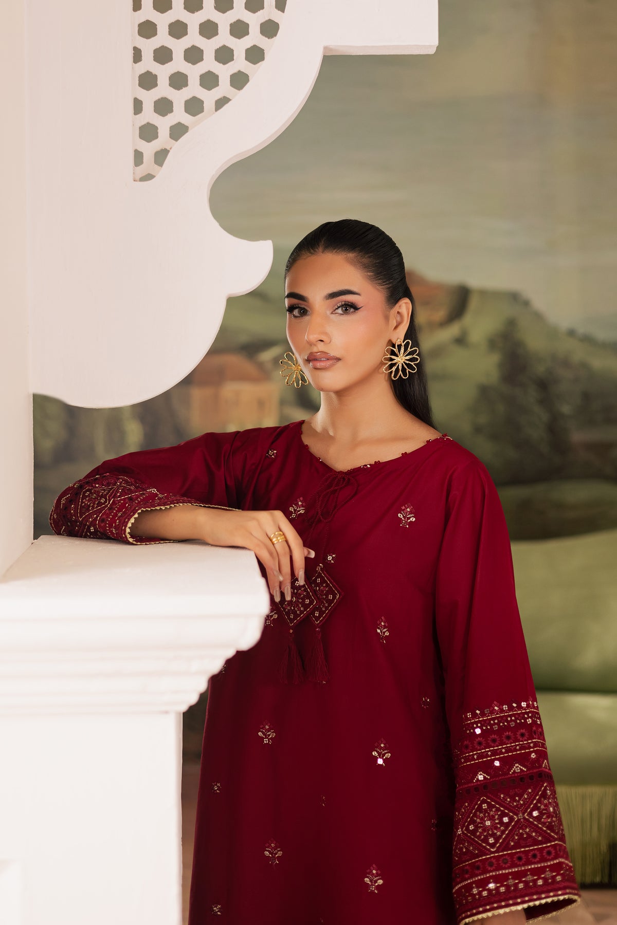 A contemporary short maroon pima lawn shirt featuring a distinctive square armhole cut, adorned with geometric embroidered borders along the hem and sleeves. The design is elevated with playful samosa lace and delicately crafted embroidered tassels, adding movement and artisanal charm to the silhouette.