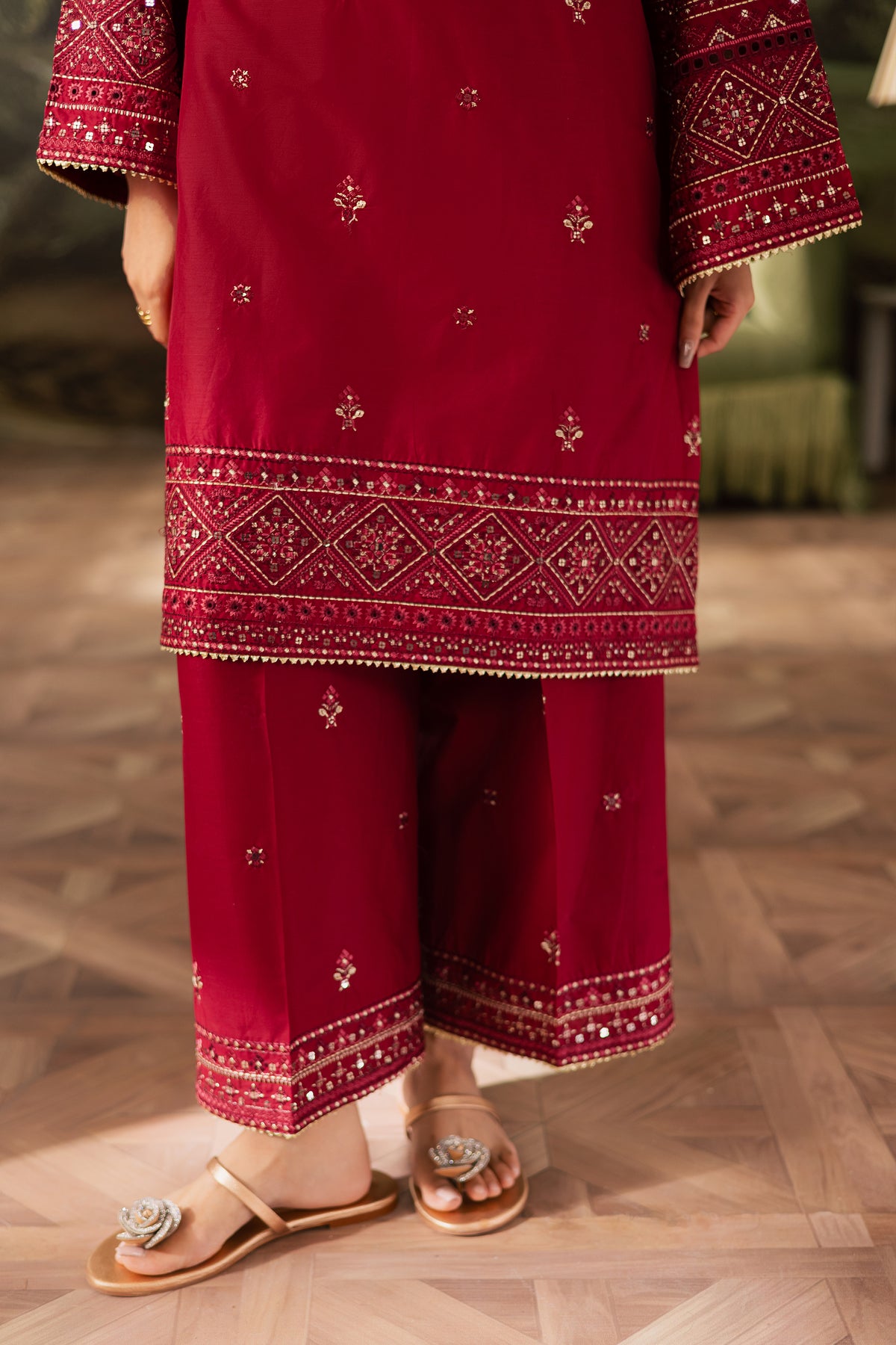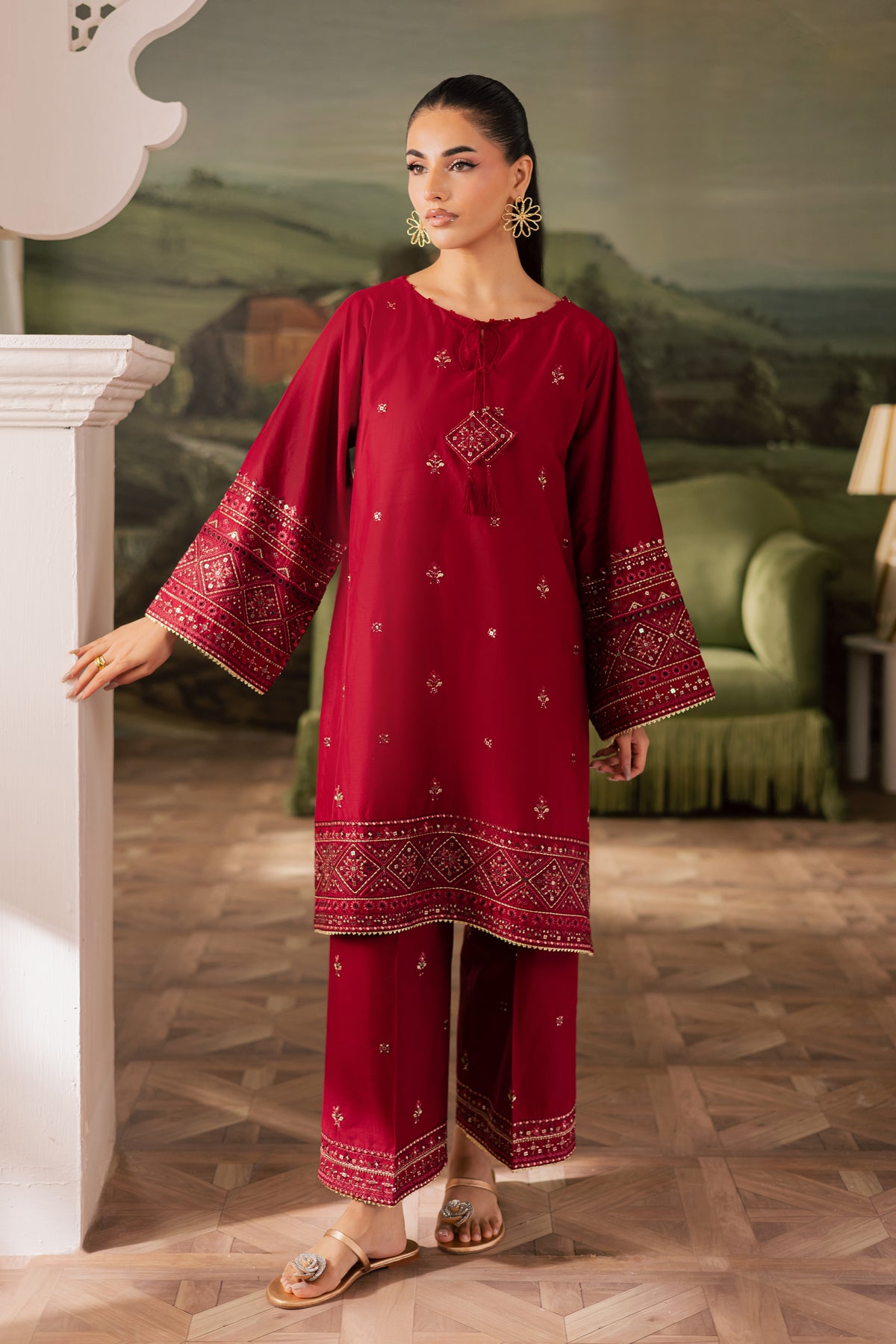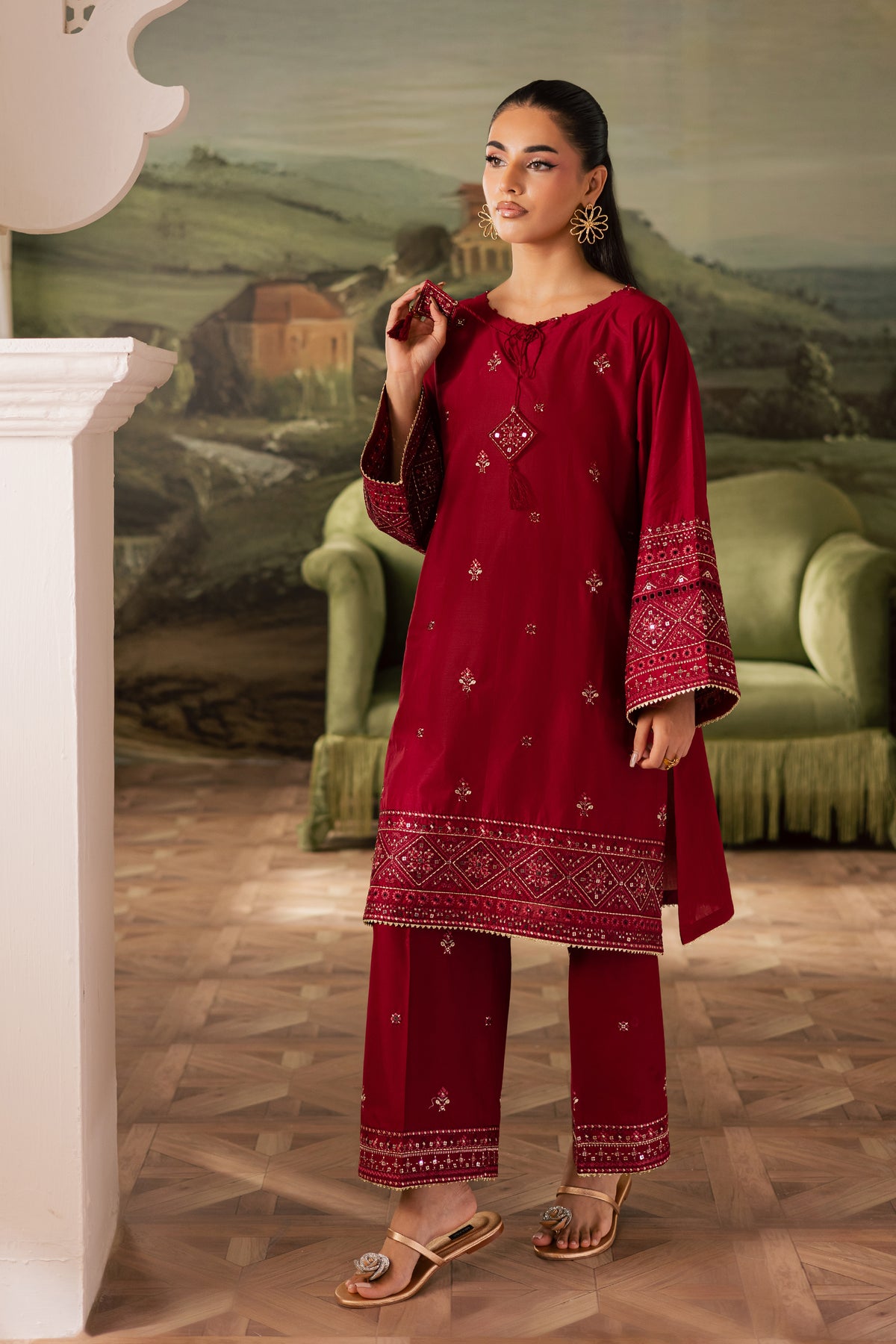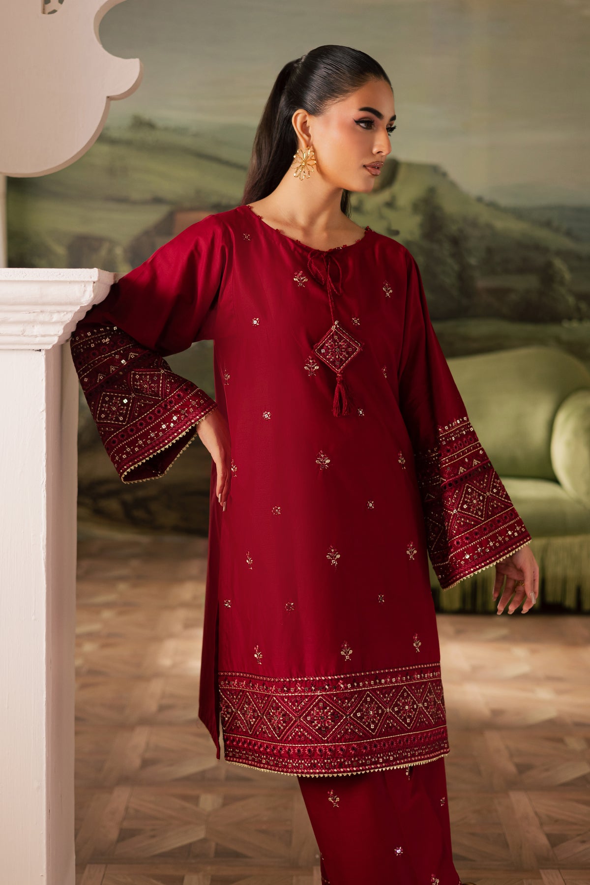 A contemporary short maroon pima lawn shirt featuring a distinctive square armhole cut, adorned with geometric embroidered borders along the hem and sleeves. The design is elevated with playful samosa lace and delicately crafted embroidered tassels, adding movement and artisanal charm to the silhouette.