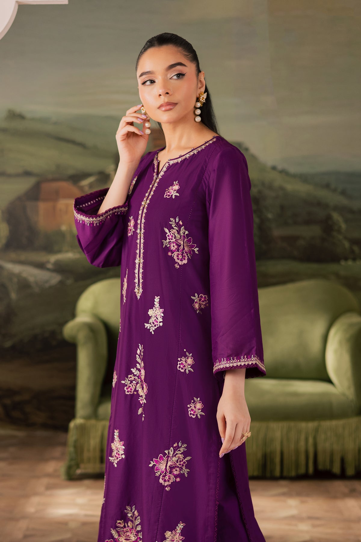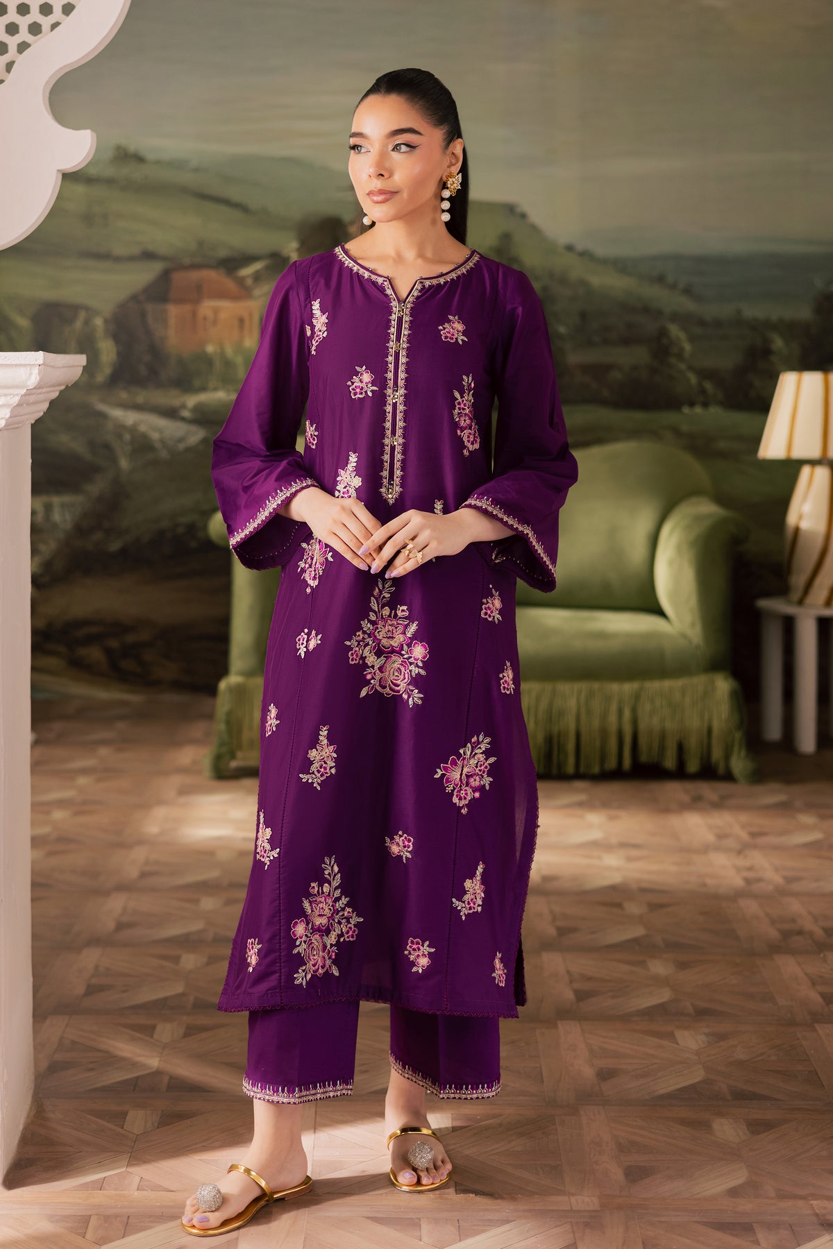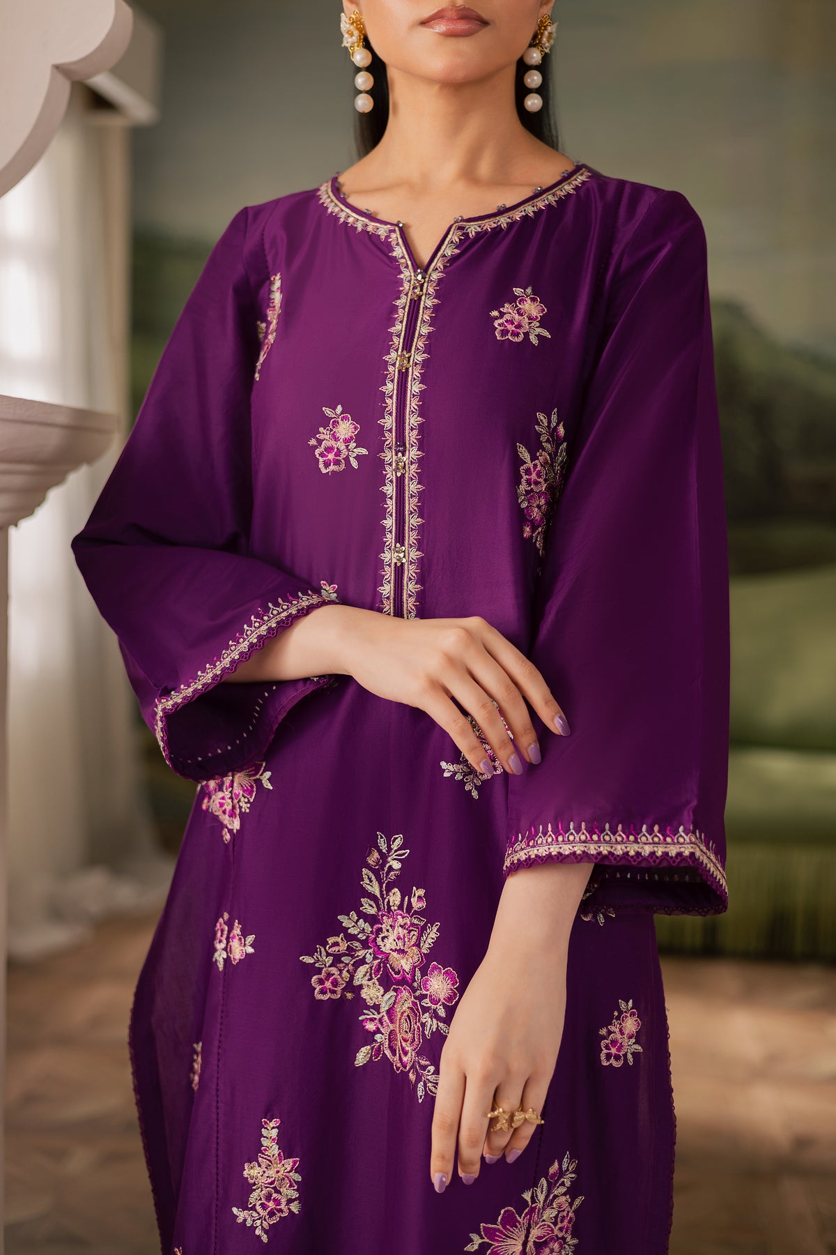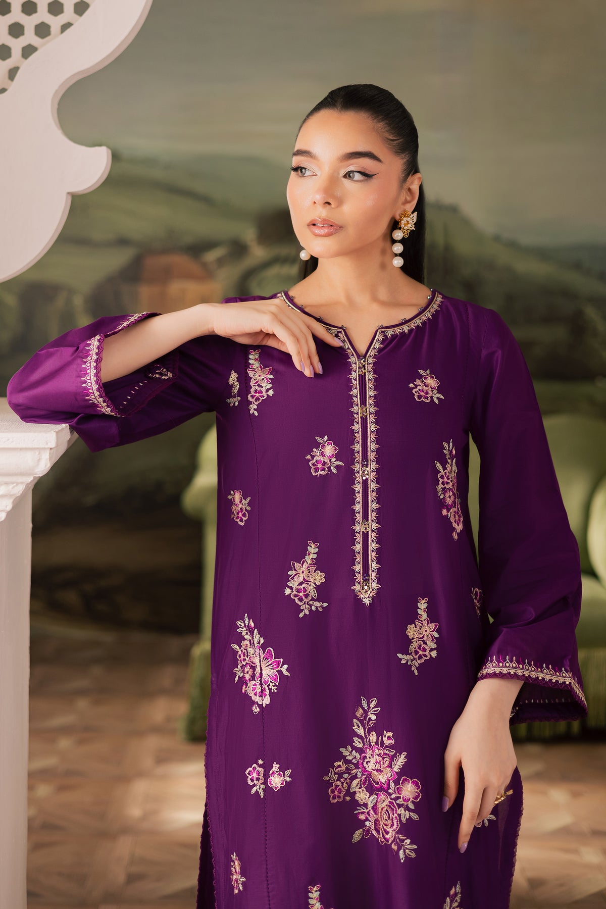 A statement two-piece ensemble featuring a heavily composed embroidered spread on the purple pima lawn shirt, showcasing intricate craftsmanship and bold detailing that adds depth and visual interest. The richly adorned design brings a festive elegance to the contemporary silhouette.