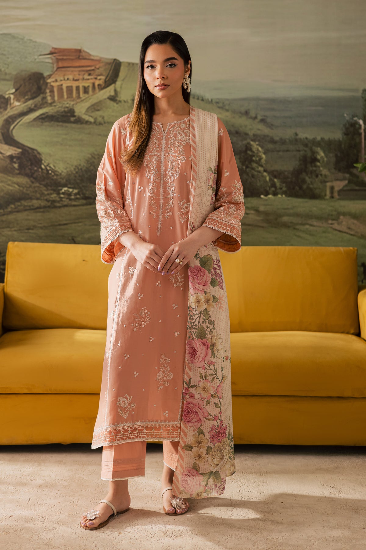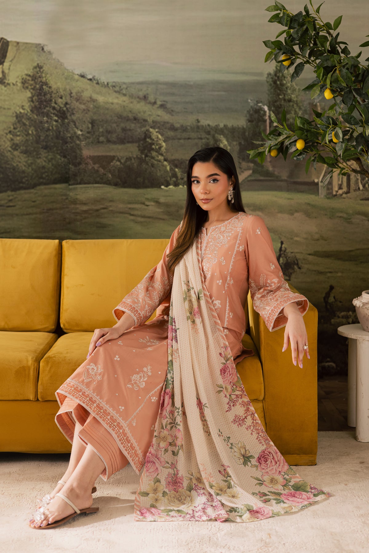 The outfit is completed with a digitally printed Swiss voile dupatta that adds a light, airy drape and a vibrant contrast, tying the entire ensemble together with effortless sophistication.