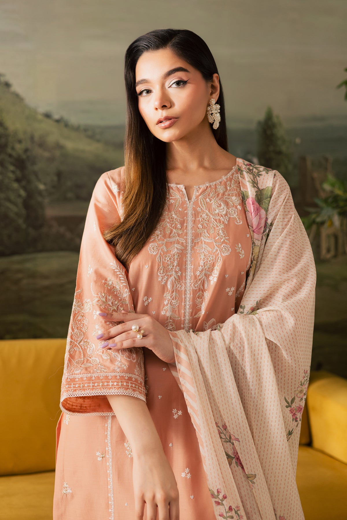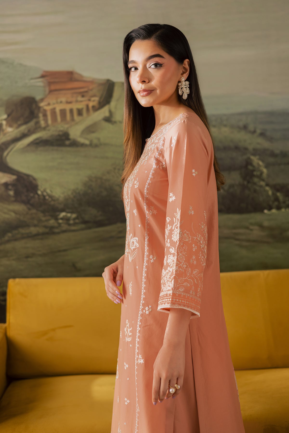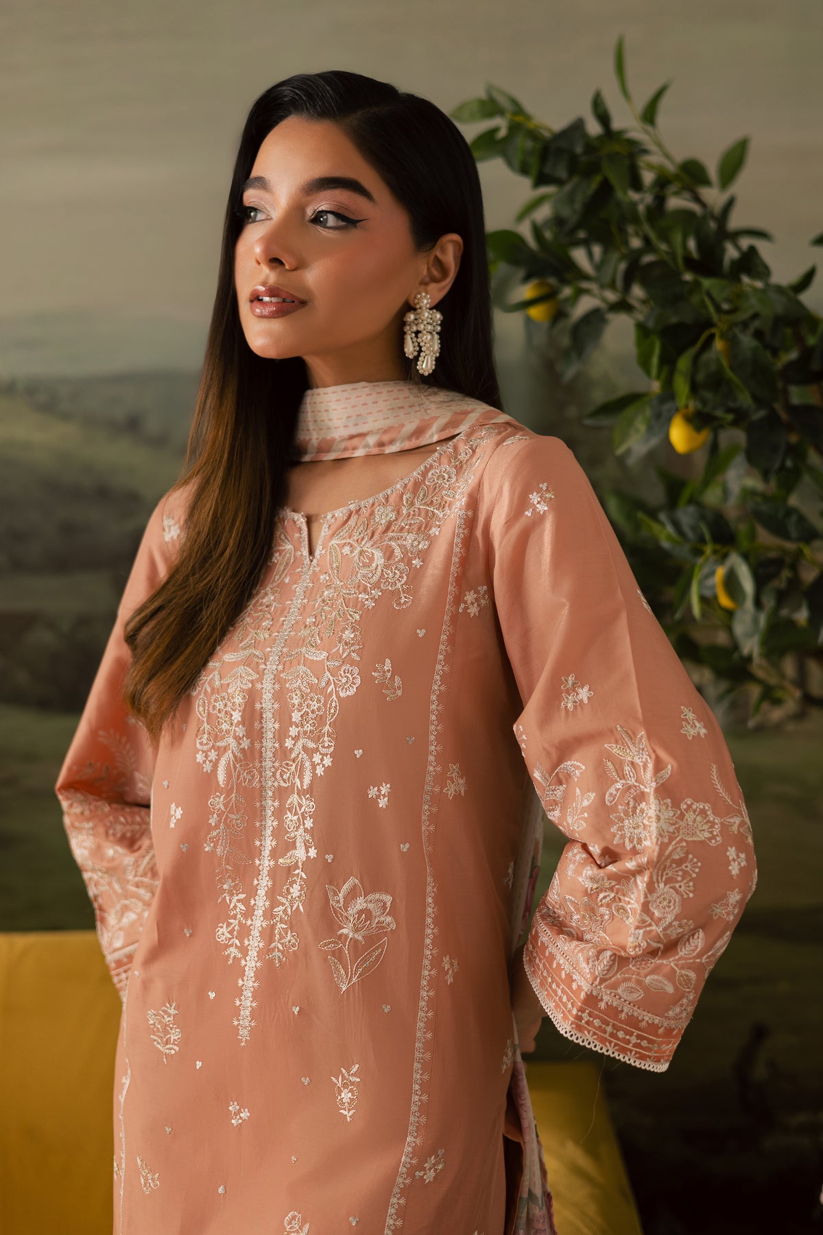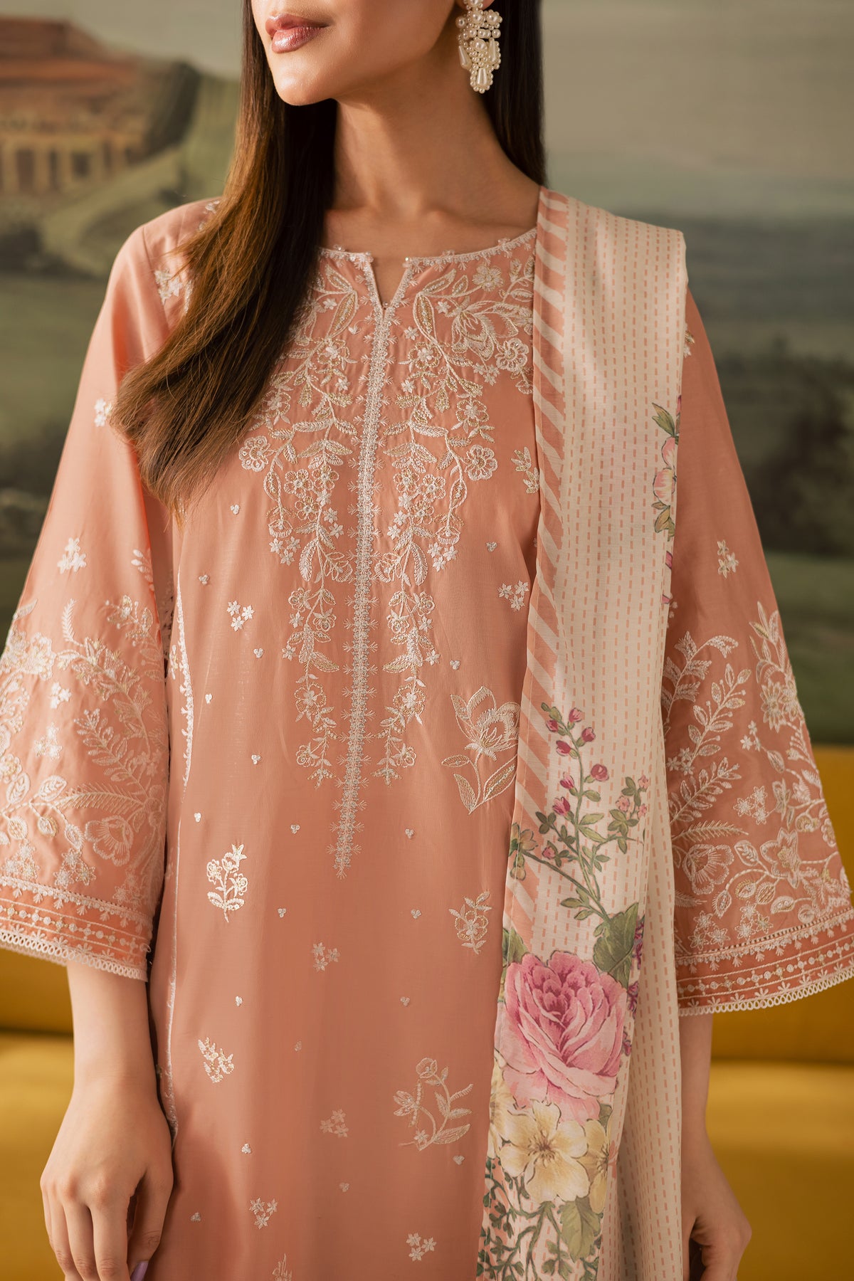 An embroidered peach paneled pima lawn shirt crafted with precision, featuring an intricately designed neckline, delicate motif spread, and finely detailed borders that lend a graceful charm to the ensemble. The embroidery adds depth and elegance, making it a versatile piece for both casual and festive wear.
