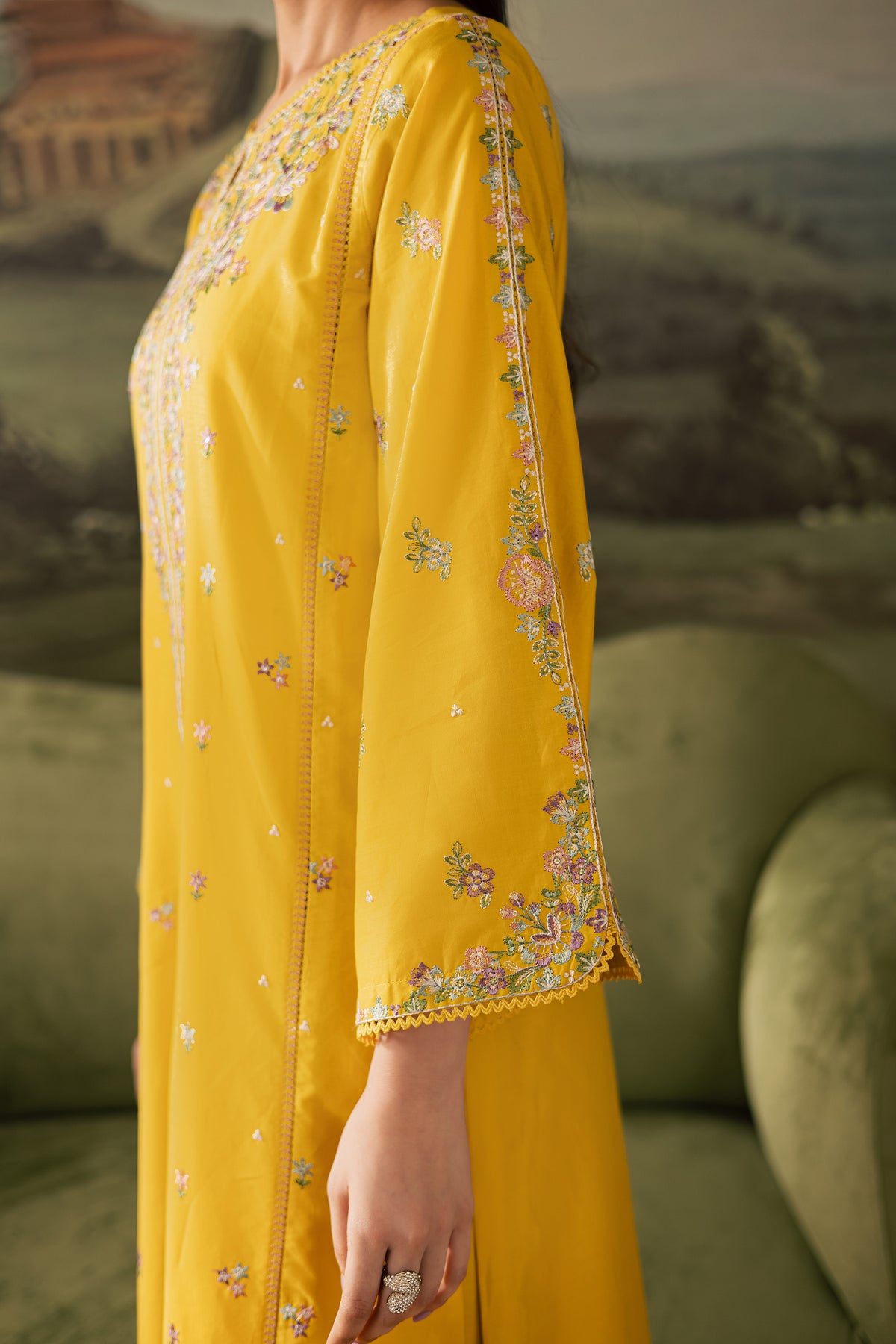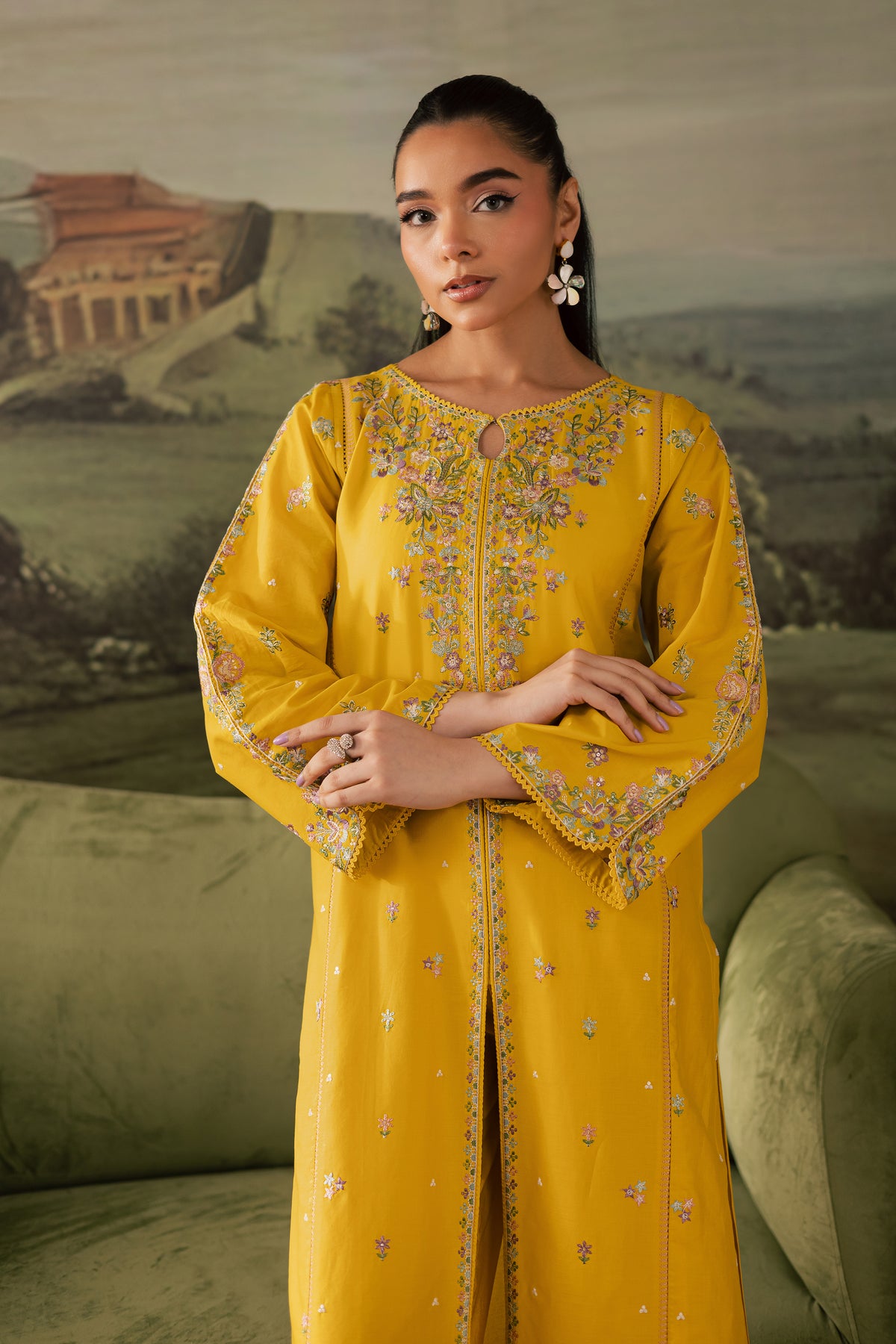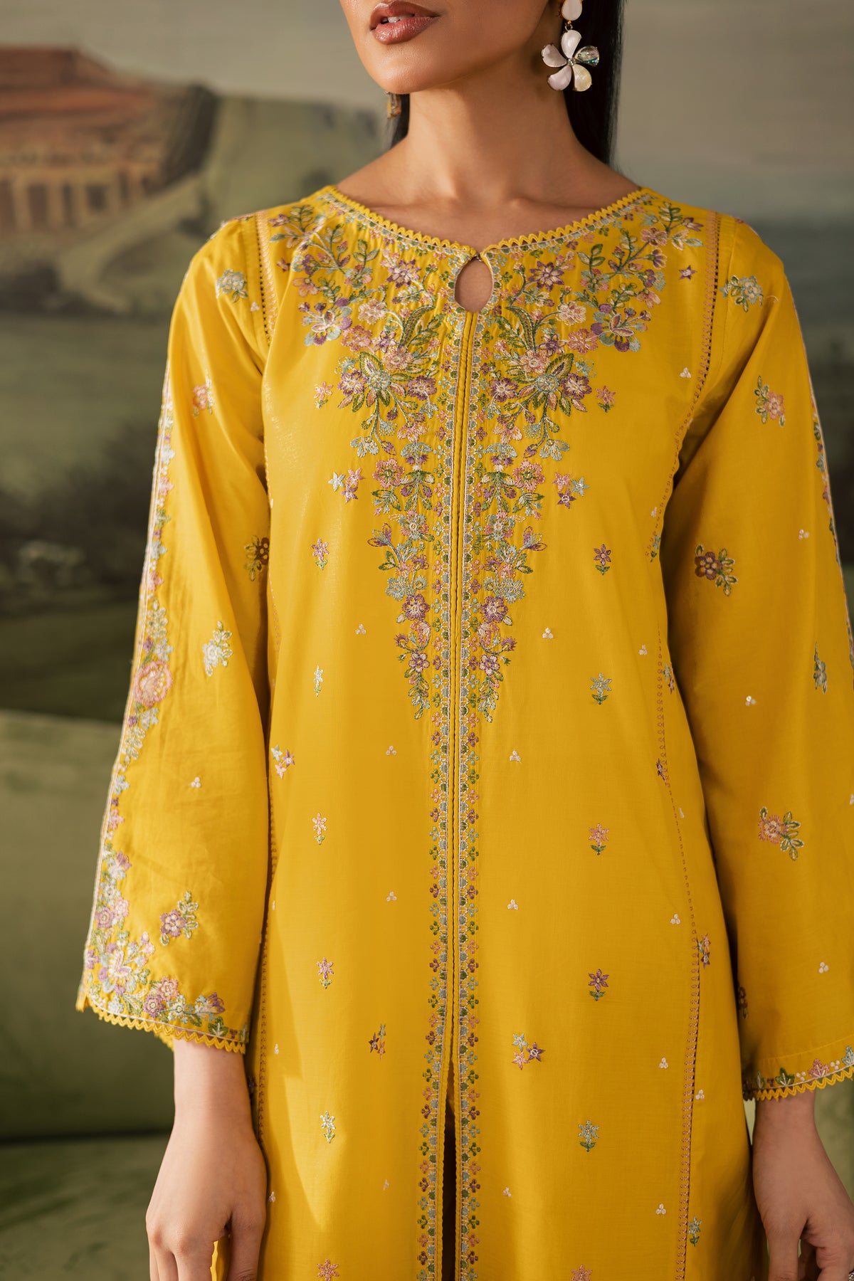 An embroidered honey colored pima lawn paneled shirt designed with a flattering round hem and softly structured sleeves, blending elegance with ease. The embroidery adds delicate texture and charm, making it a versatile piece for both day and evening wear.