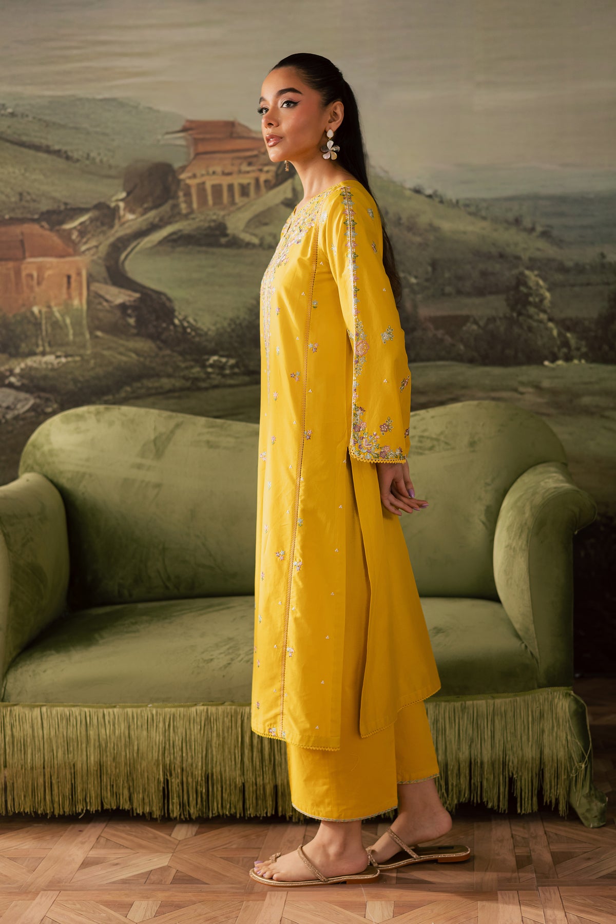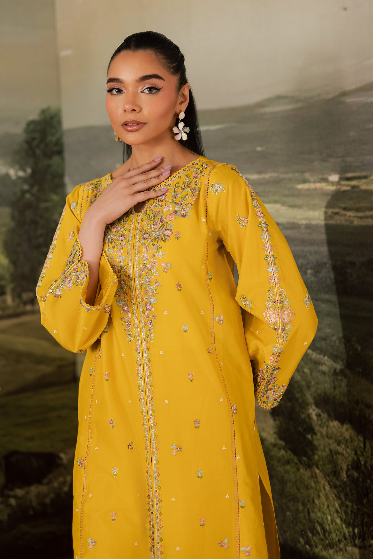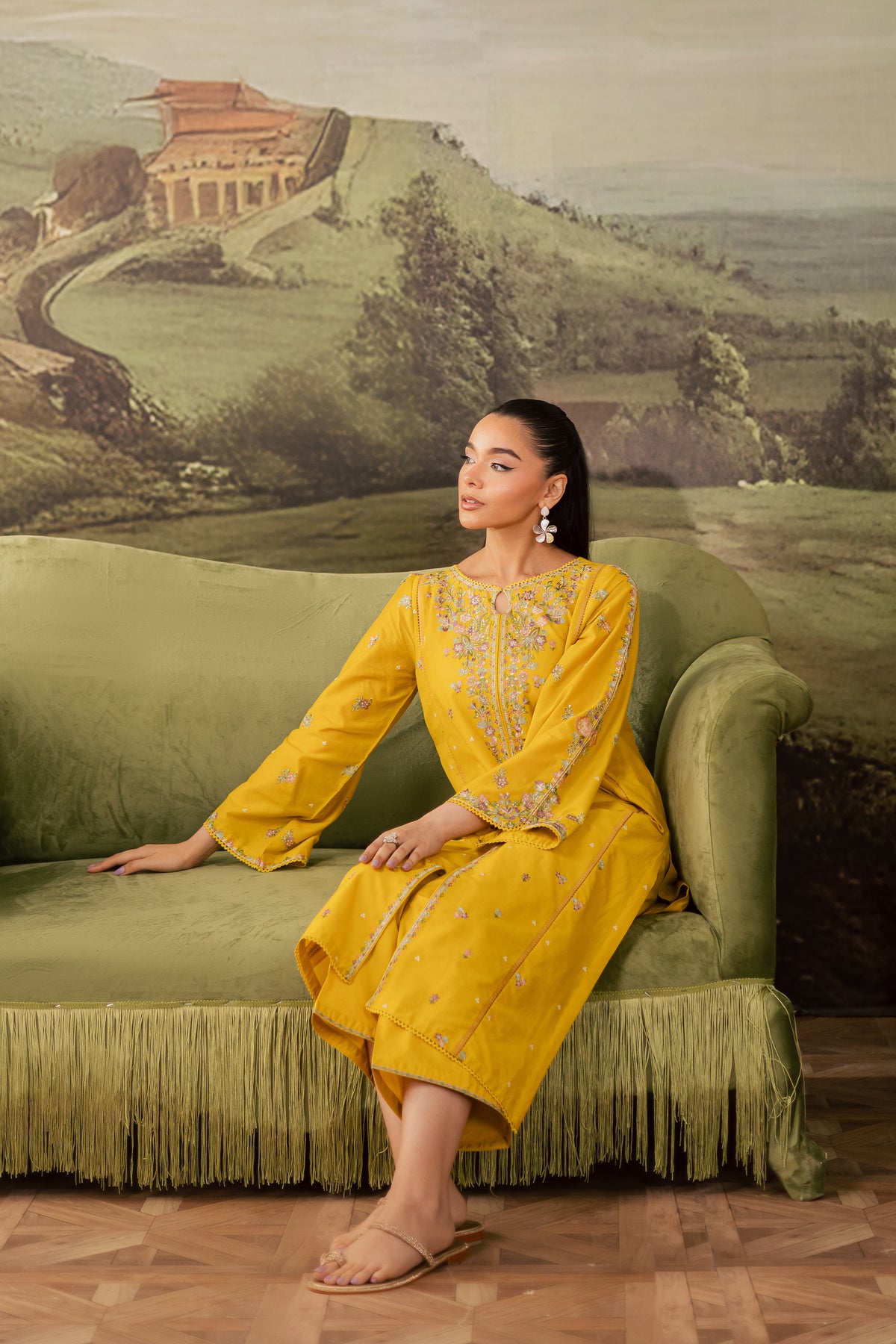 An embroidered honey colored pima lawn paneled shirt designed with a flattering round hem and softly structured sleeves, blending elegance with ease. The embroidery adds delicate texture and charm, making it a versatile piece for both day and evening wear.