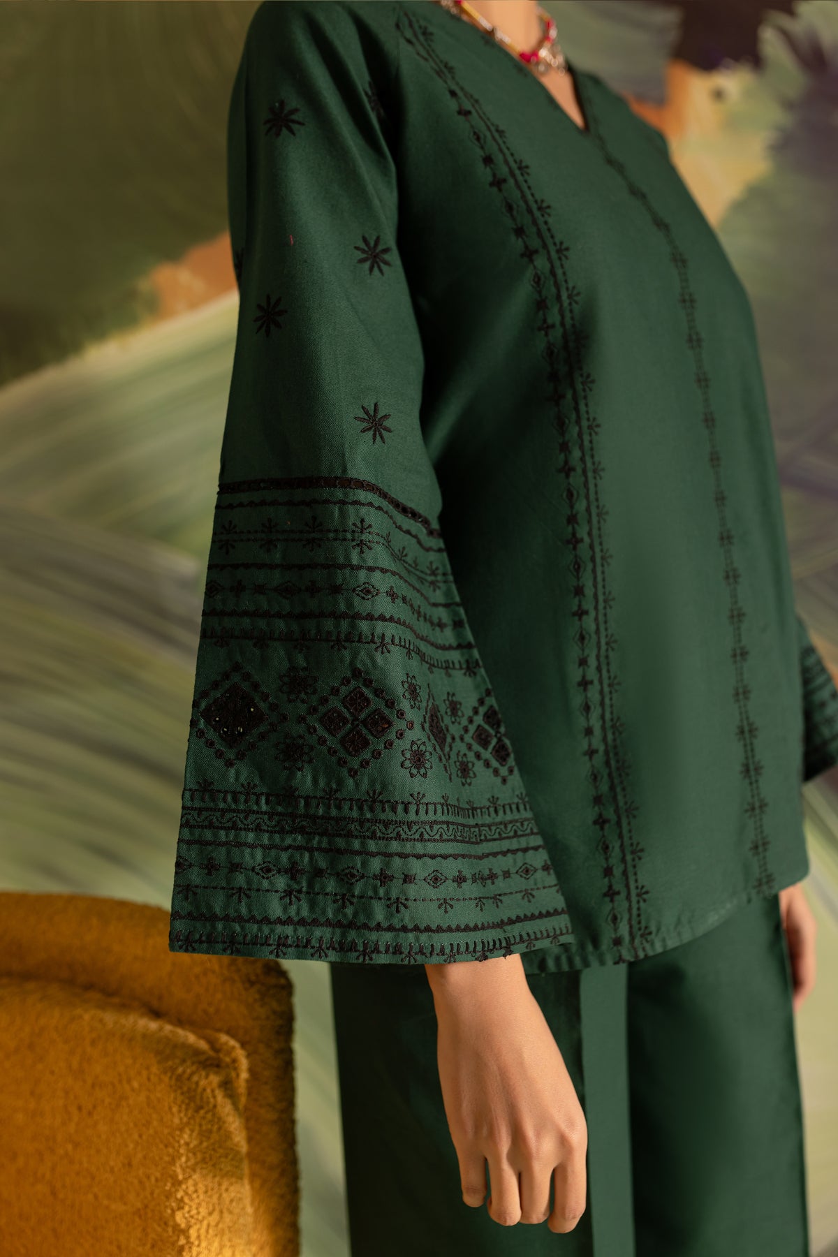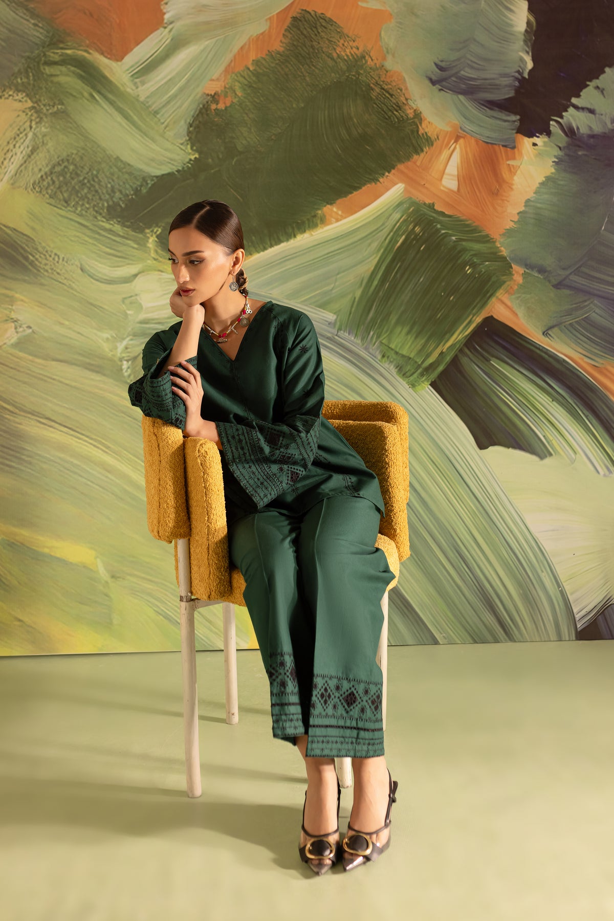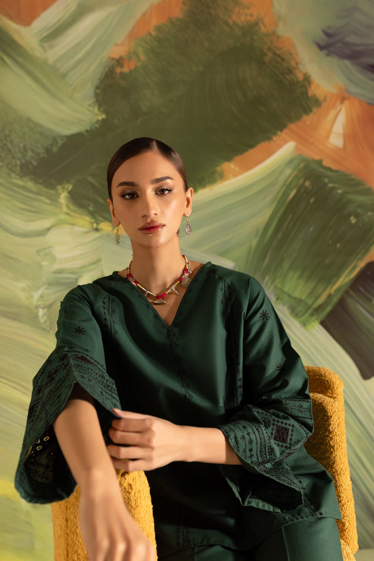 This two-piece bottle green khaddar set is a Schiffli embroidered paneled top that features delicate, detailed embroidery across the panels, creating a sophisticated and textured look. Its design highlights timeless beauty with a modern twist.