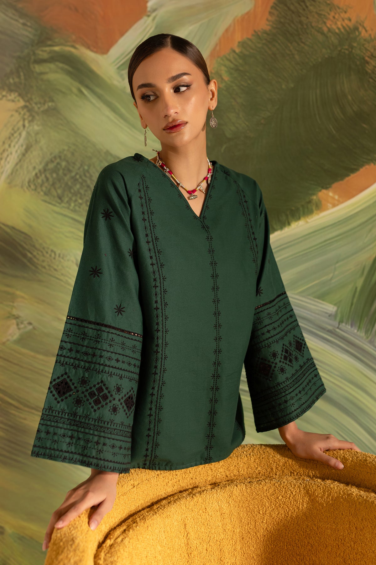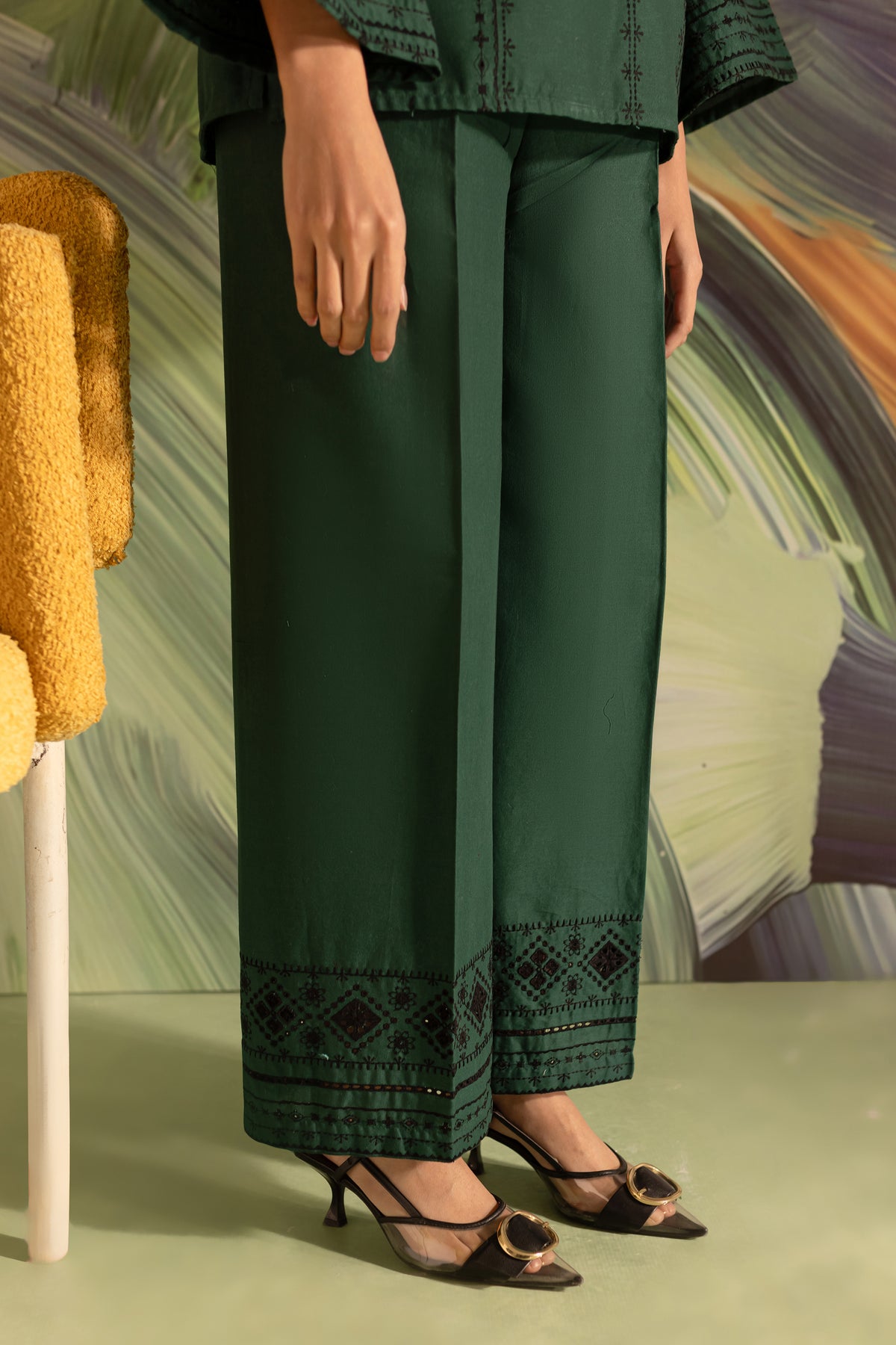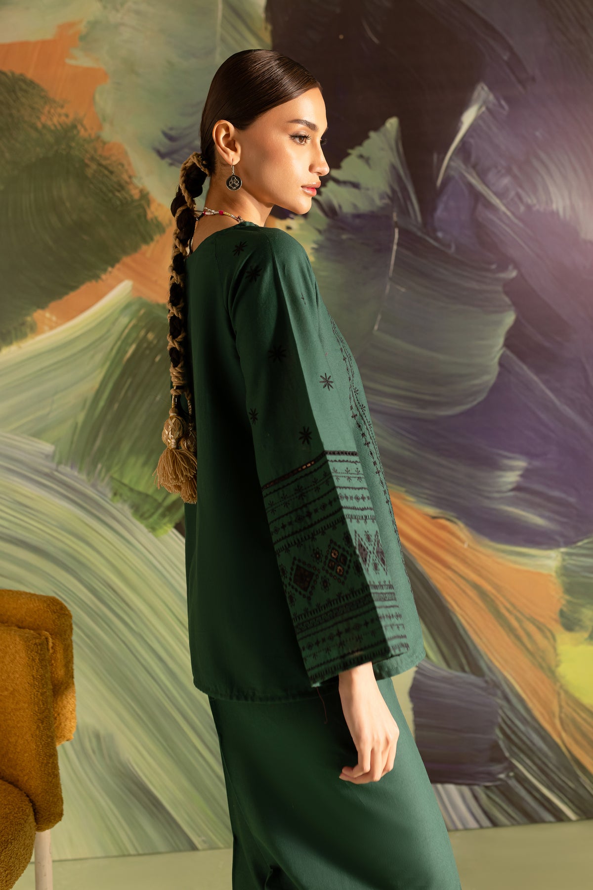 This two-piece bottle green khaddar set is a Schiffli embroidered paneled top that features delicate, detailed embroidery across the panels, creating a sophisticated and textured look. Its design highlights timeless beauty with a modern twist.