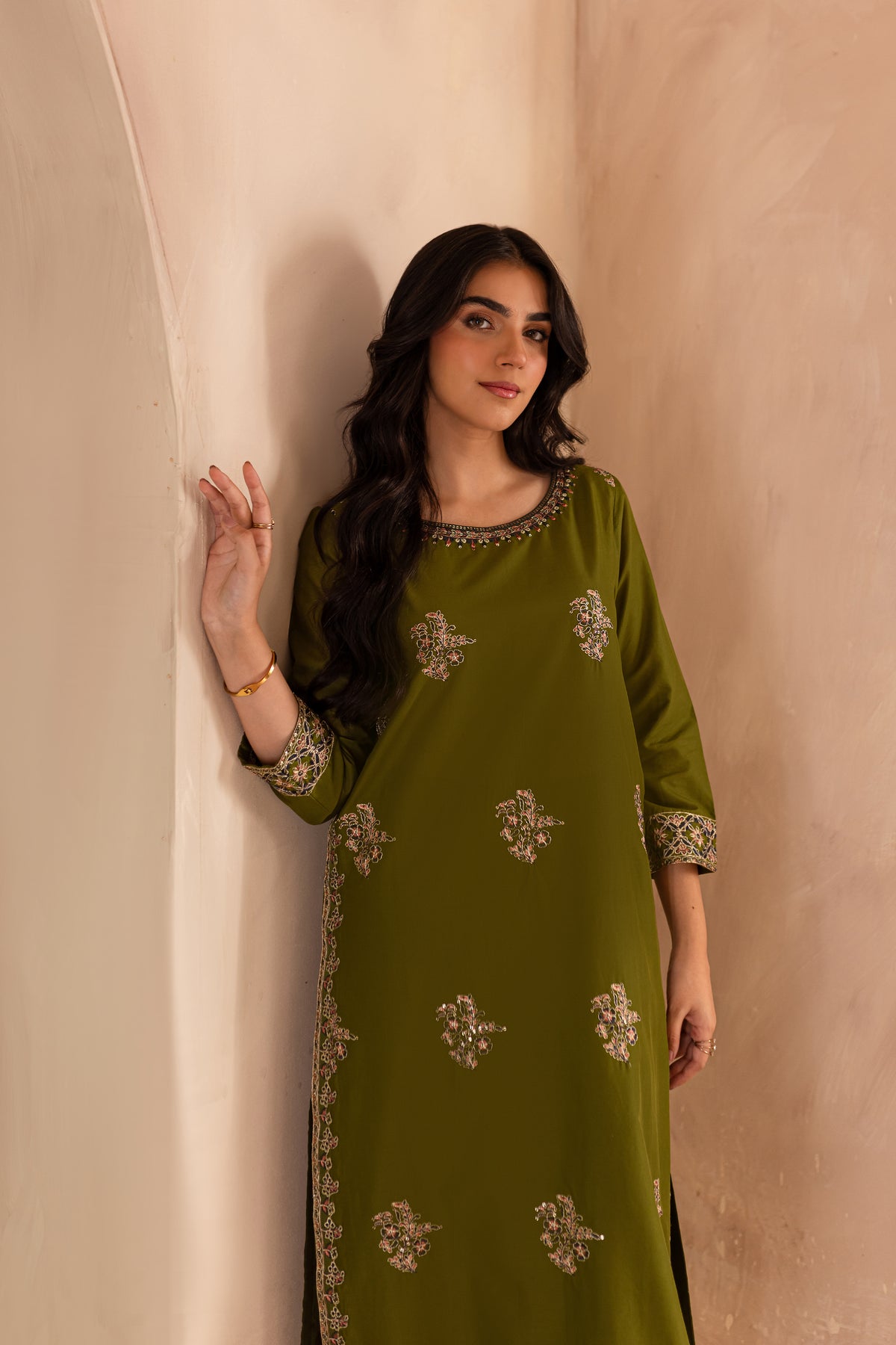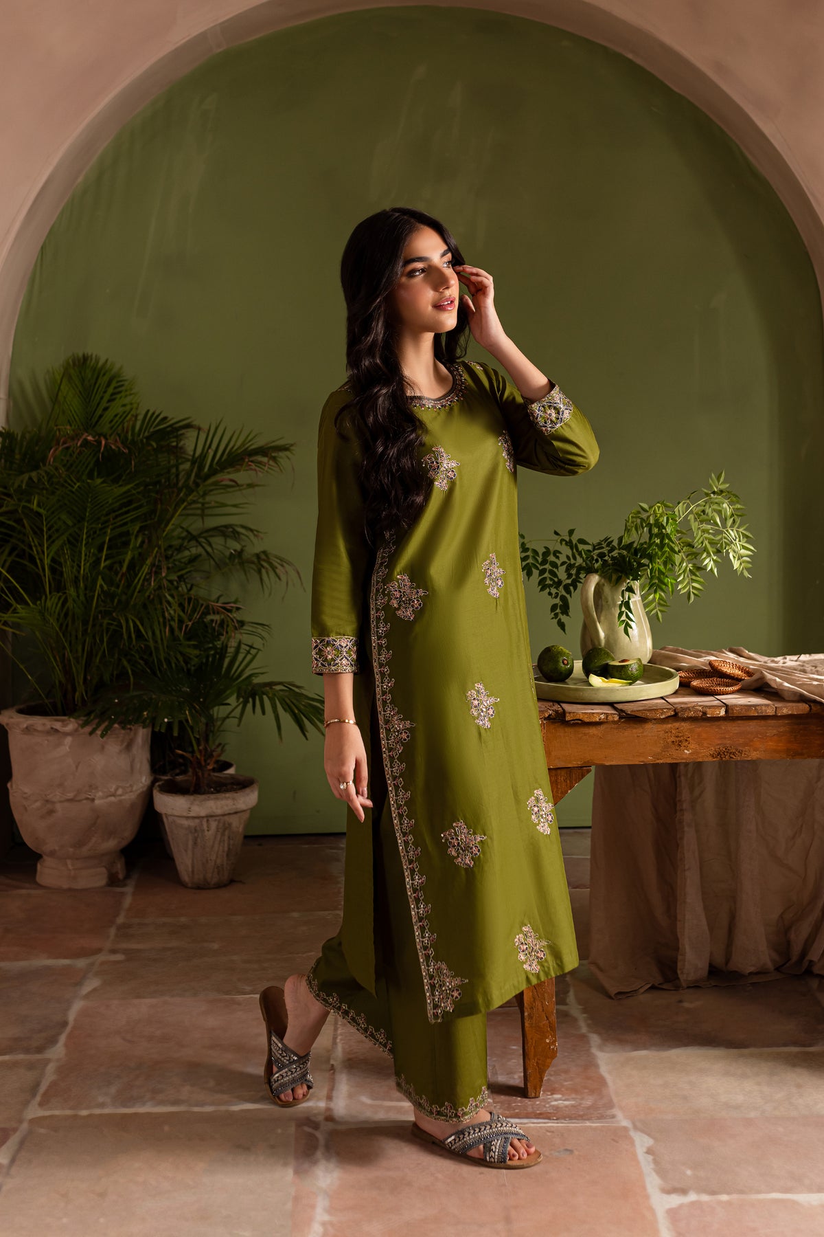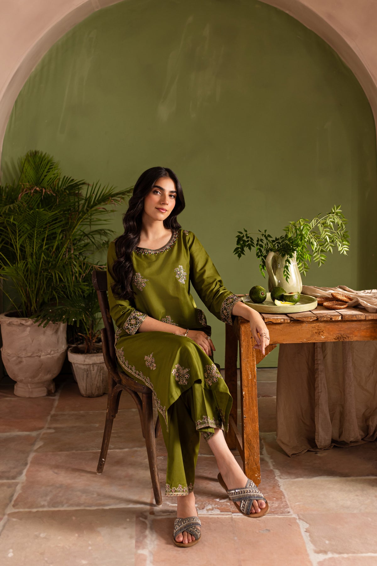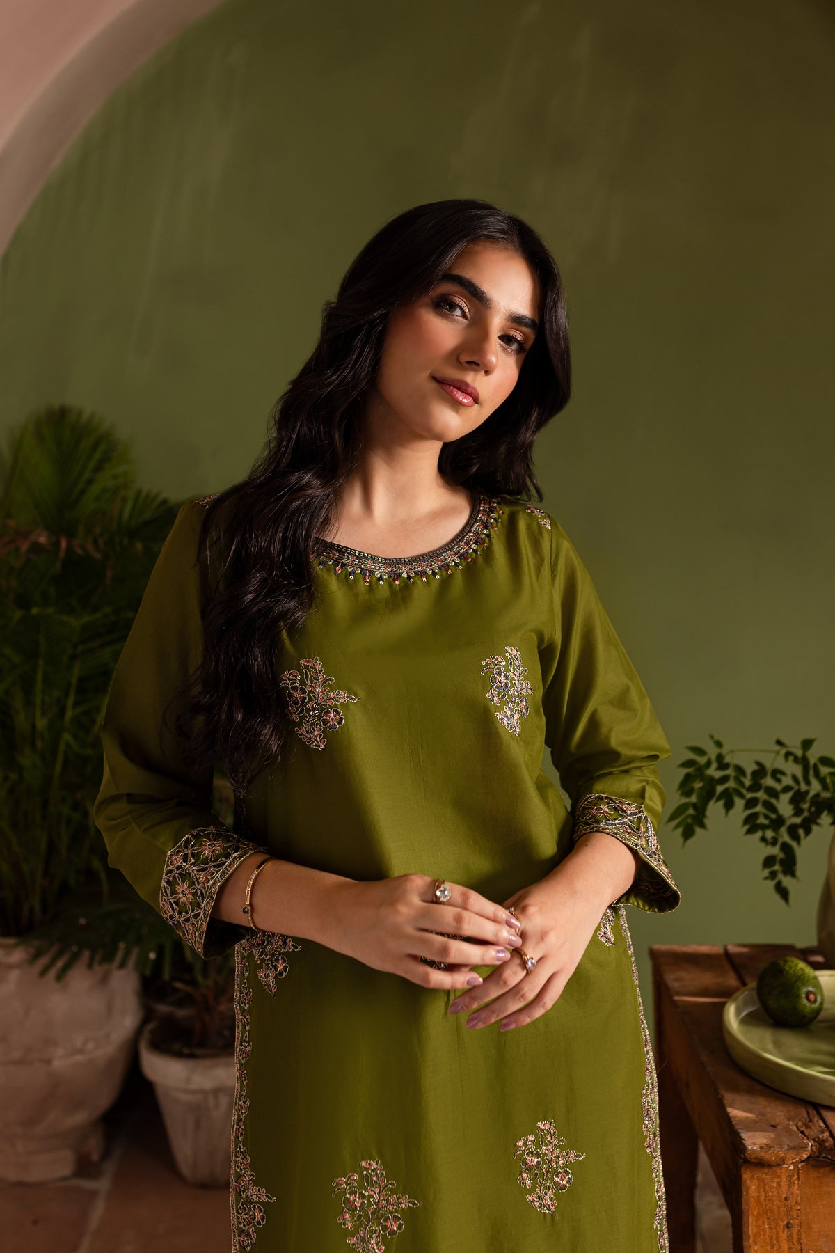 This beautiful outfit in a vibrant mehndi green hue captures attention with its detailed craftsmanship. The pima lawn shirt is adorned with direct embroidery on the front, featuring a spread of intricate motifs that add depth to the design. A minimal boat neckline enhances the graceful silhouette, while the three quarter sleeves are highlighted by an embroidered border for a refined touch. The side chalk patti also features delicate embroidery, adding to the overall elegance.