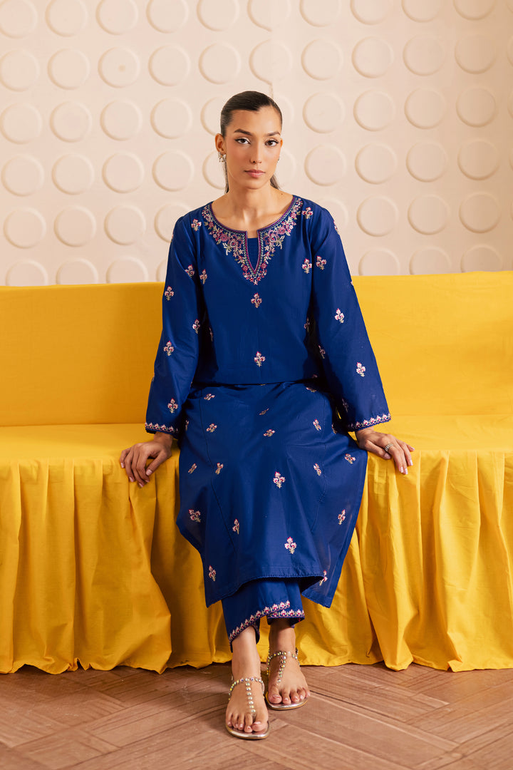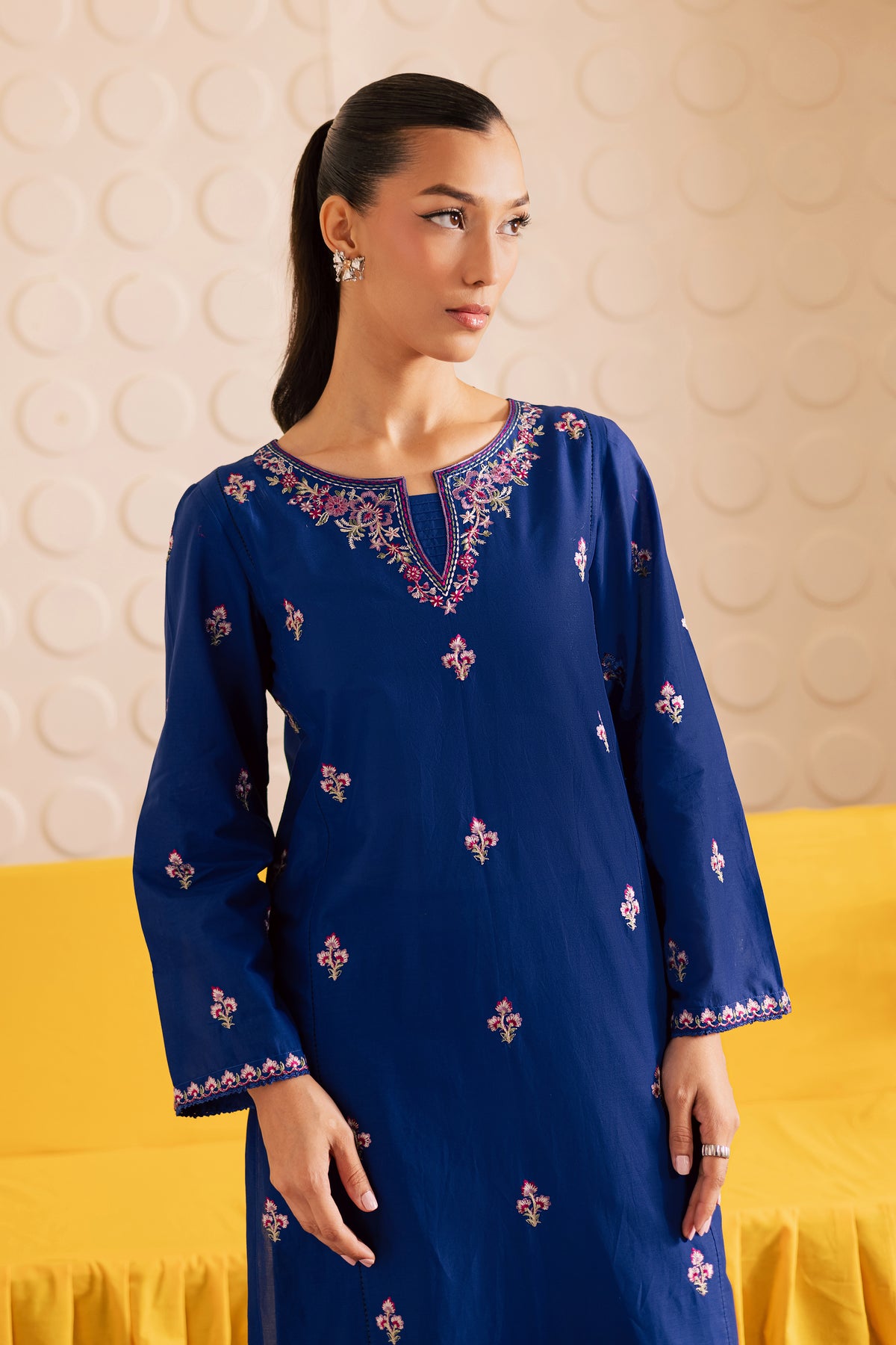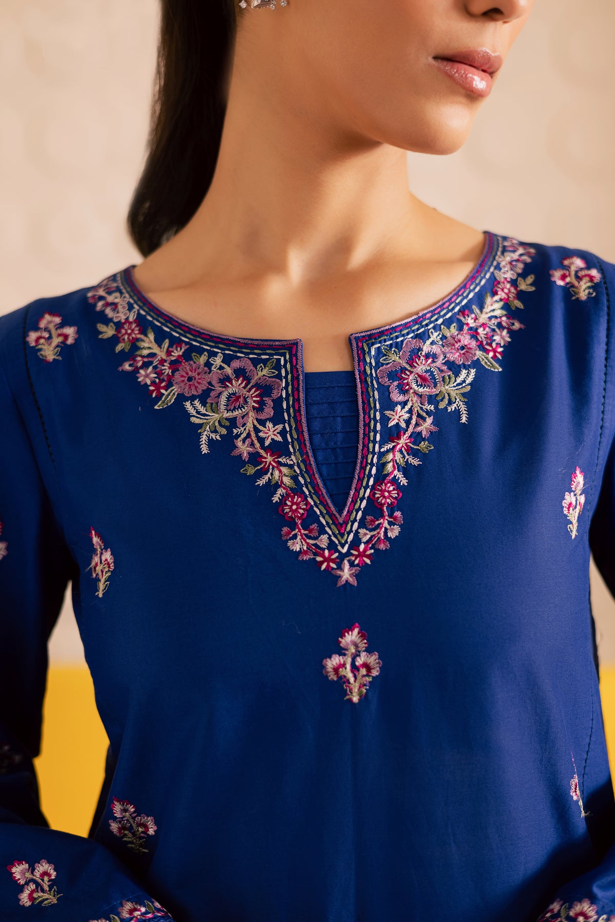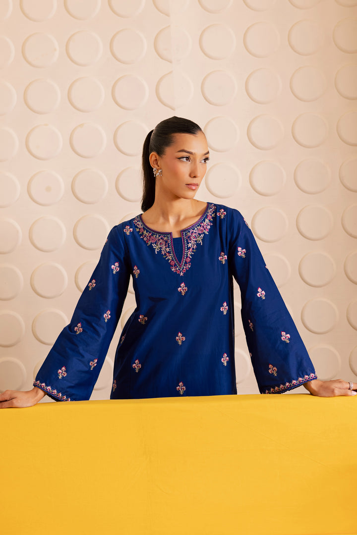 An embroidered pima lawn electric blue long shirt featuring a graceful spread of embroidery on the front and sleeves, offering a refined yet effortless look suitable for any occasion.