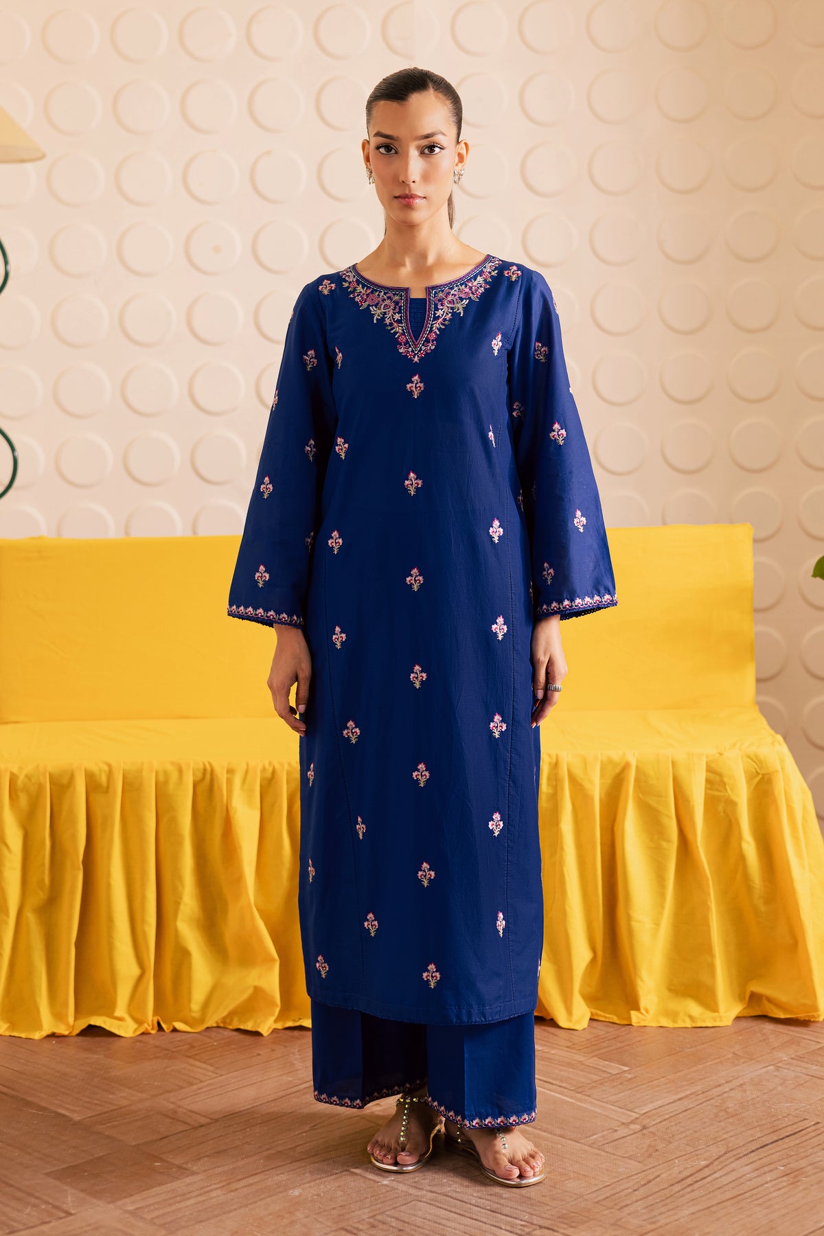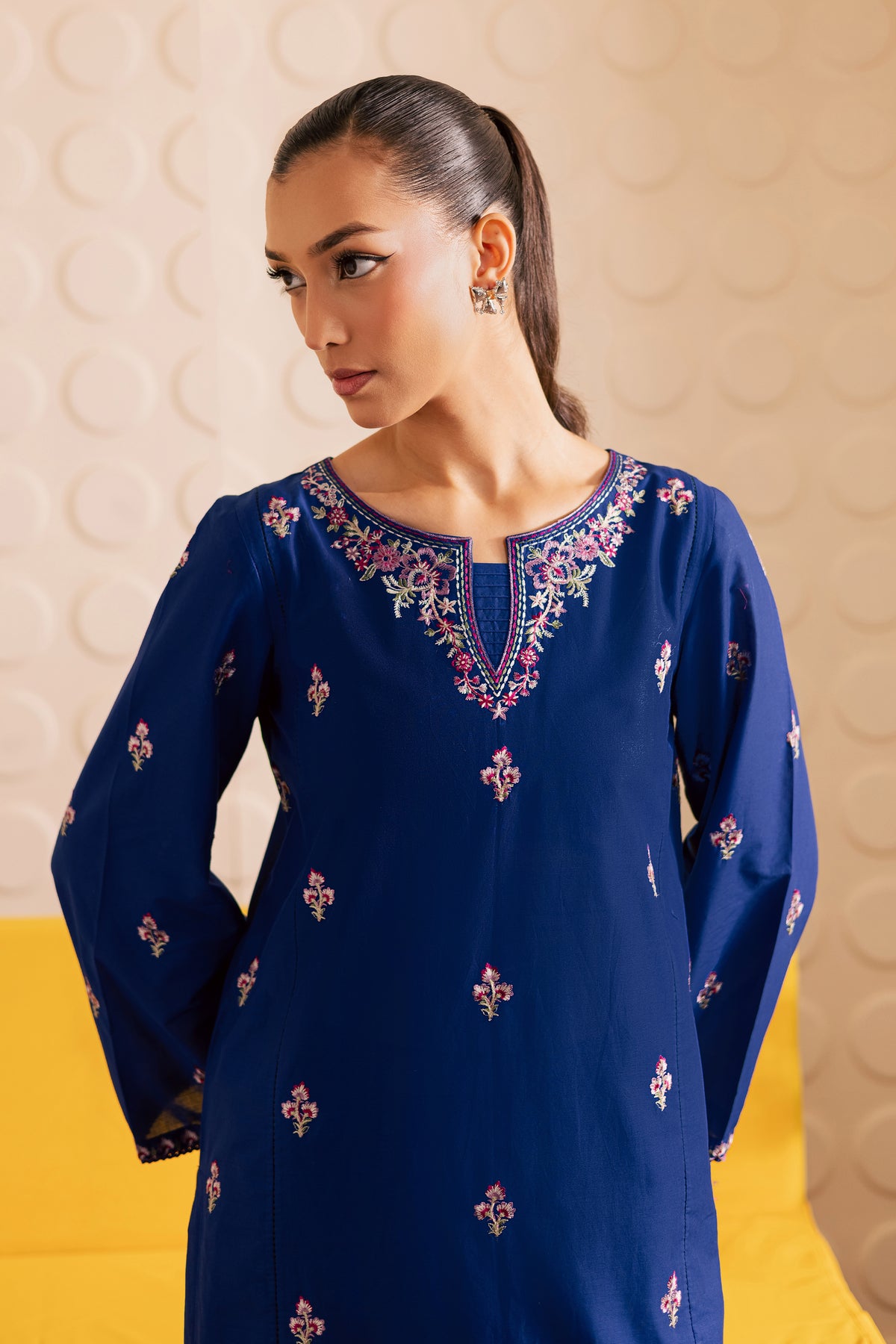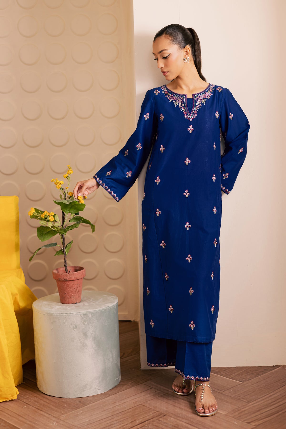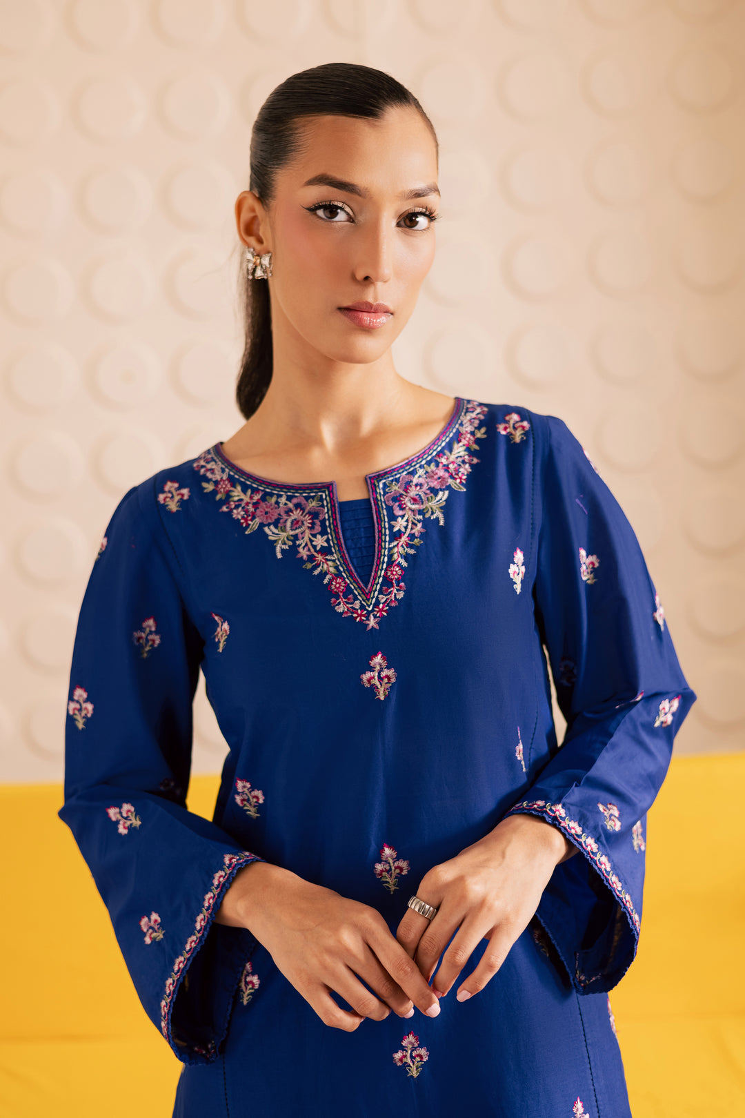 An embroidered pima lawn electric blue long shirt featuring a graceful spread of embroidery on the front and sleeves, offering a refined yet effortless look suitable for any occasion.