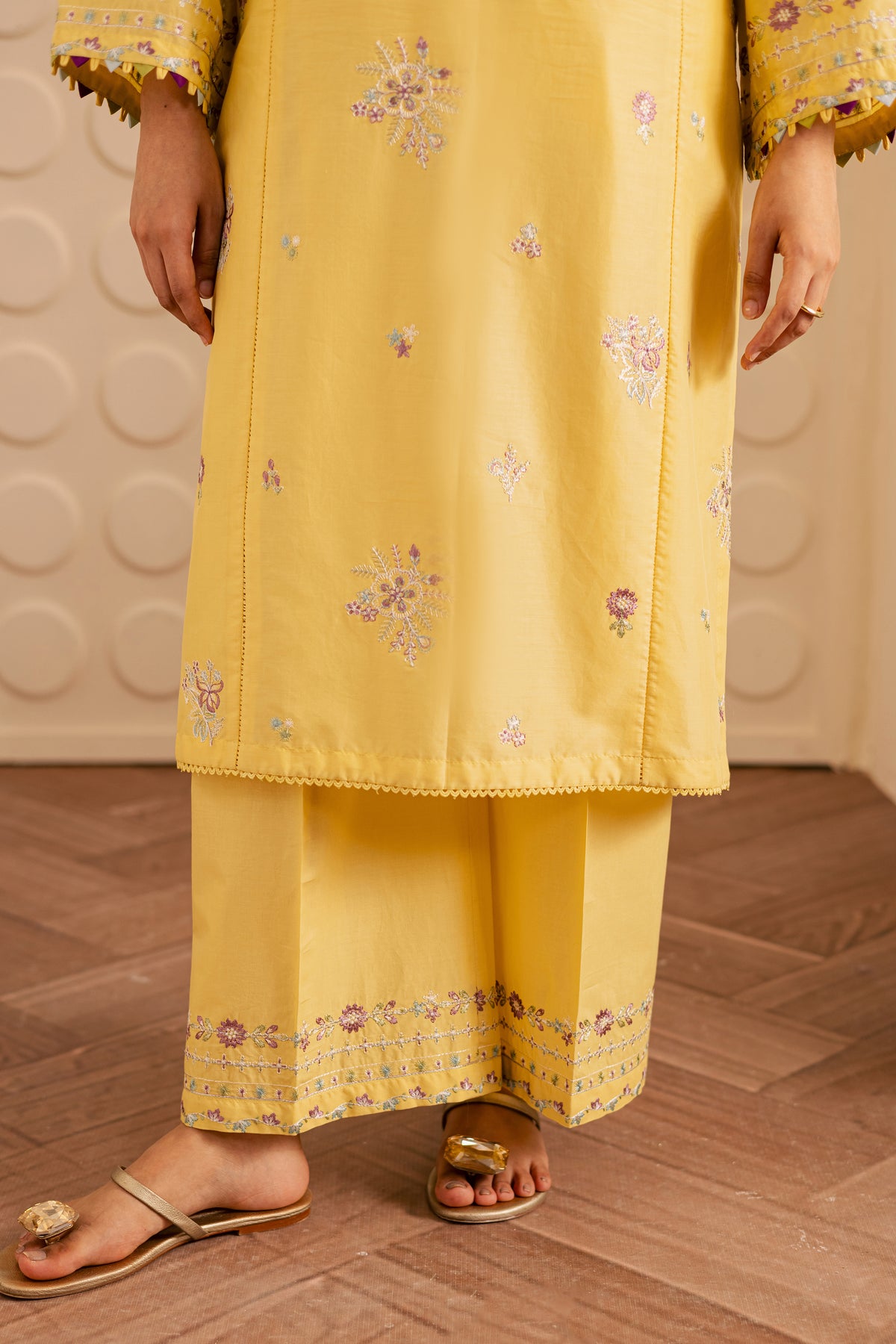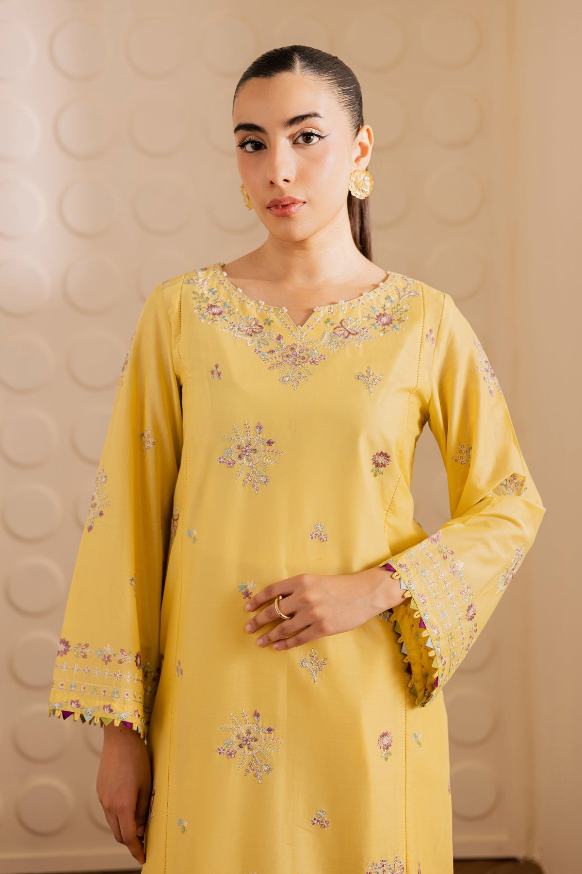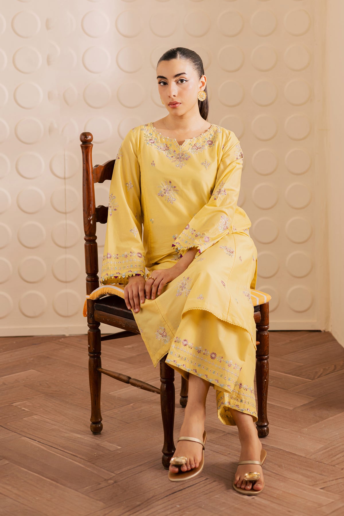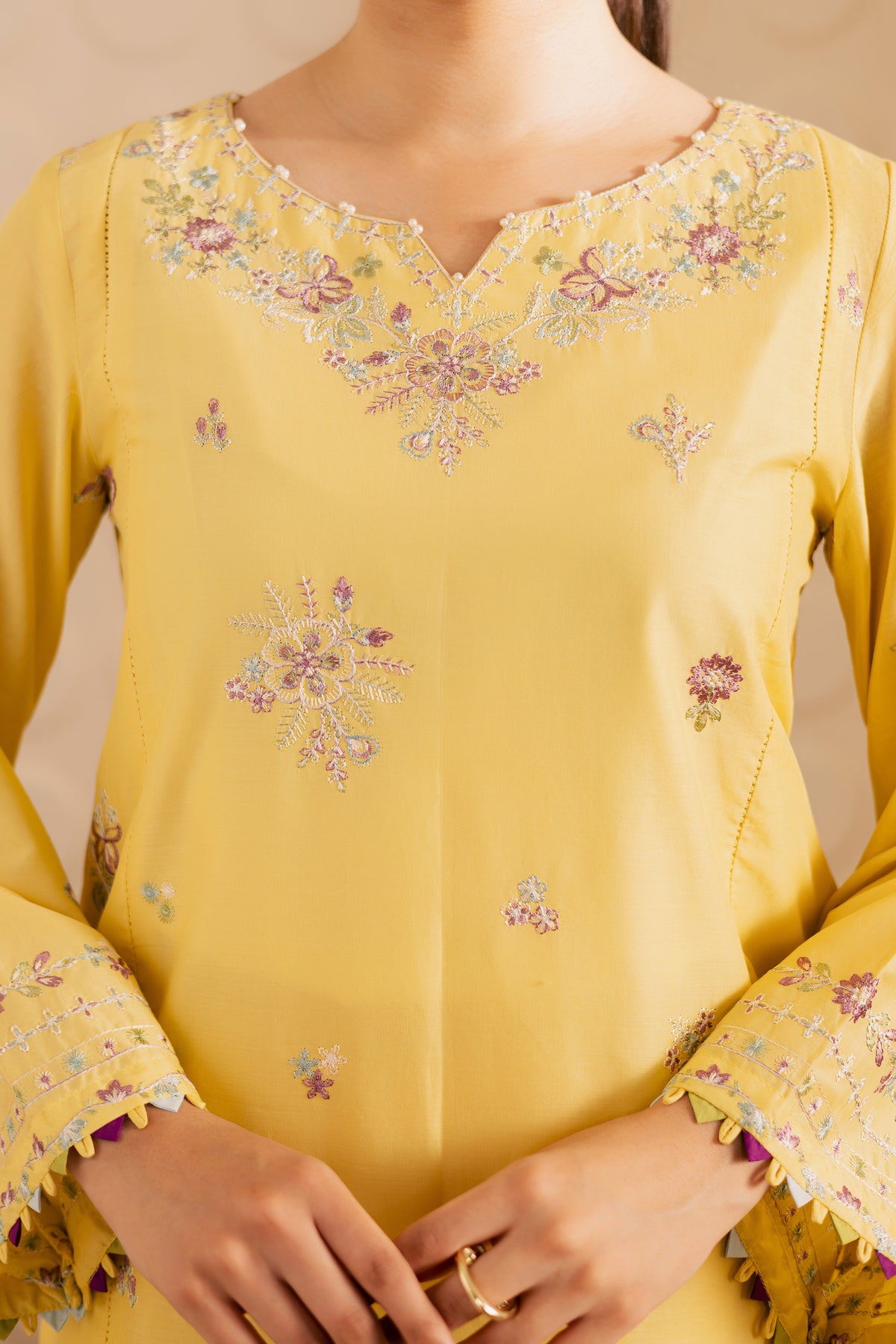 A beautifully detailed light yellow pima lawn shirt featuring a fully embroidered front and a matching embroidered neckline, complemented by embroidered sleeve borders that add a touch of elegance and finesse.