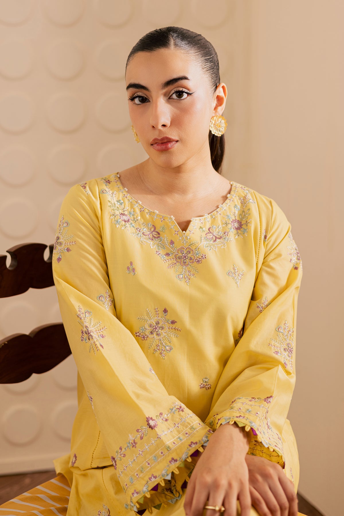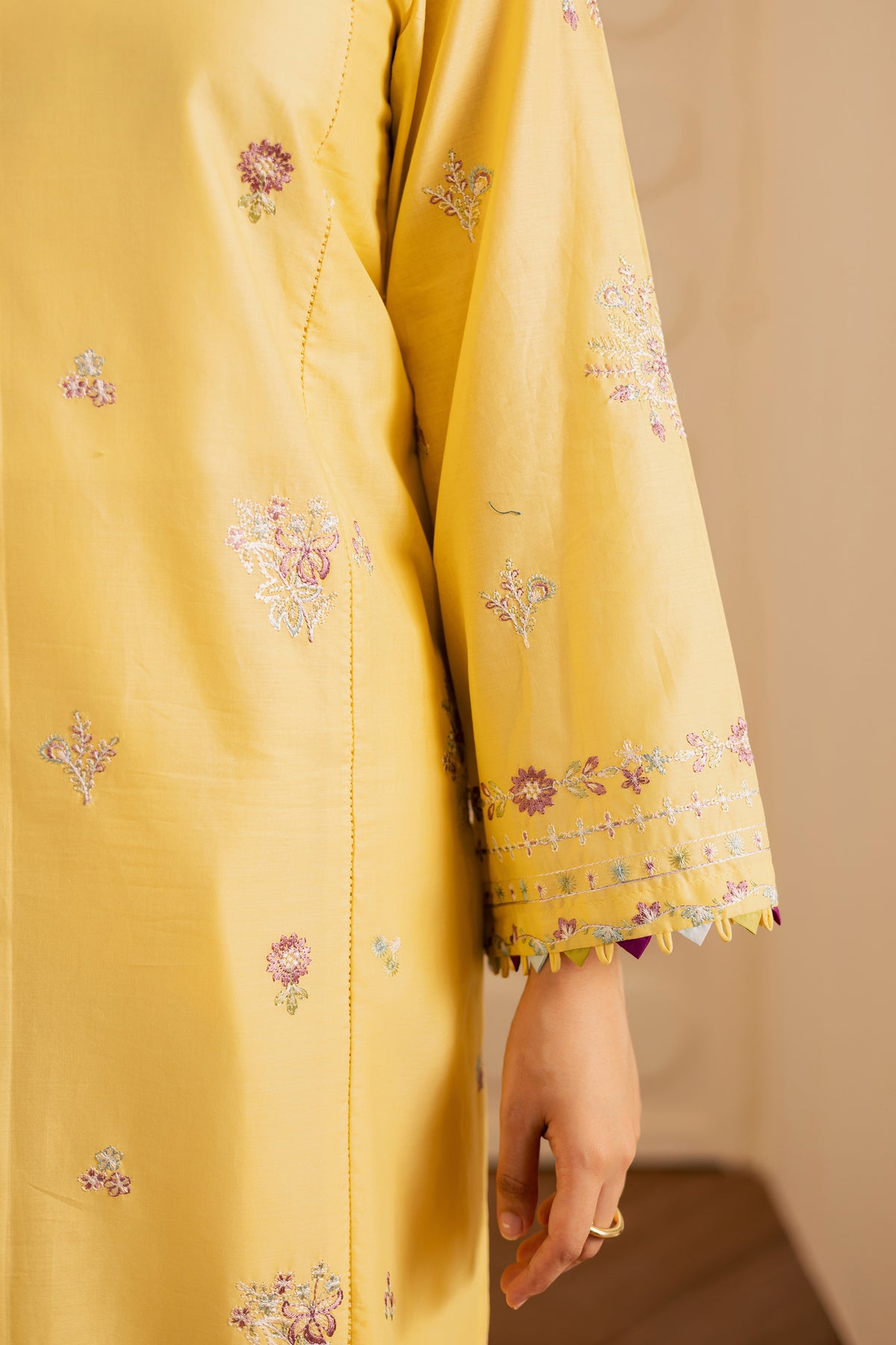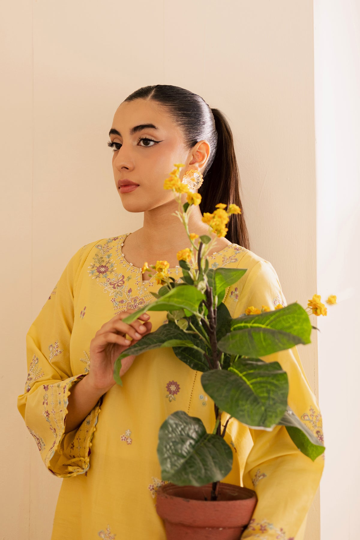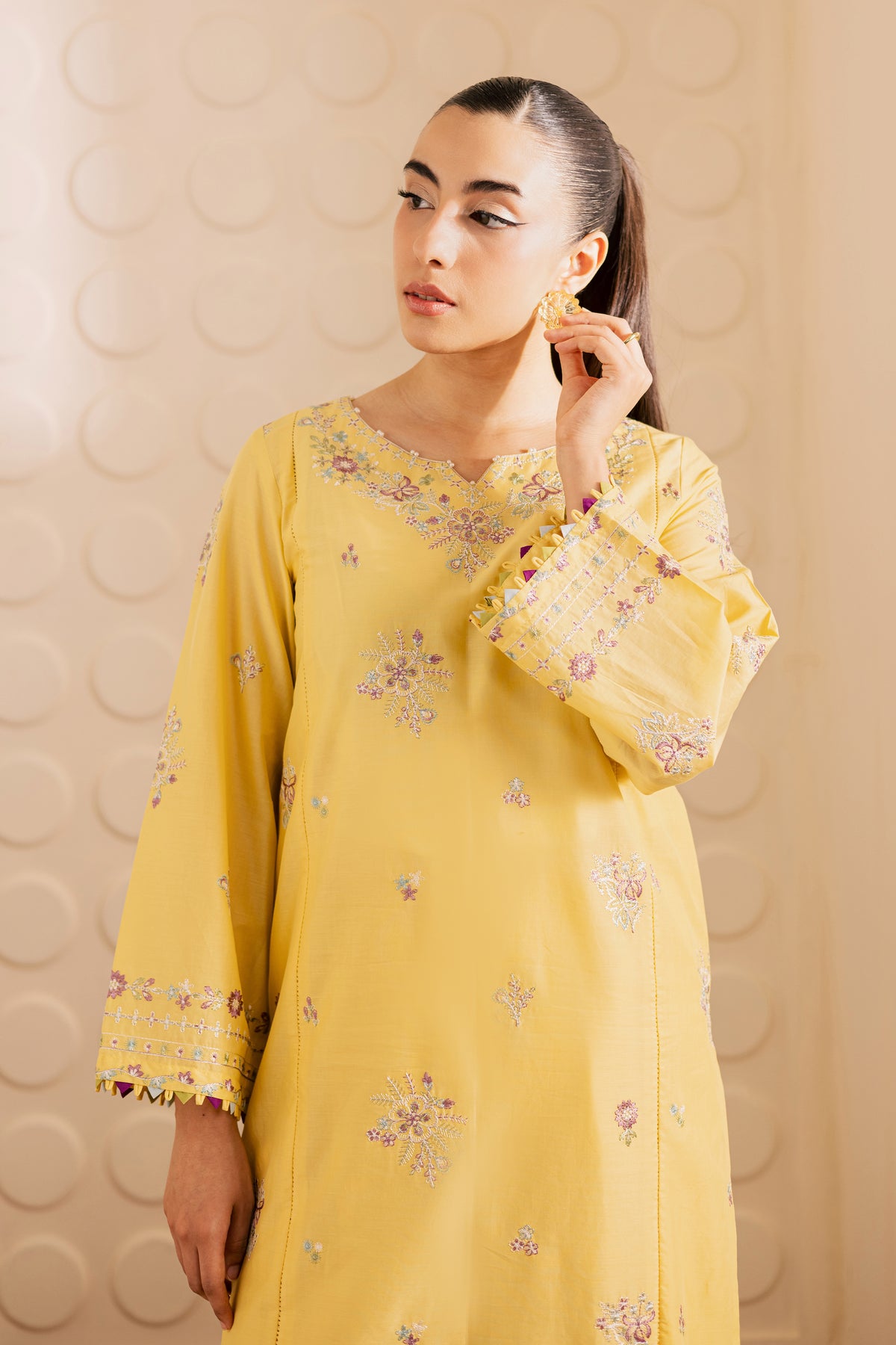 A beautifully detailed light yellow pima lawn shirt featuring a fully embroidered front and a matching embroidered neckline, complemented by embroidered sleeve borders that add a touch of elegance and finesse.