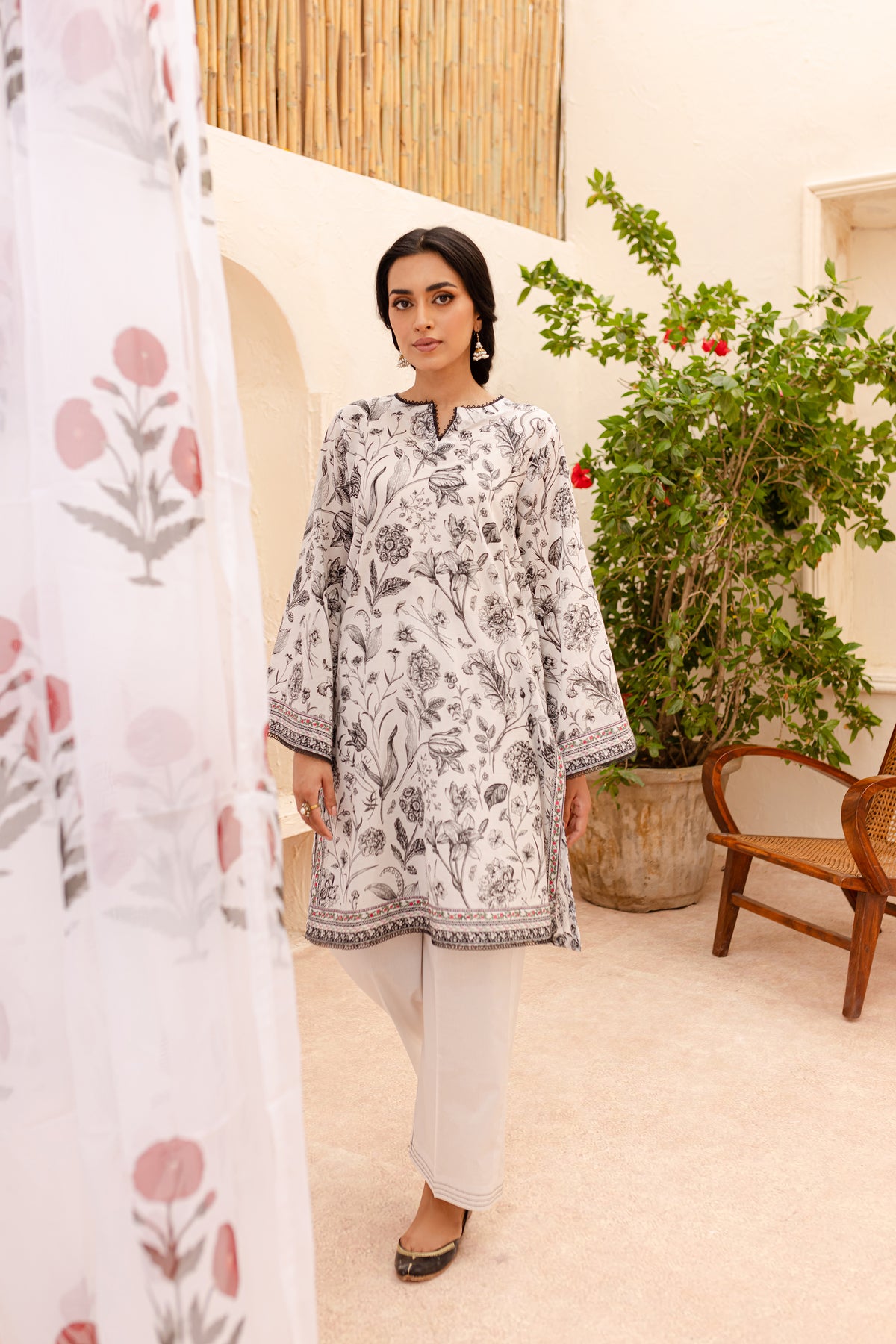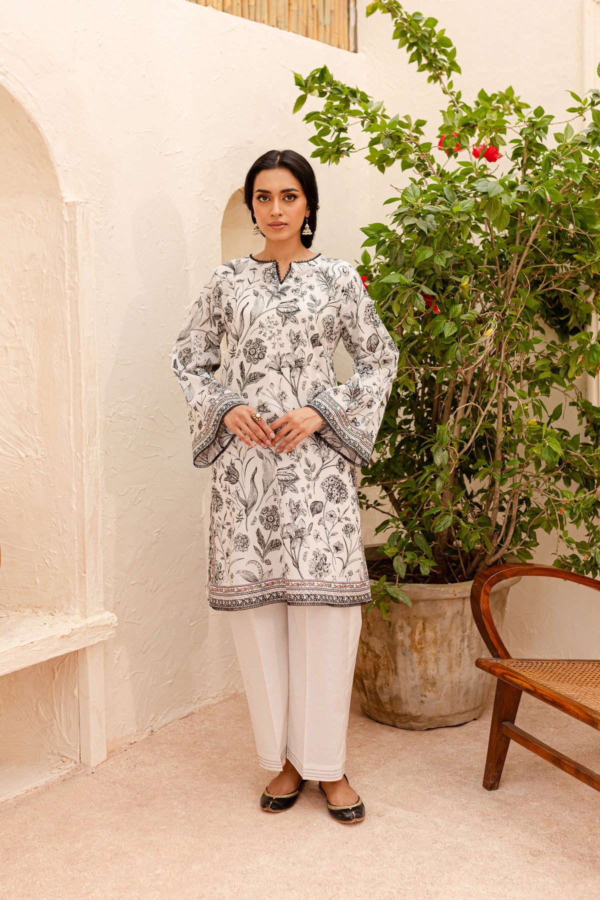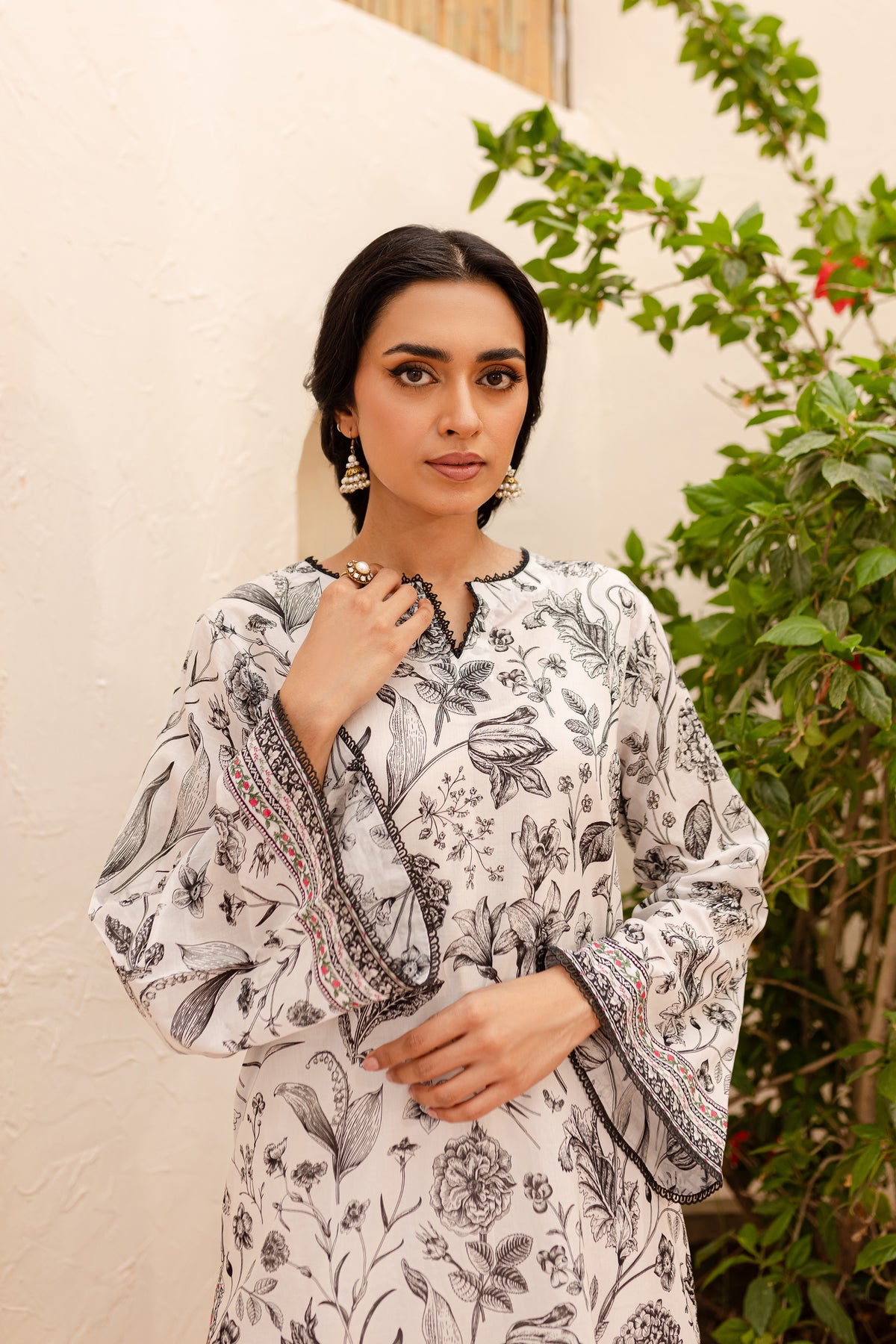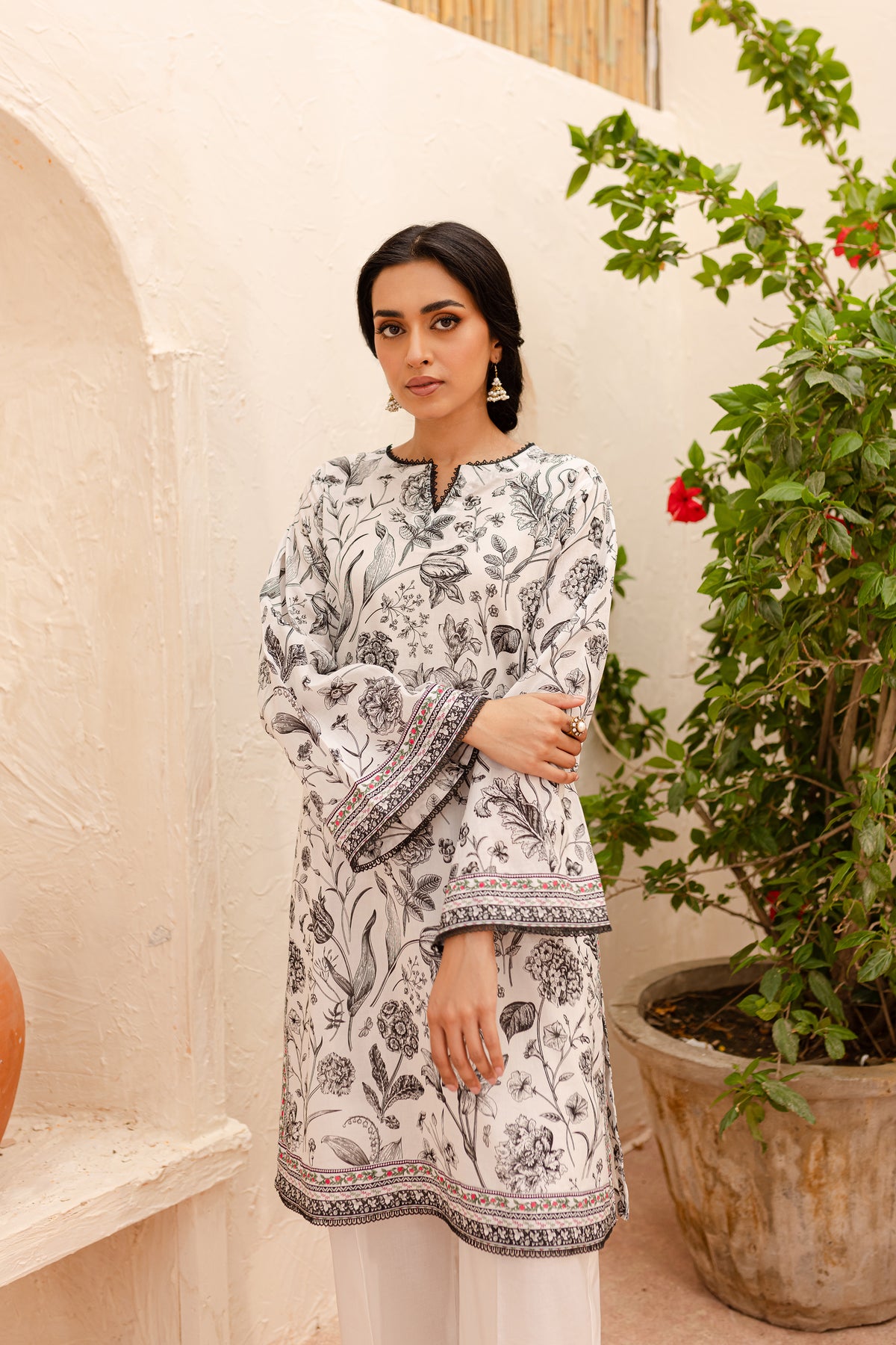 Experience an unparalleled comfort with our finely woven Pima lawn in the tones of off white. Beautifully printed short length paneled shirt features a v-cut neckline finished with lace. Striking details withhold printed borders at hem and sleeves.