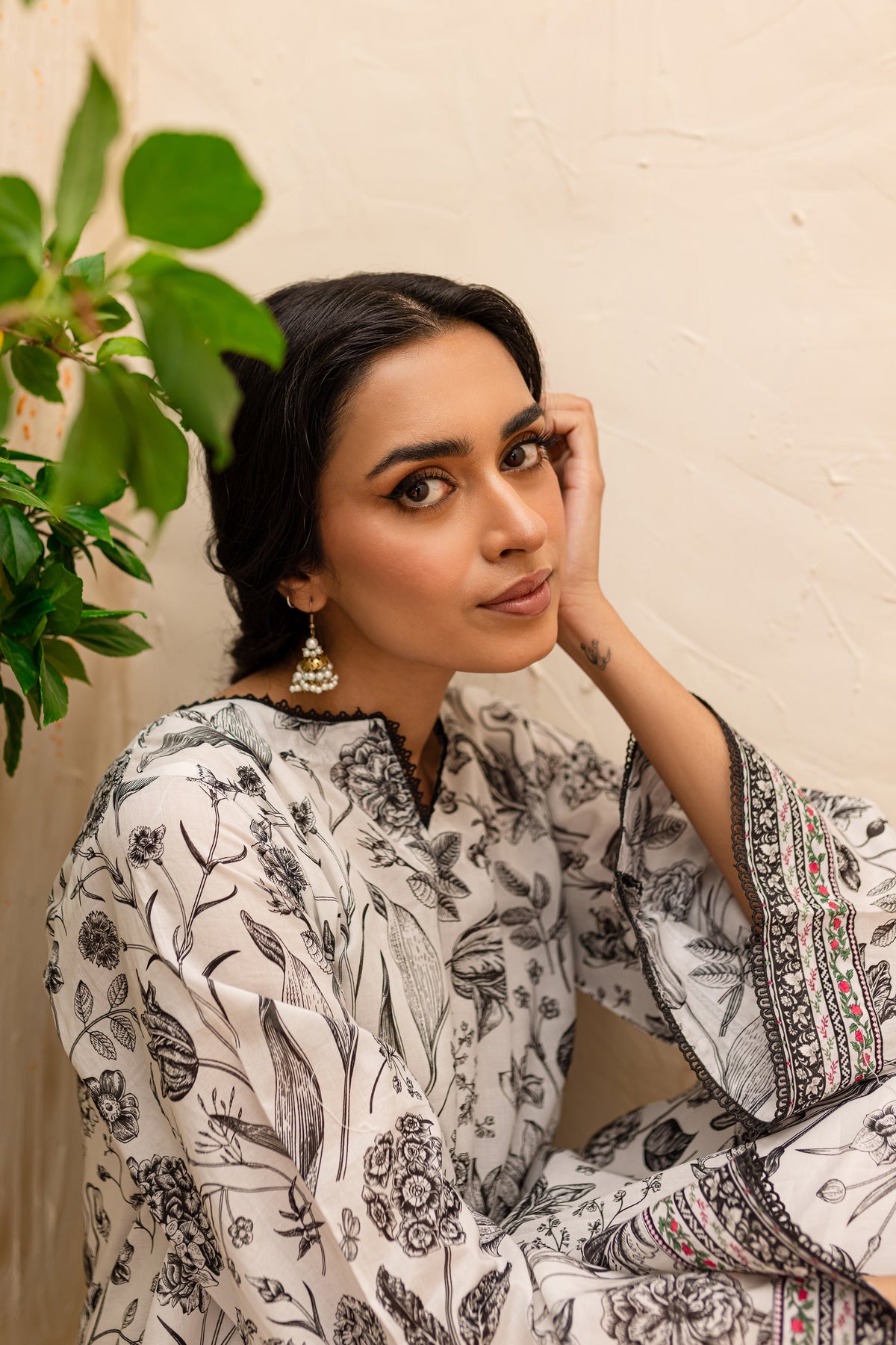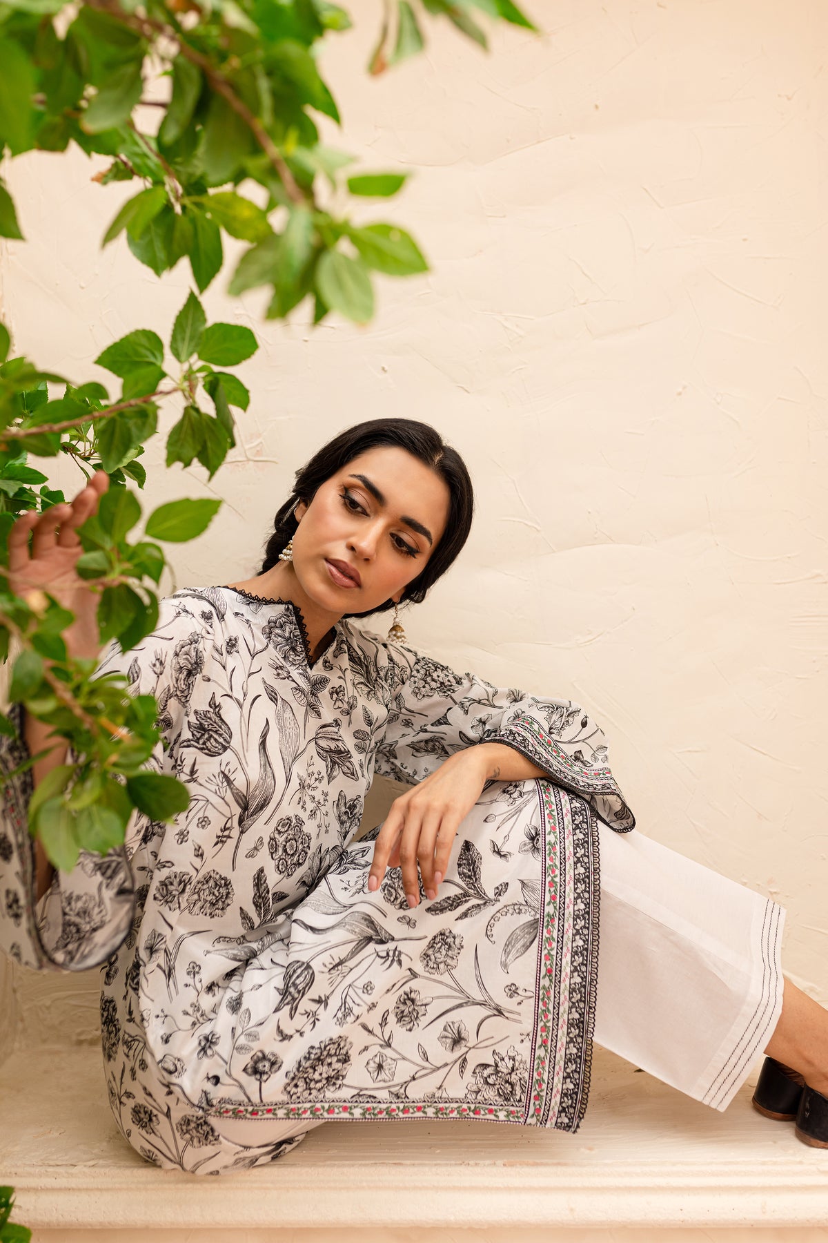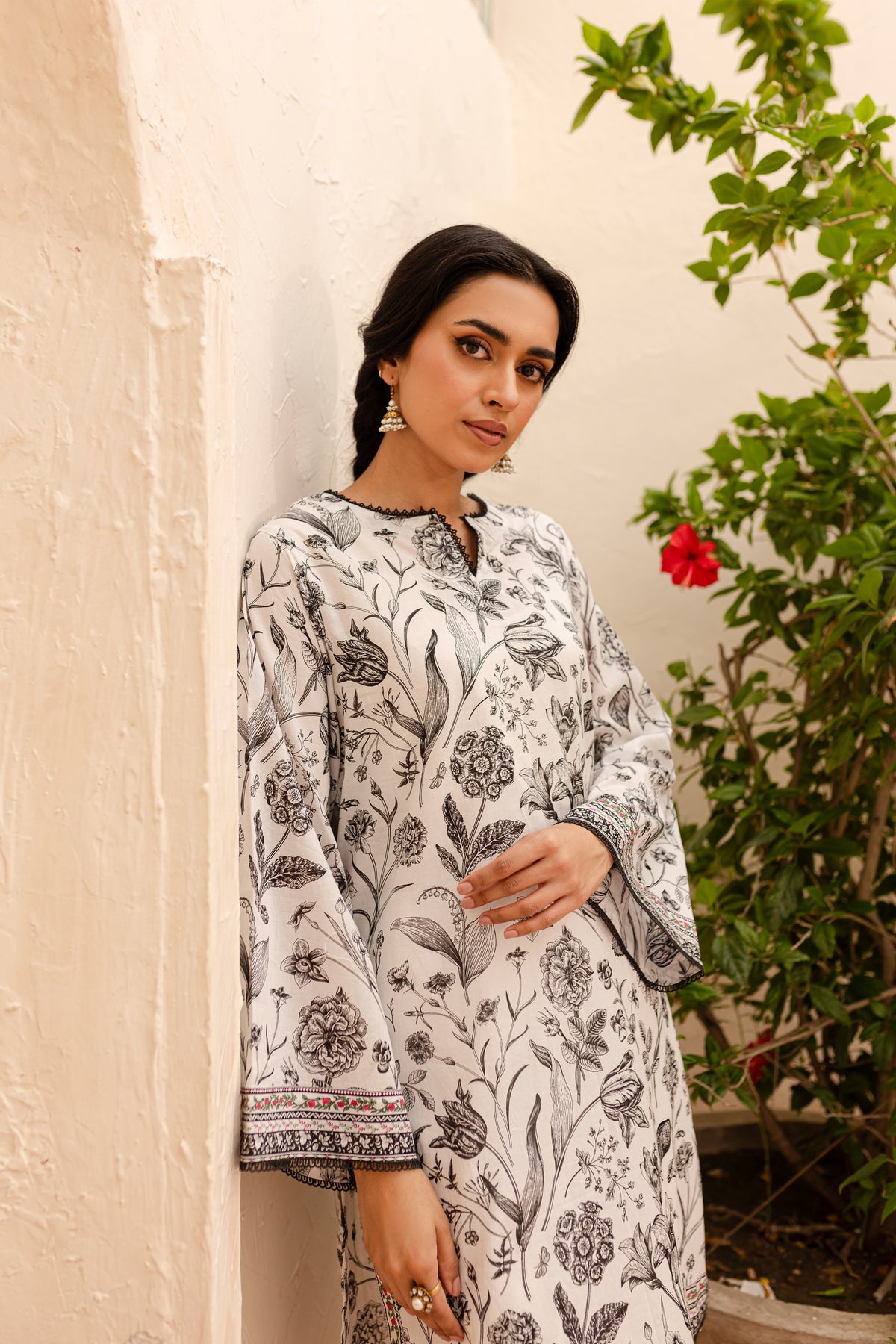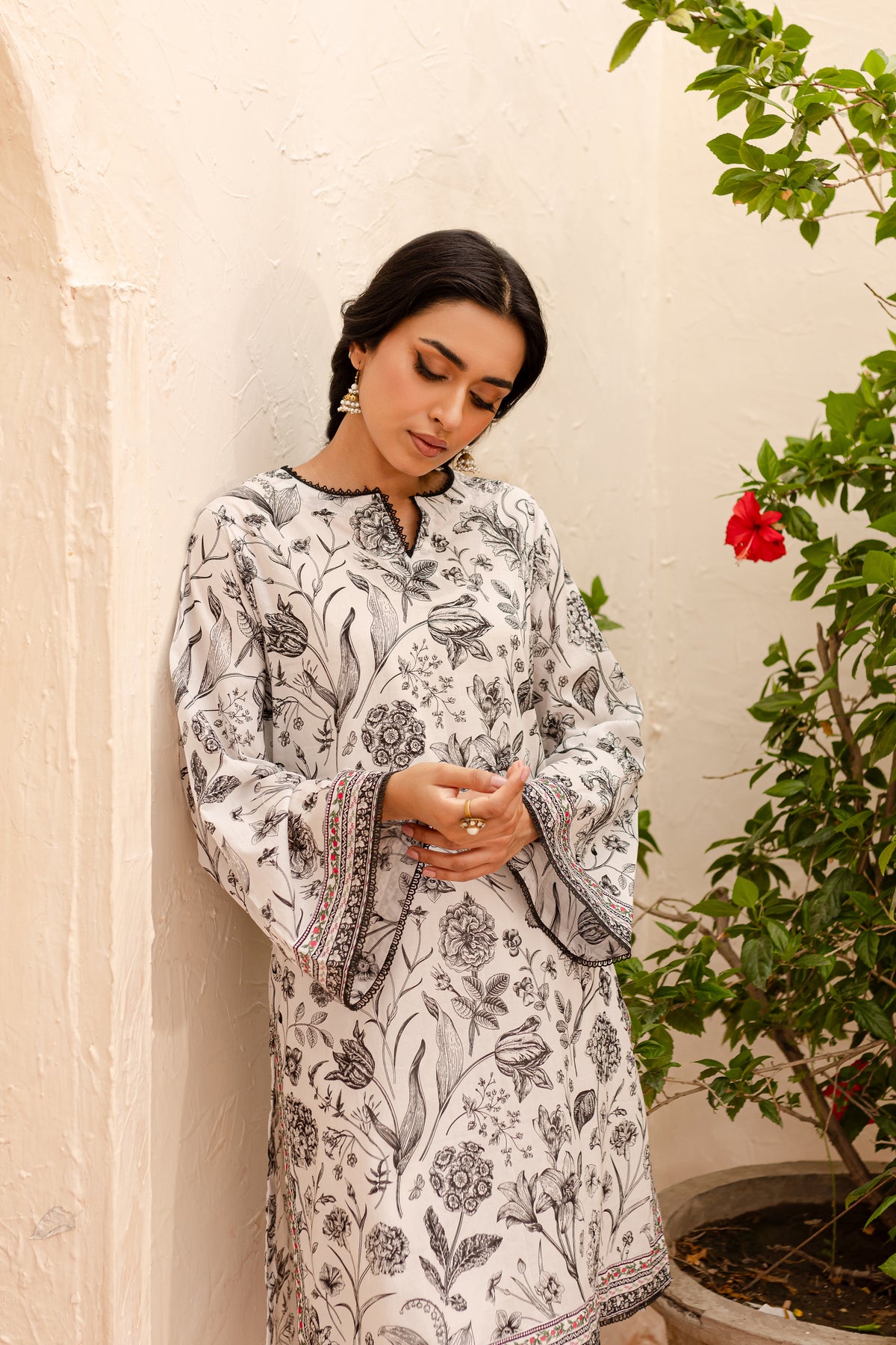 Experience an unparalleled comfort with our finely woven Pima lawn in the tones of off white. Beautifully printed short length paneled shirt features a v-cut neckline finished with lace. Striking details withhold printed borders at hem and sleeves.