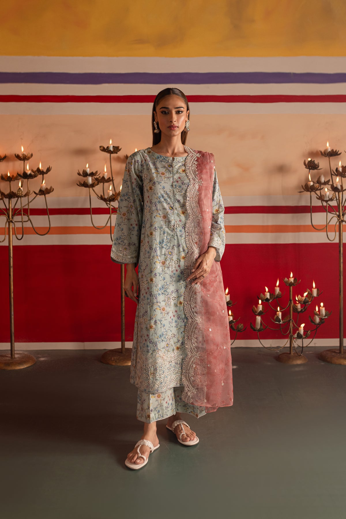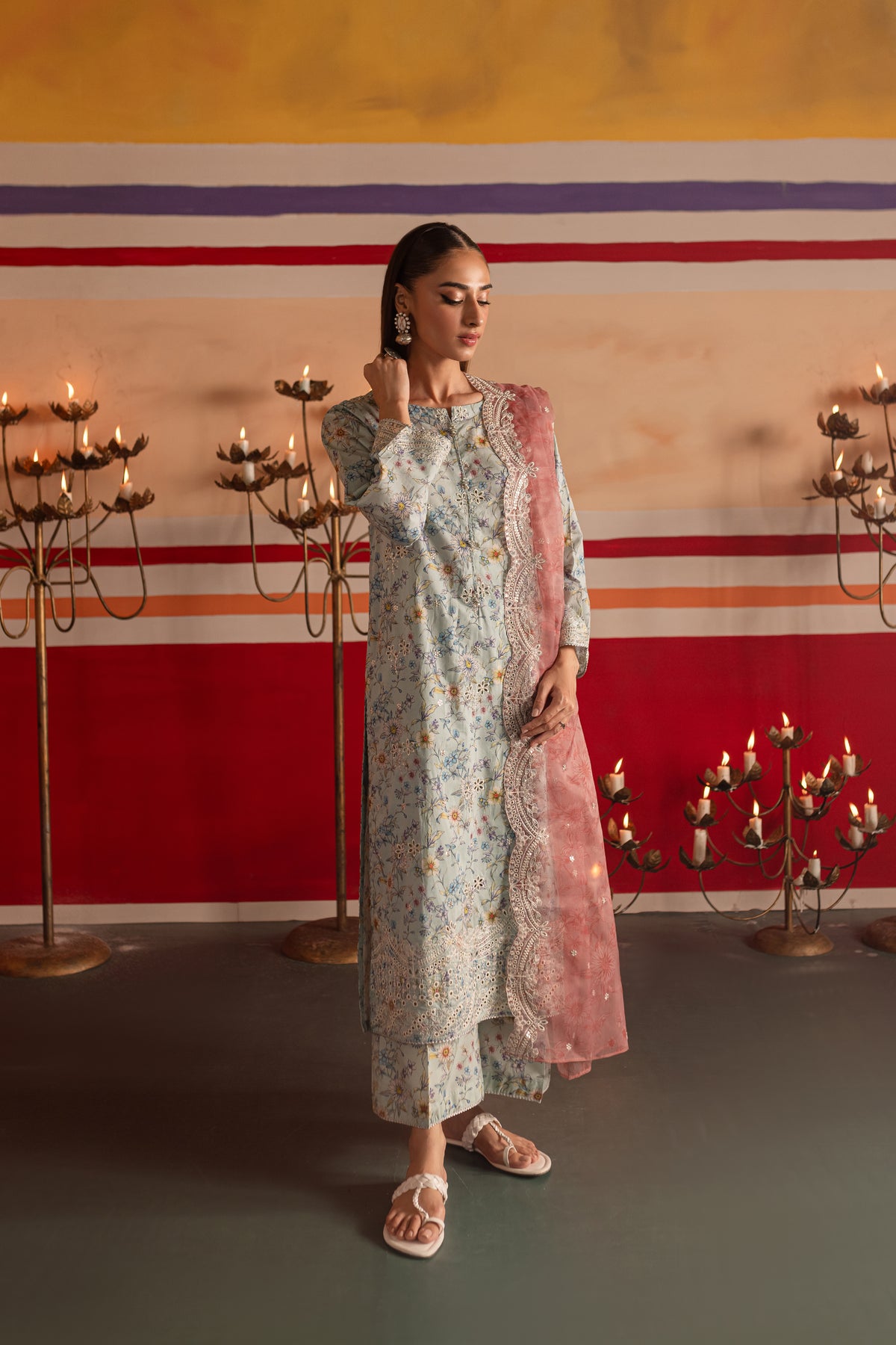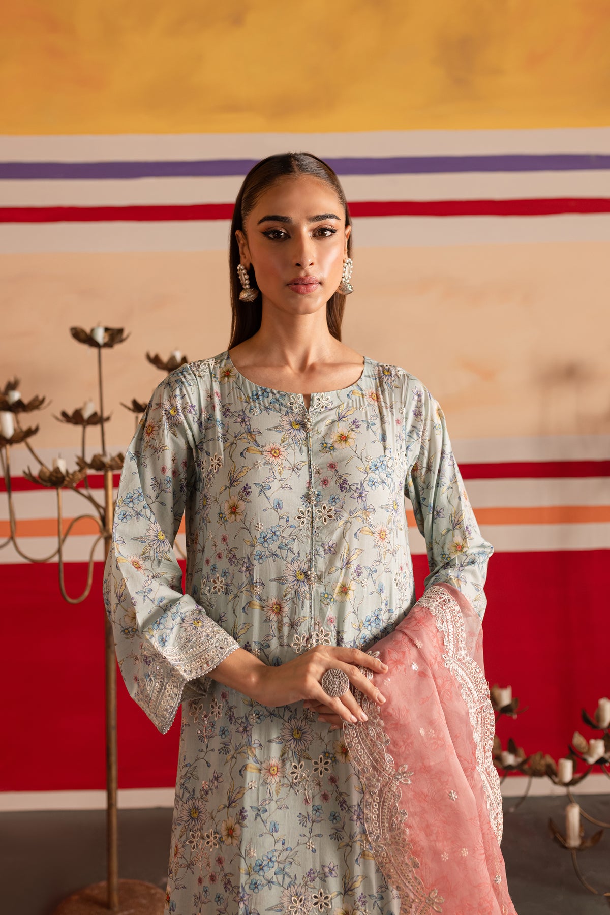 Elevate your wardrobe with this exquisite ensemble made from the luxurious Pima lawn in the beautiful shades of blue. Subtly printed shirt features a striking display of schiffli embroidery on the front adorned with delicate material collage at neckline. The sleeves are elegantly finished with schiffli embroidered borders scalloped at hem, adding a touch of sophistication and texture to the overall look.