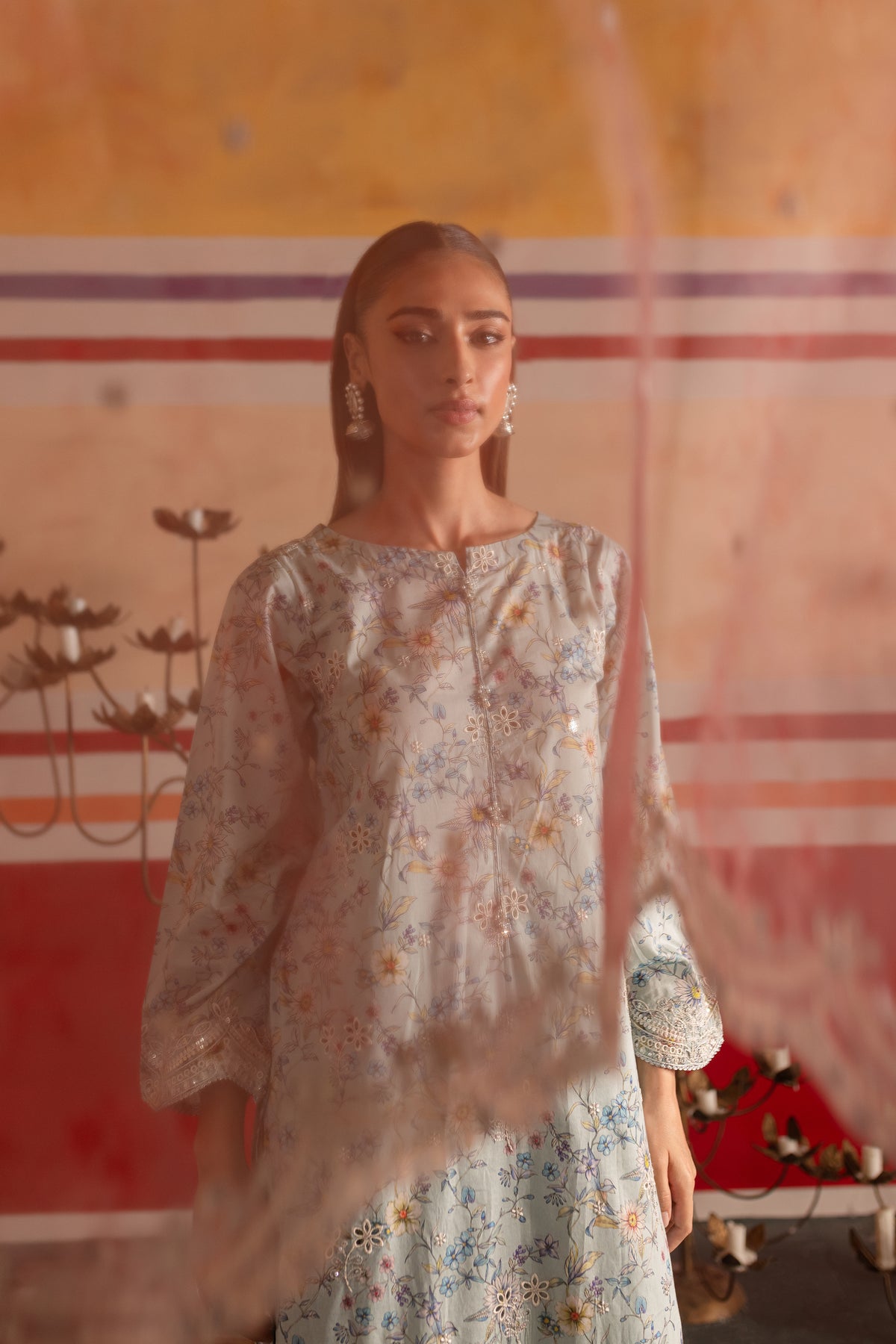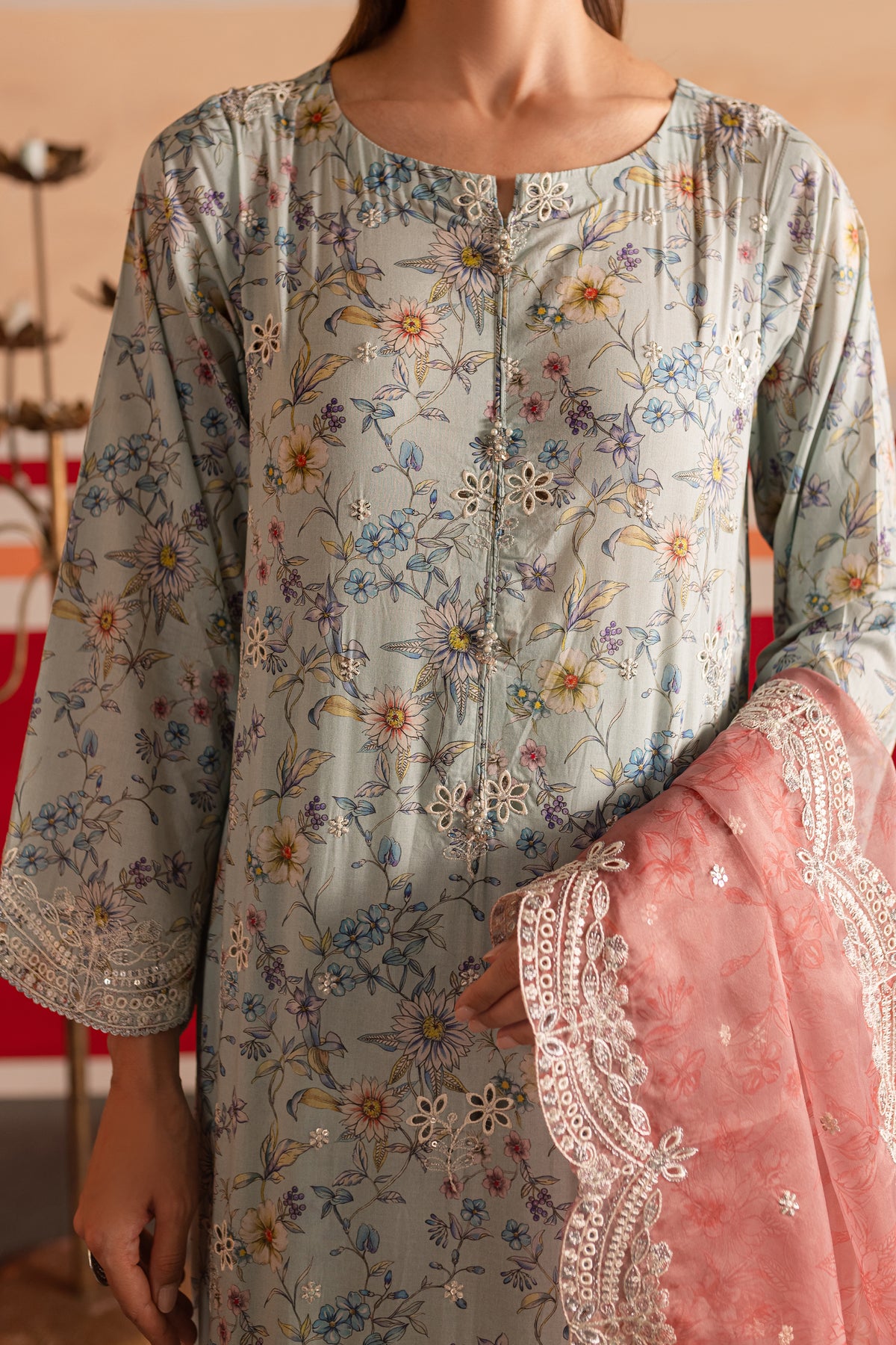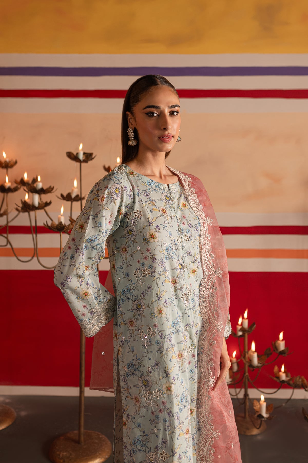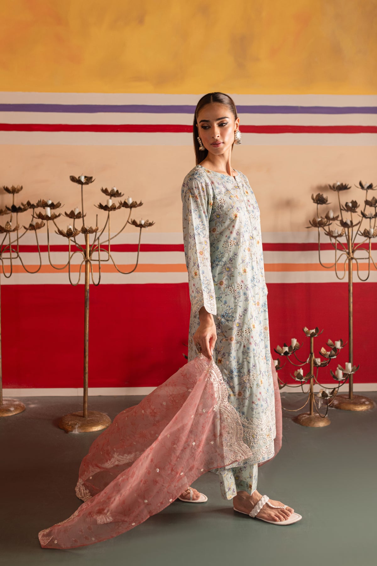 Elevate your wardrobe with this exquisite ensemble made from the luxurious Pima lawn in the beautiful shades of blue. Subtly printed shirt features a striking display of schiffli embroidery on the front adorned with delicate material collage at neckline. The sleeves are elegantly finished with schiffli embroidered borders scalloped at hem, adding a touch of sophistication and texture to the overall look.