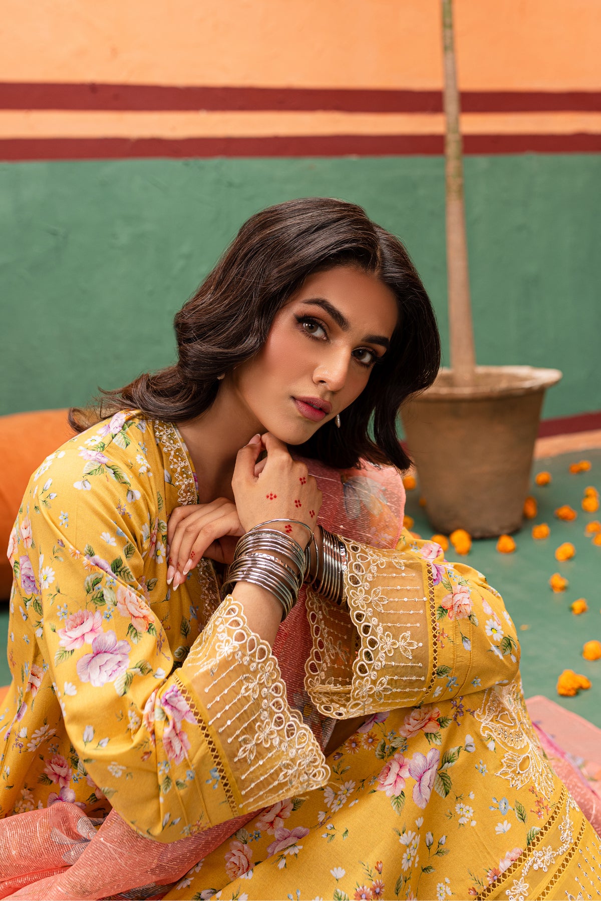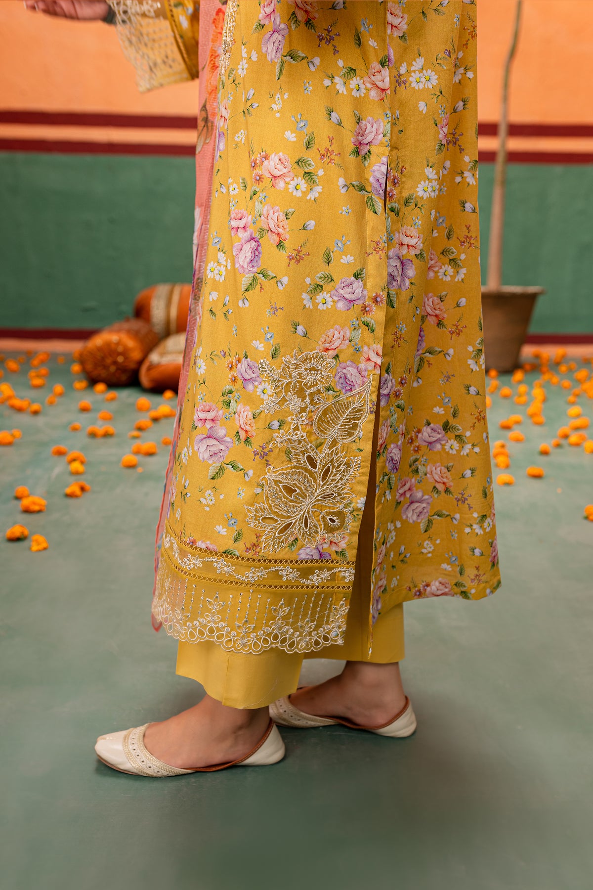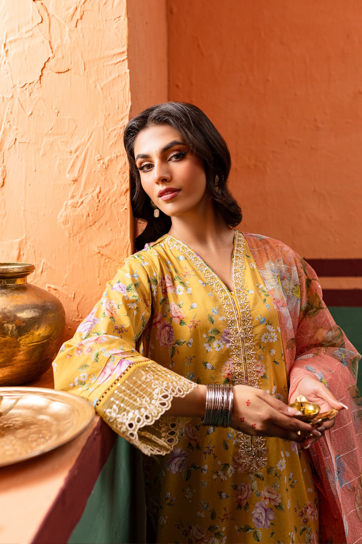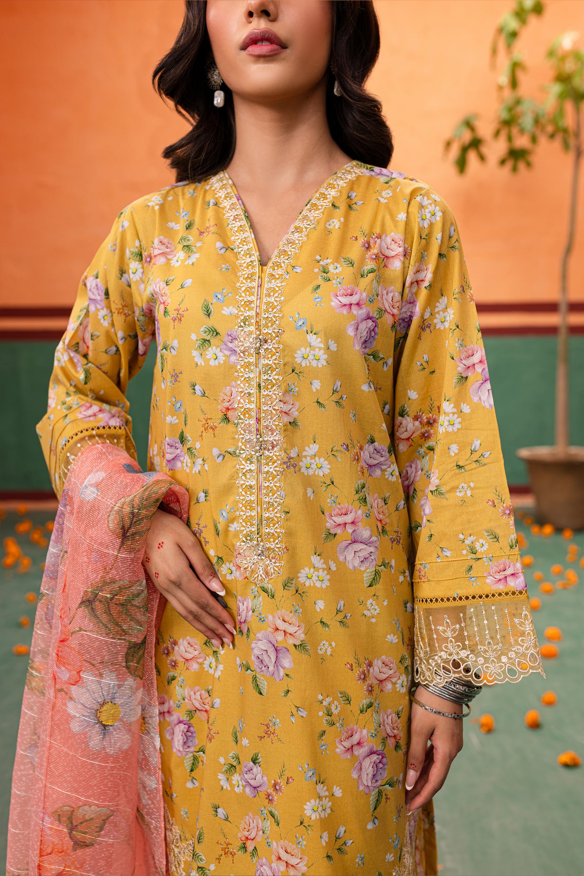 Celebrate this season in style with our printed fit made from the finest quality Pima lawn in the shades of yellow, featuring timeless patterns. Finely printed long length shirt features schiffli embroidered patches at hem and sleeves with intricate embroidery at neckline.