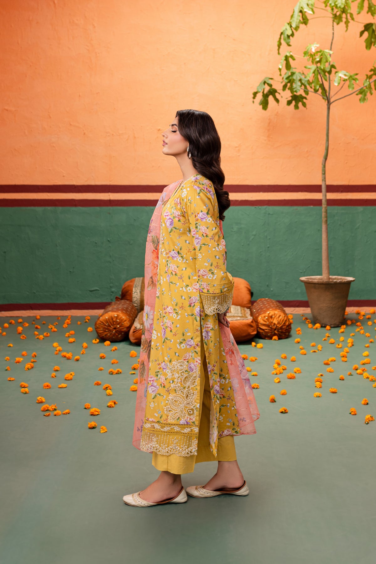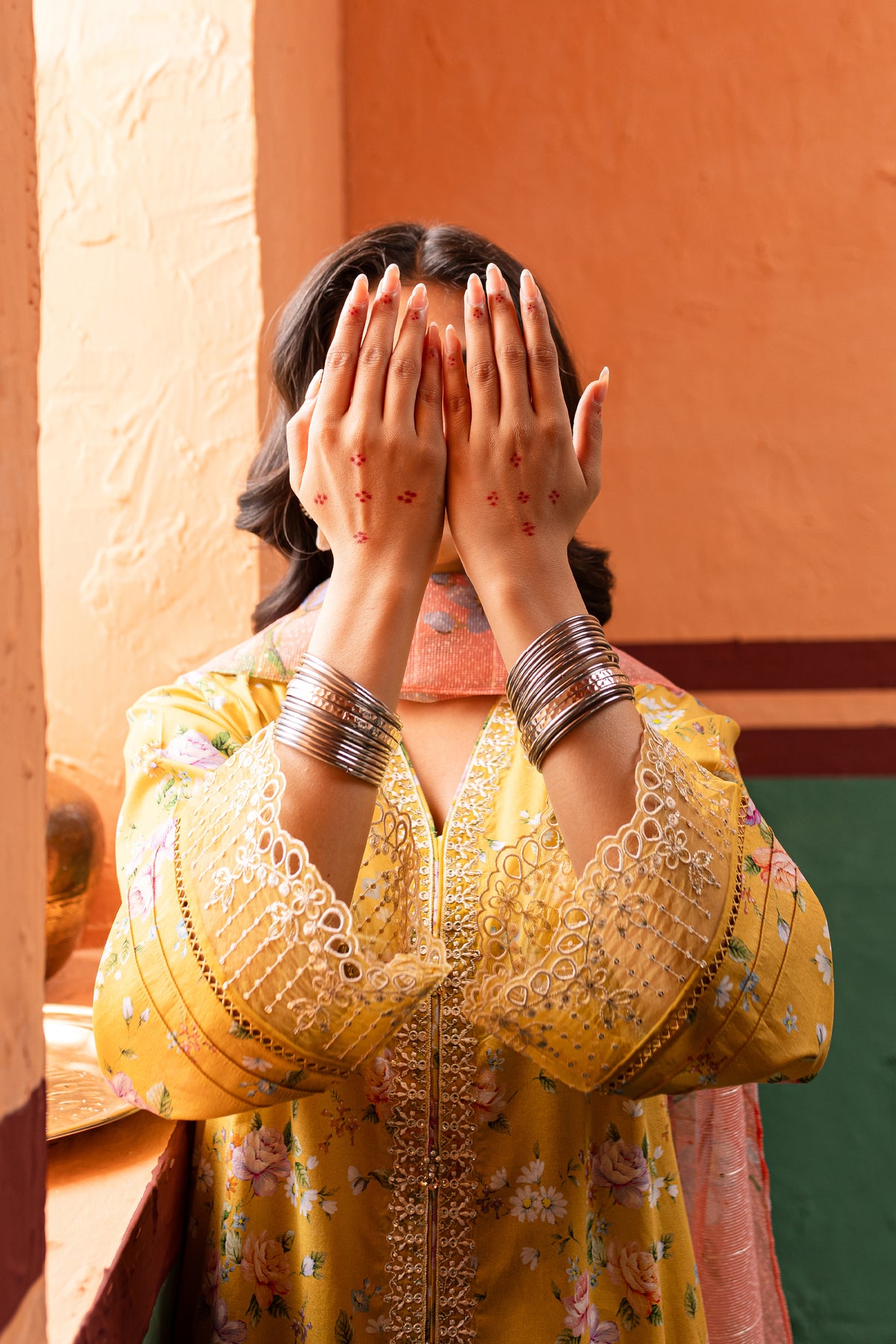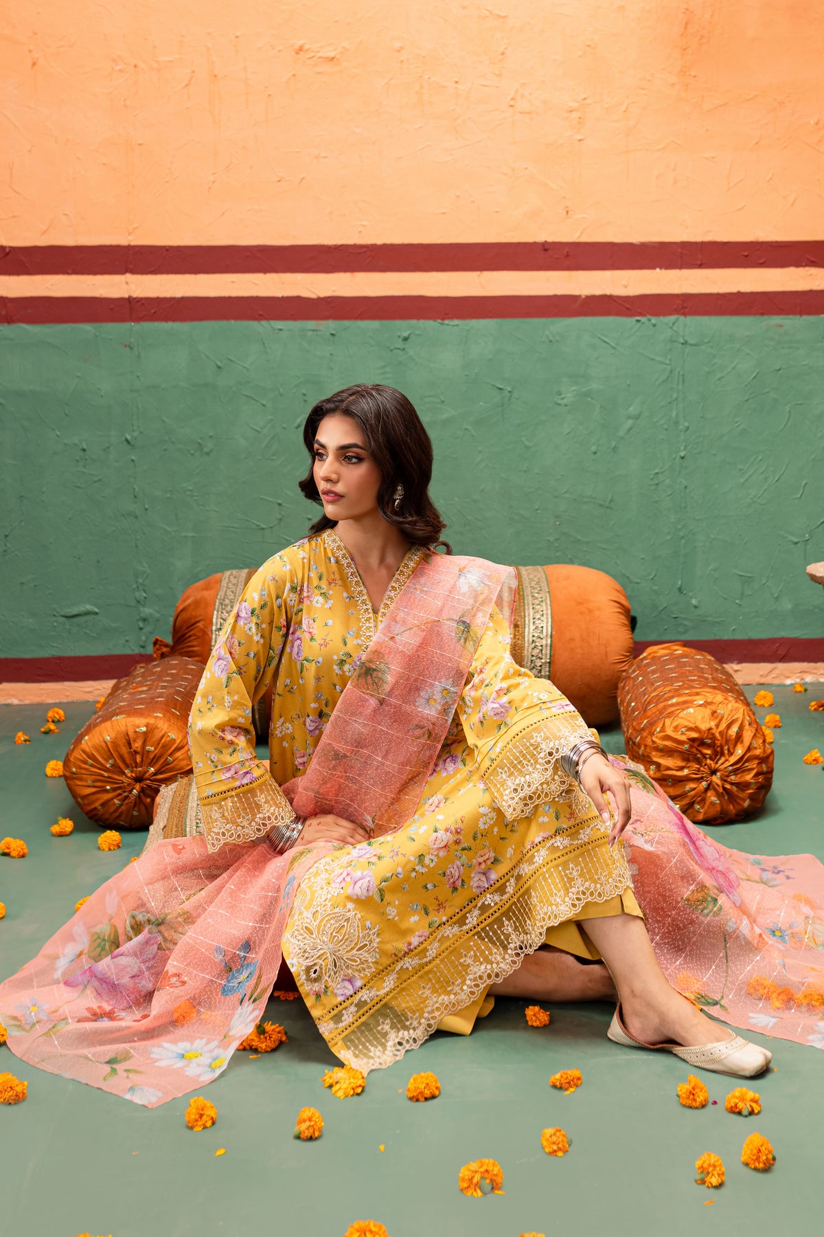 Celebrate this season in style with our printed fit made from the finest quality Pima lawn in the shades of yellow, featuring timeless patterns. Finely printed long length shirt features schiffli embroidered patches at hem and sleeves with intricate embroidery at neckline.
