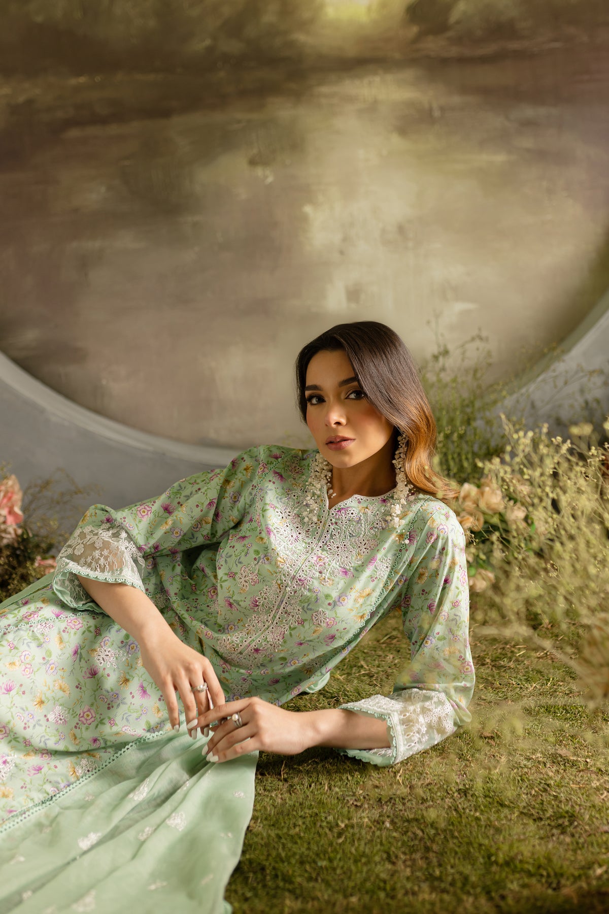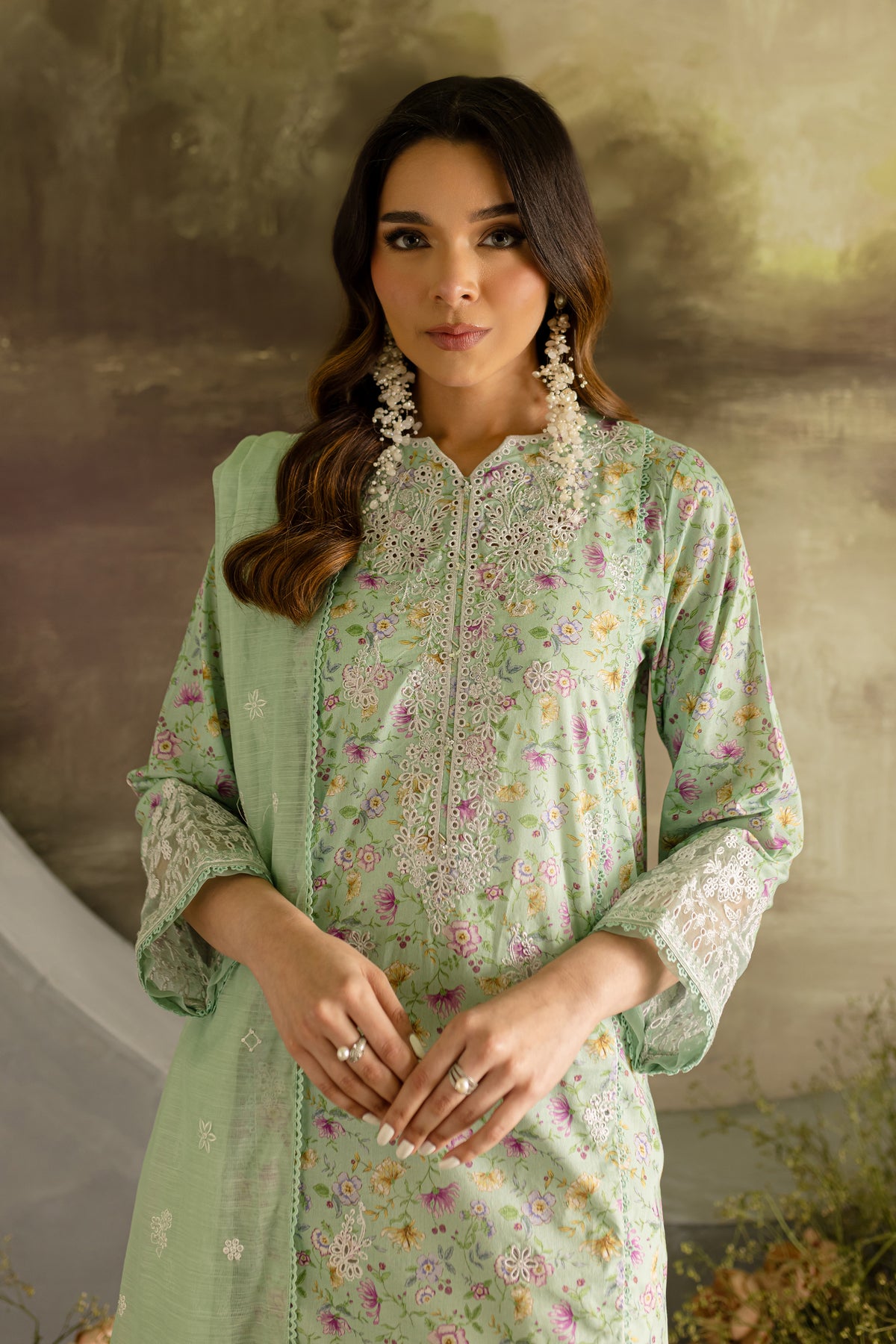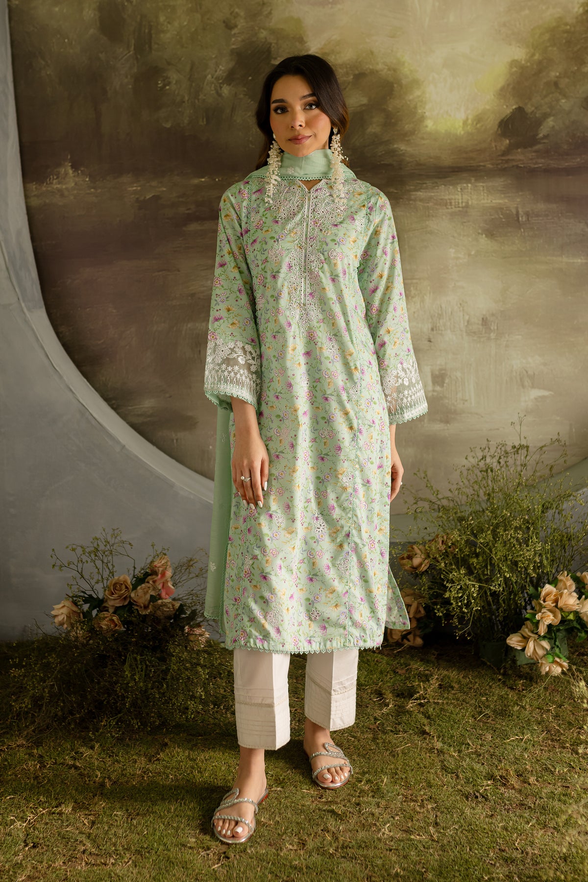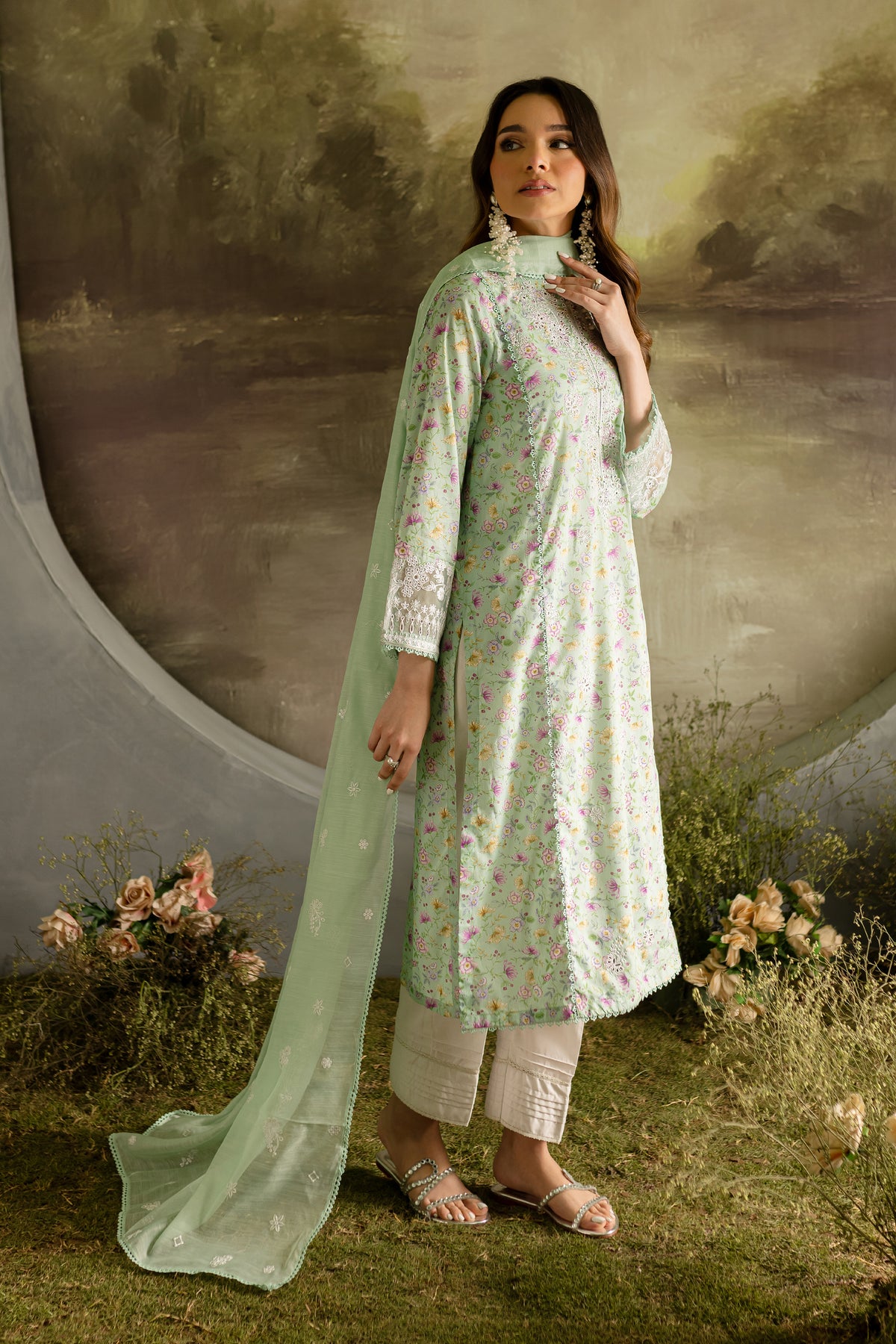 The sea green lawn shirt features an exquisitely embroidered front and neckline, enhanced with delicate bow detailing.The shirt hem is finished with lace, adding a soft, elegant border that elevates the overall design.The organza embroidered patches at the sleeves are beautifully crafted and finished with lace.