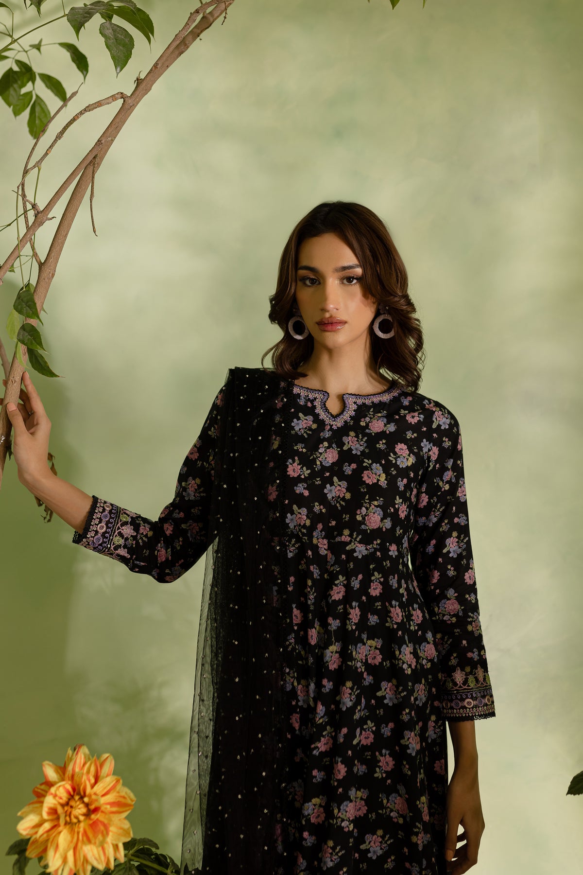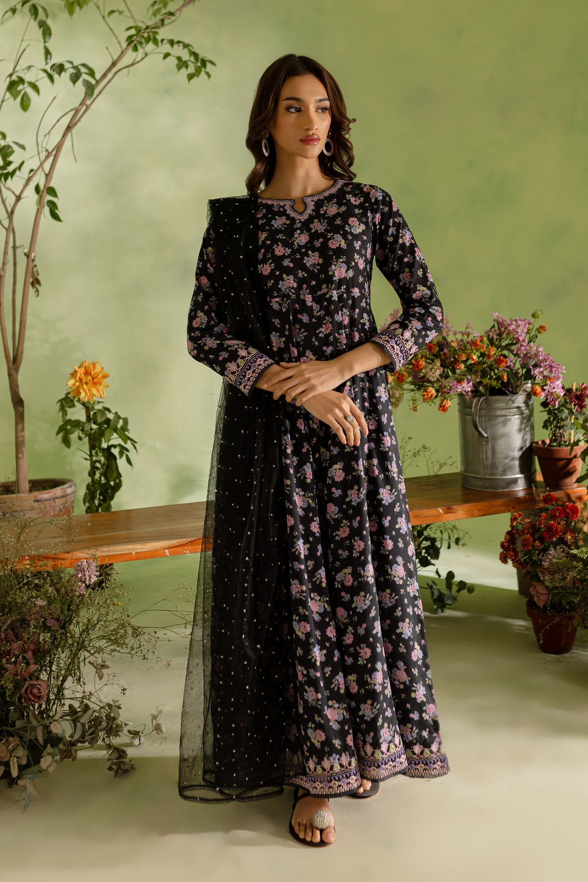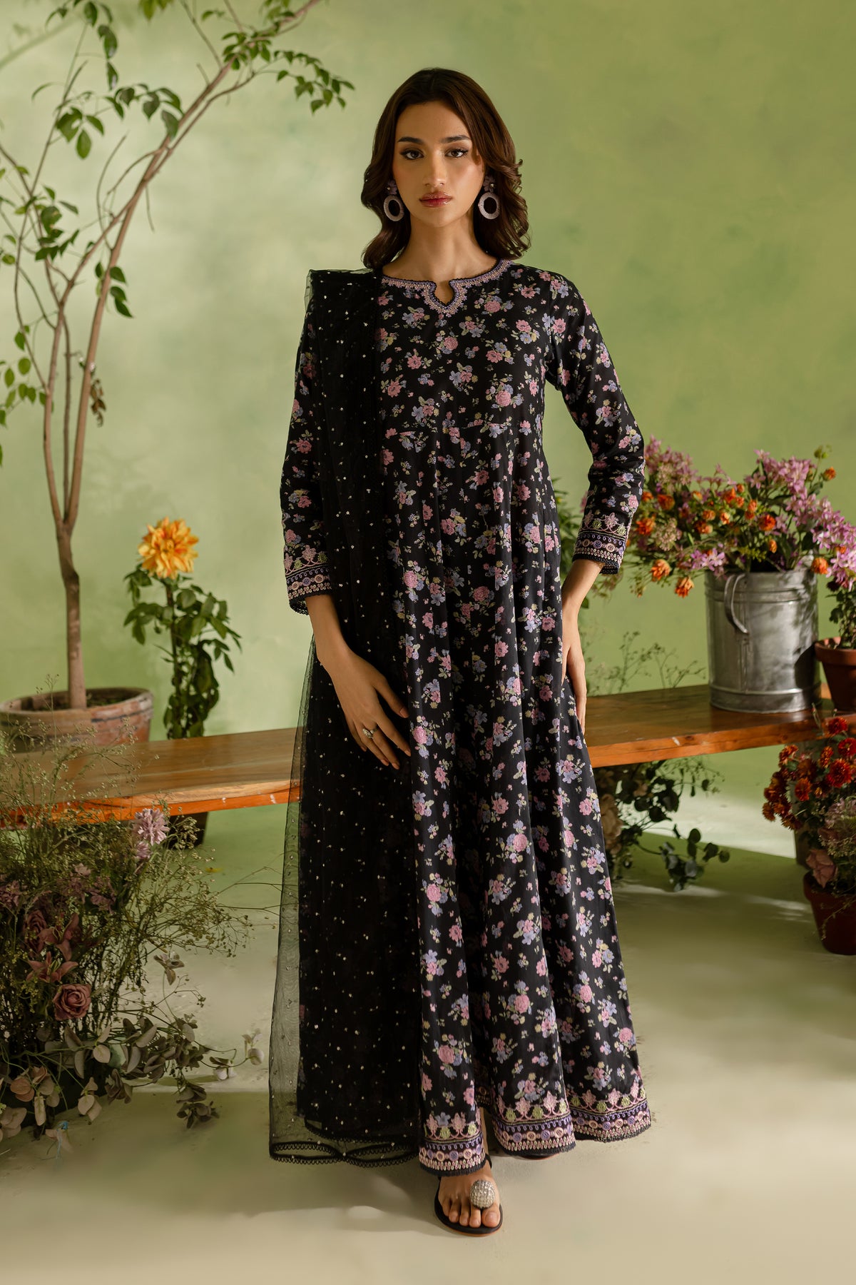 The black lawn frock features a striking digital printed panel design, with delicate embroidery accentuating the neckline and sleeves. The intricate embroidery adds a touch of elegance, making this frock both modern and timeless.