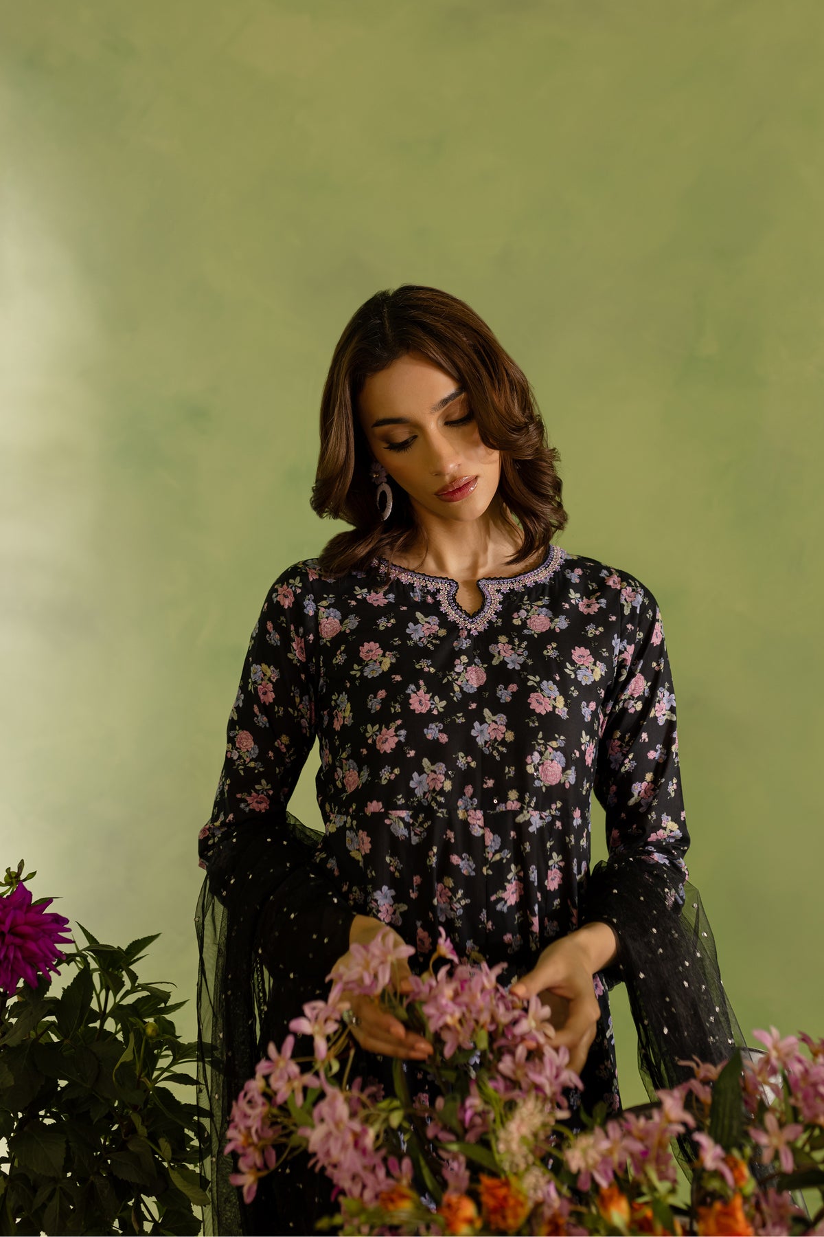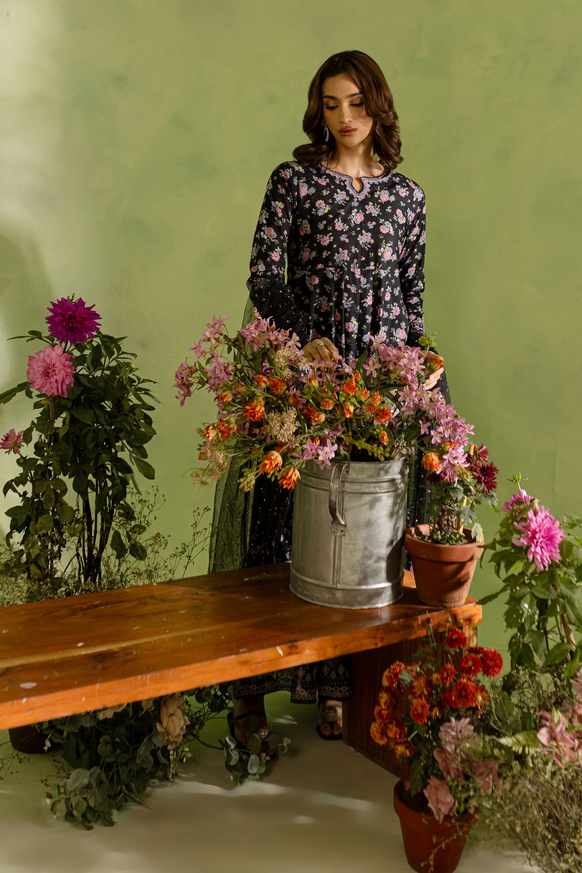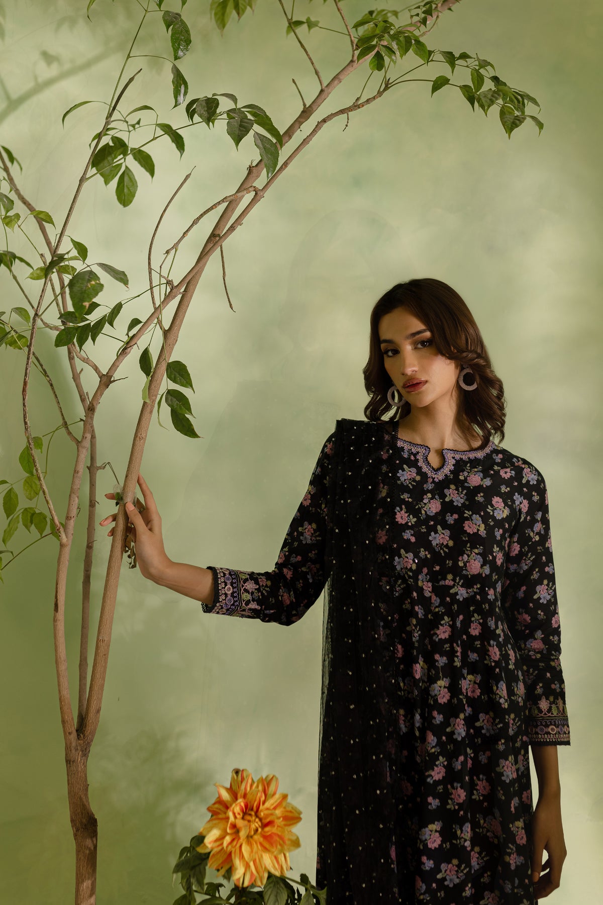 The black lawn frock features a striking digital printed panel design, with delicate embroidery accentuating the neckline and sleeves. The intricate embroidery adds a touch of elegance, making this frock both modern and timeless.
