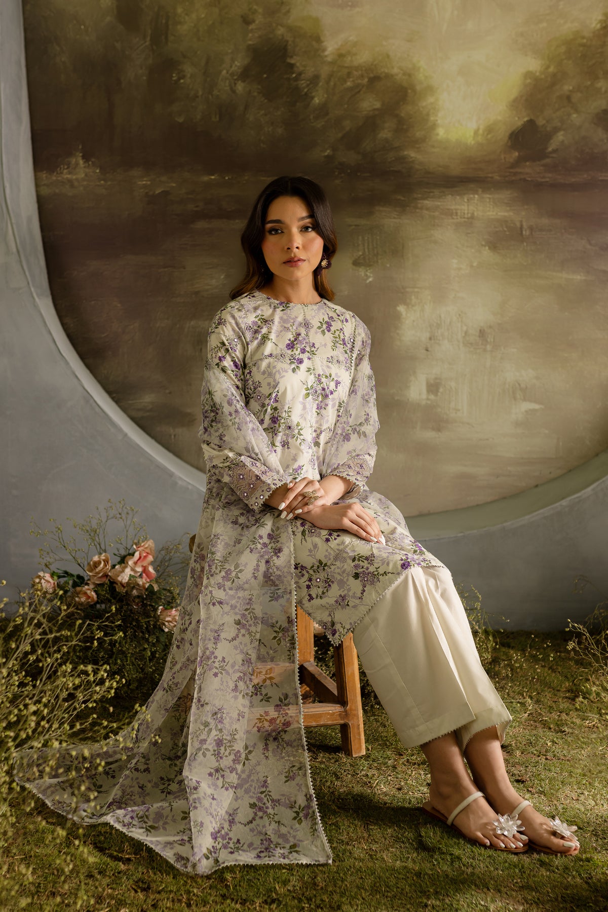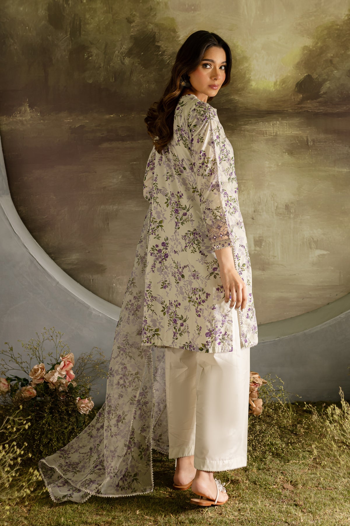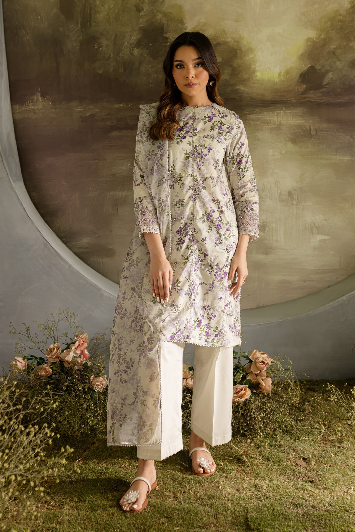 The off-white lawn shirt showcases intricate embroidery, with a complimentary print that adds dimension and visual interest. The craftsmanship of the embroidery highlights the richness of the design, making it perfect for special occasions.