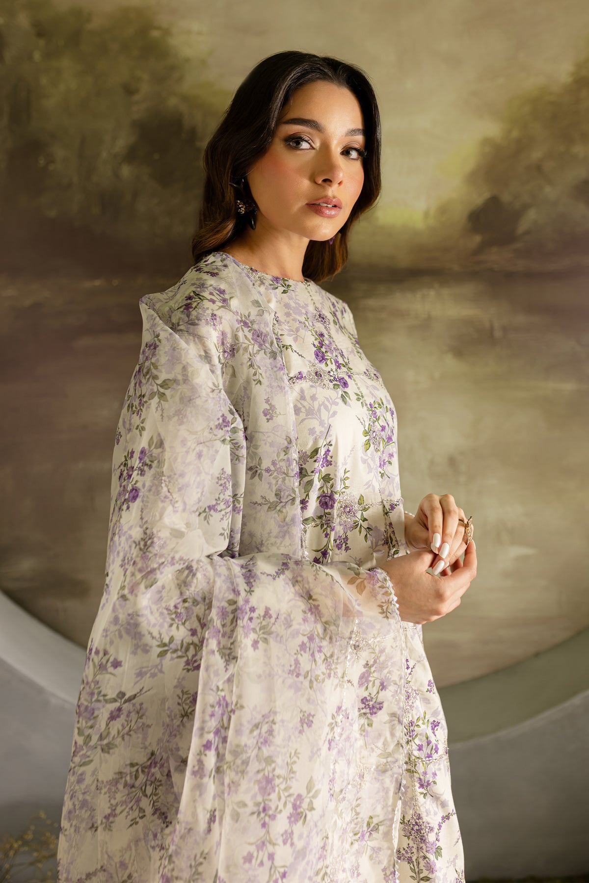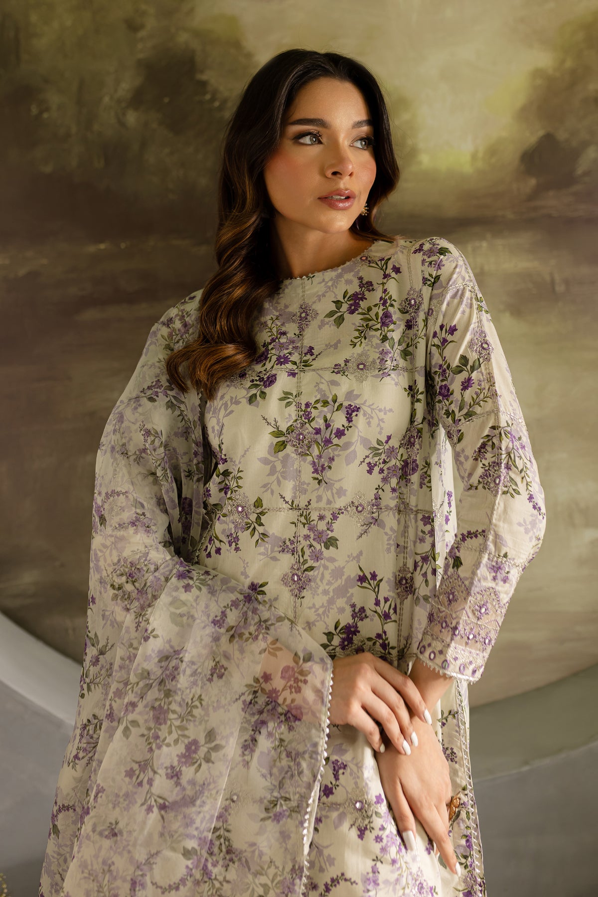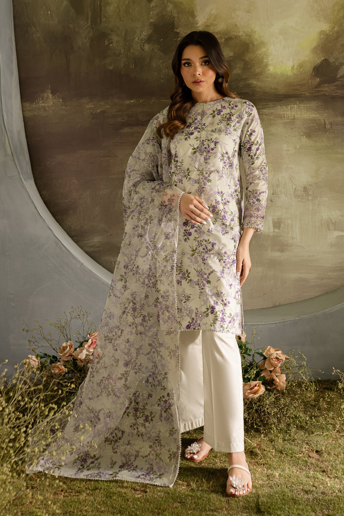 The off-white lawn shirt showcases intricate embroidery, with a complimentary print that adds dimension and visual interest. The craftsmanship of the embroidery highlights the richness of the design, making it perfect for special occasions.