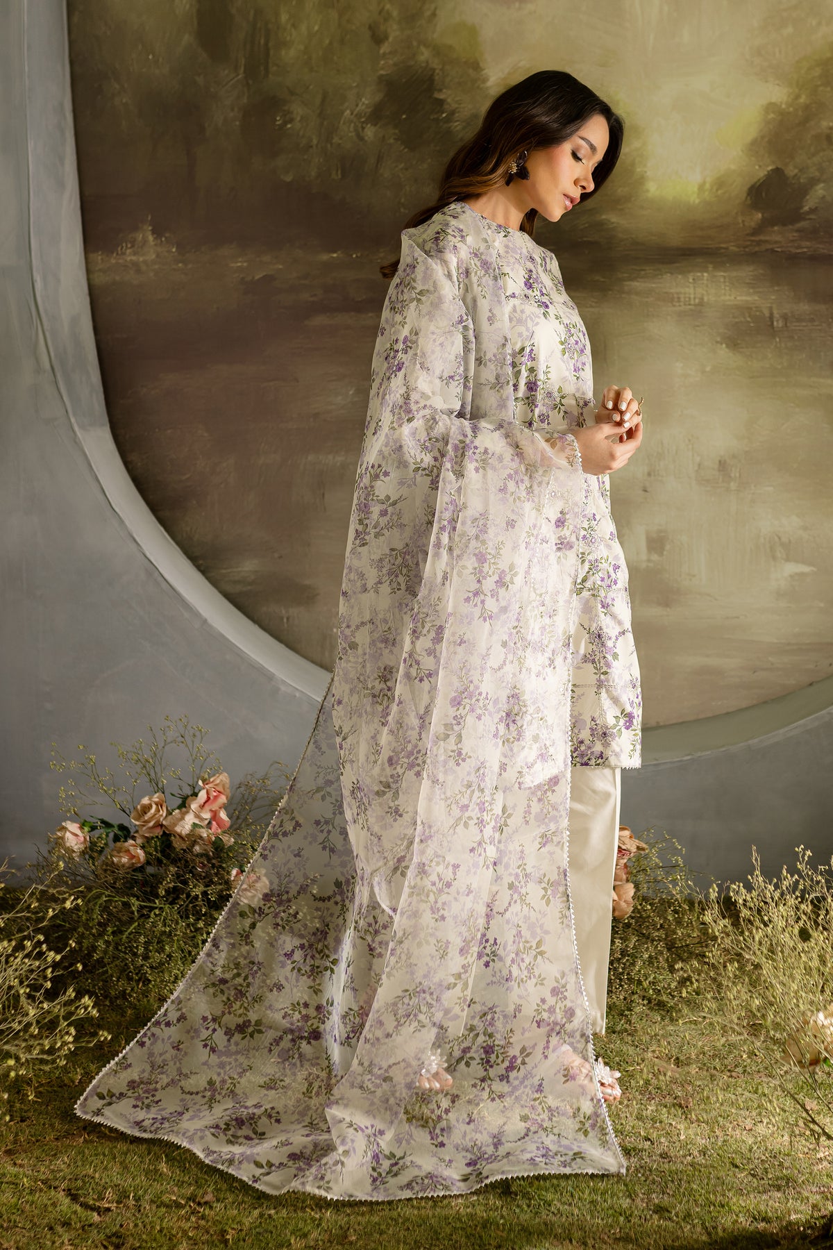 To complete the outfit, the luxurious organza dupatta adds an ethereal touch, complementing the intricate detailing of the shirt and creating a harmonious blend of elegance and grace.