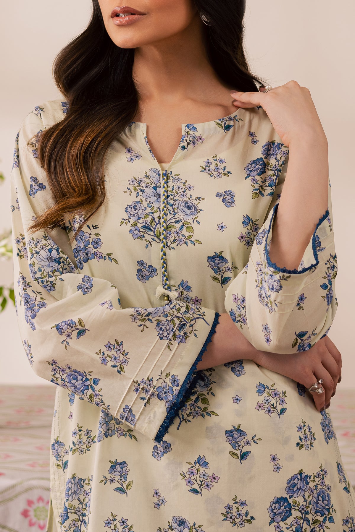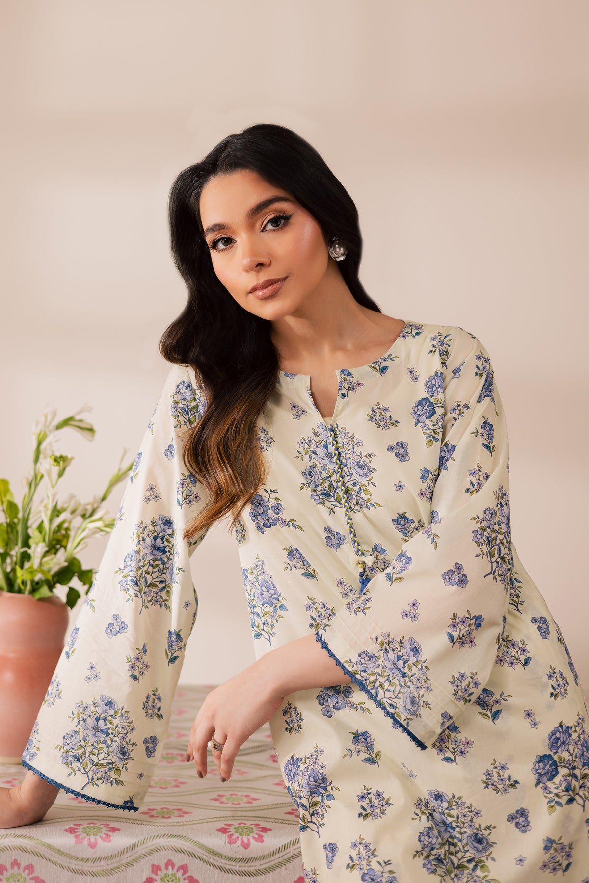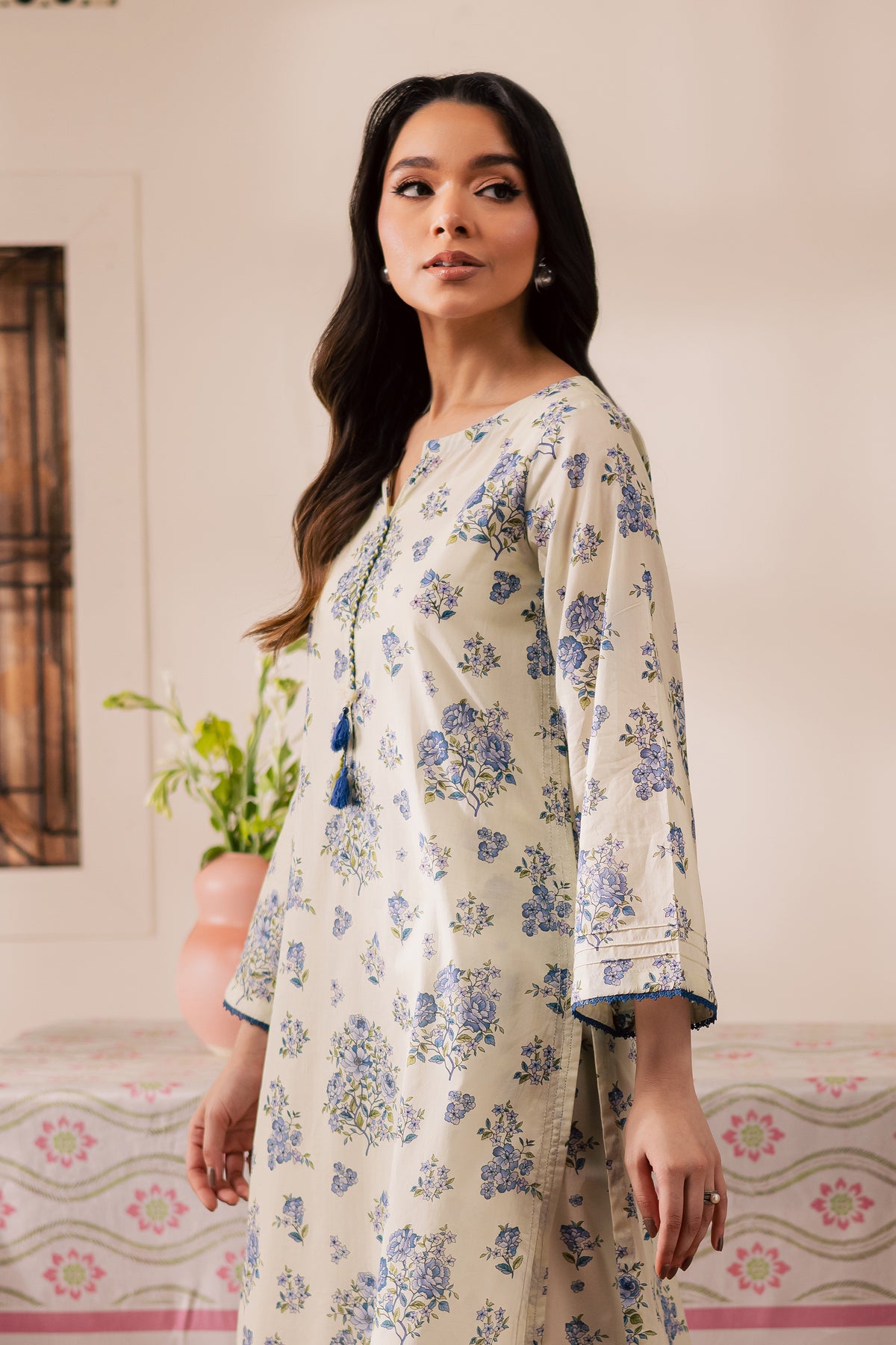 A straight-cut printed off white lawn shirt featuring a clean, contemporary silhouette, highlighted by subtle embellishments at the neckline for a hint of elegance. The sleeves are finished with contrast laces and fine pintuck detailing, adding texture and a touch of modern charm.