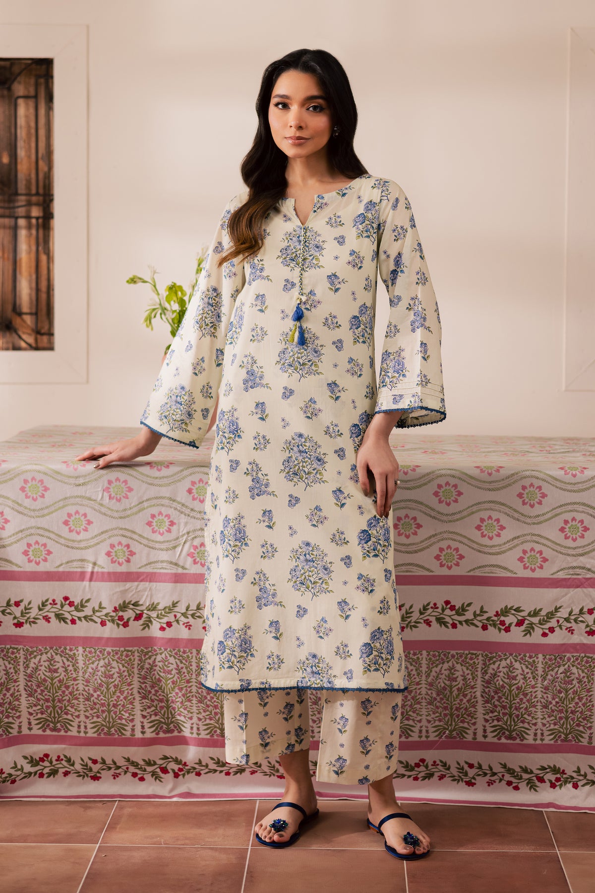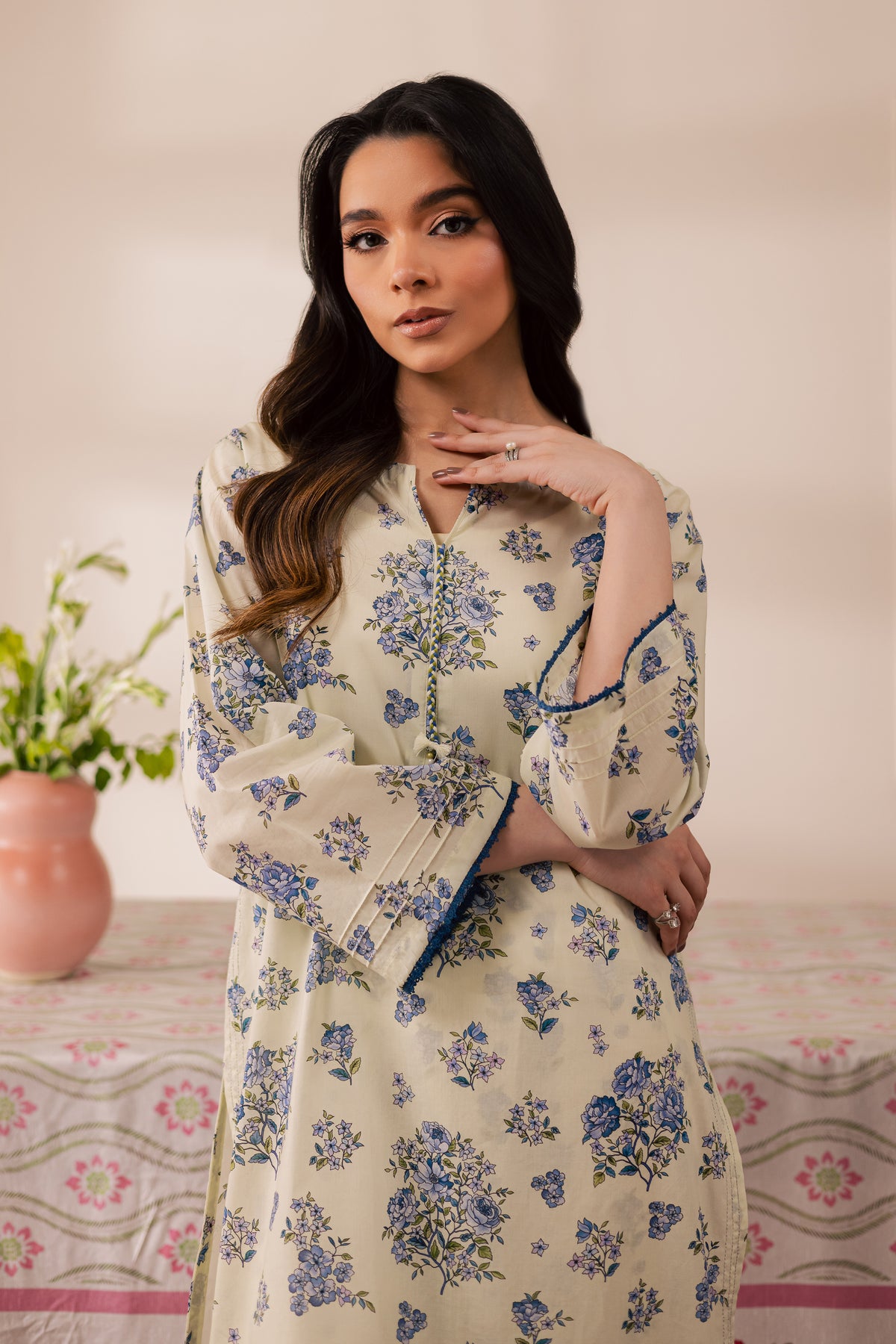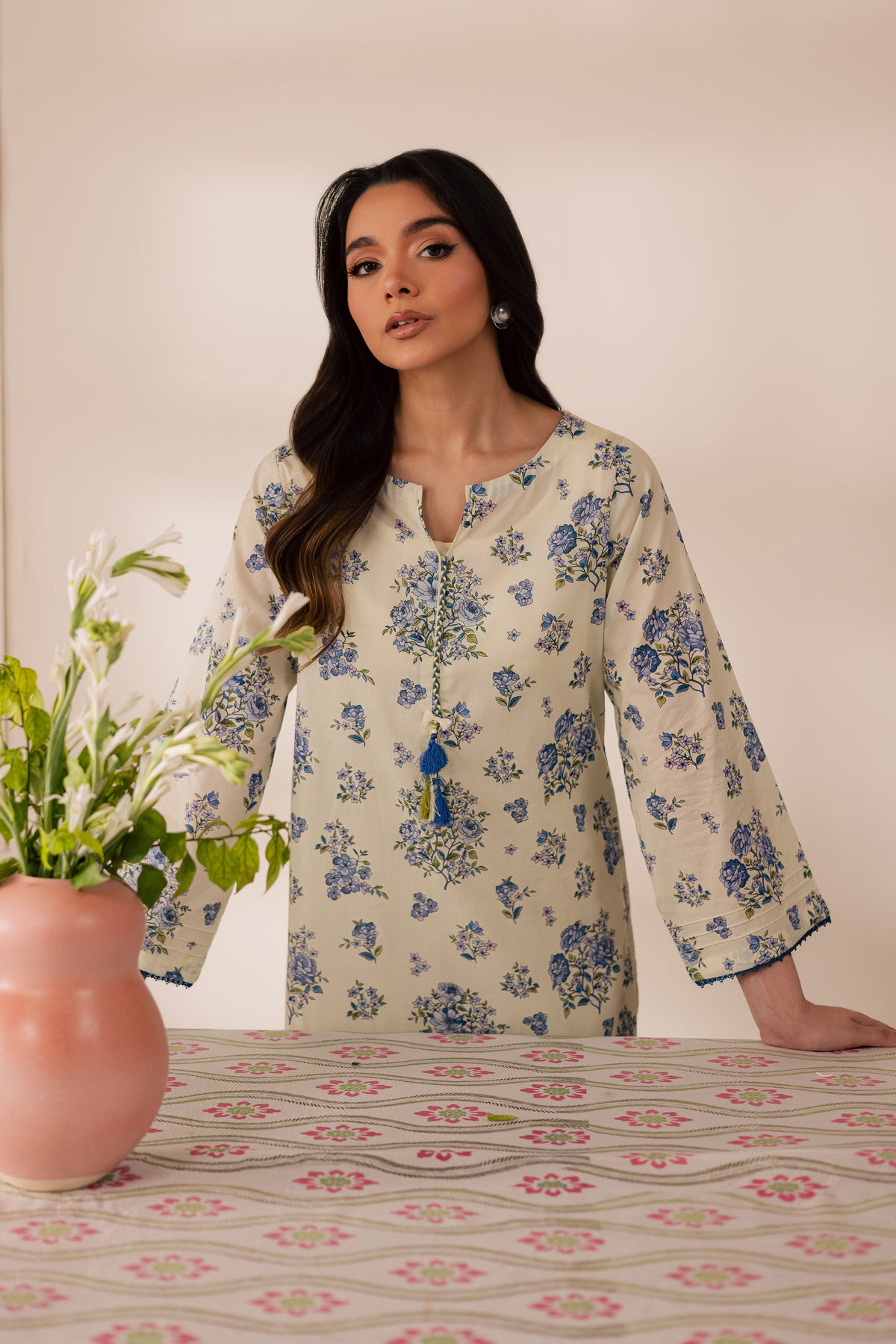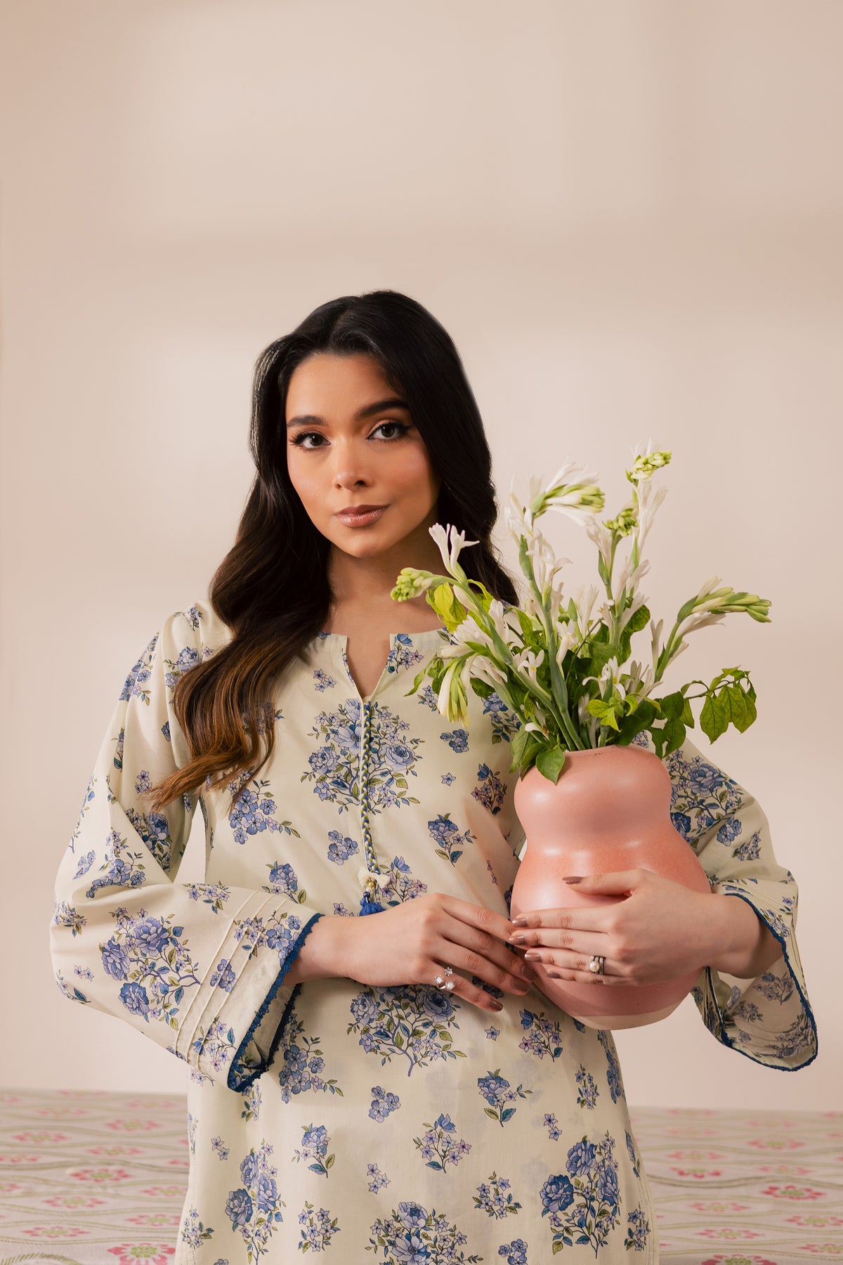 A straight-cut printed off white lawn shirt featuring a clean, contemporary silhouette, highlighted by subtle embellishments at the neckline for a hint of elegance. The sleeves are finished with contrast laces and fine pintuck detailing, adding texture and a touch of modern charm.