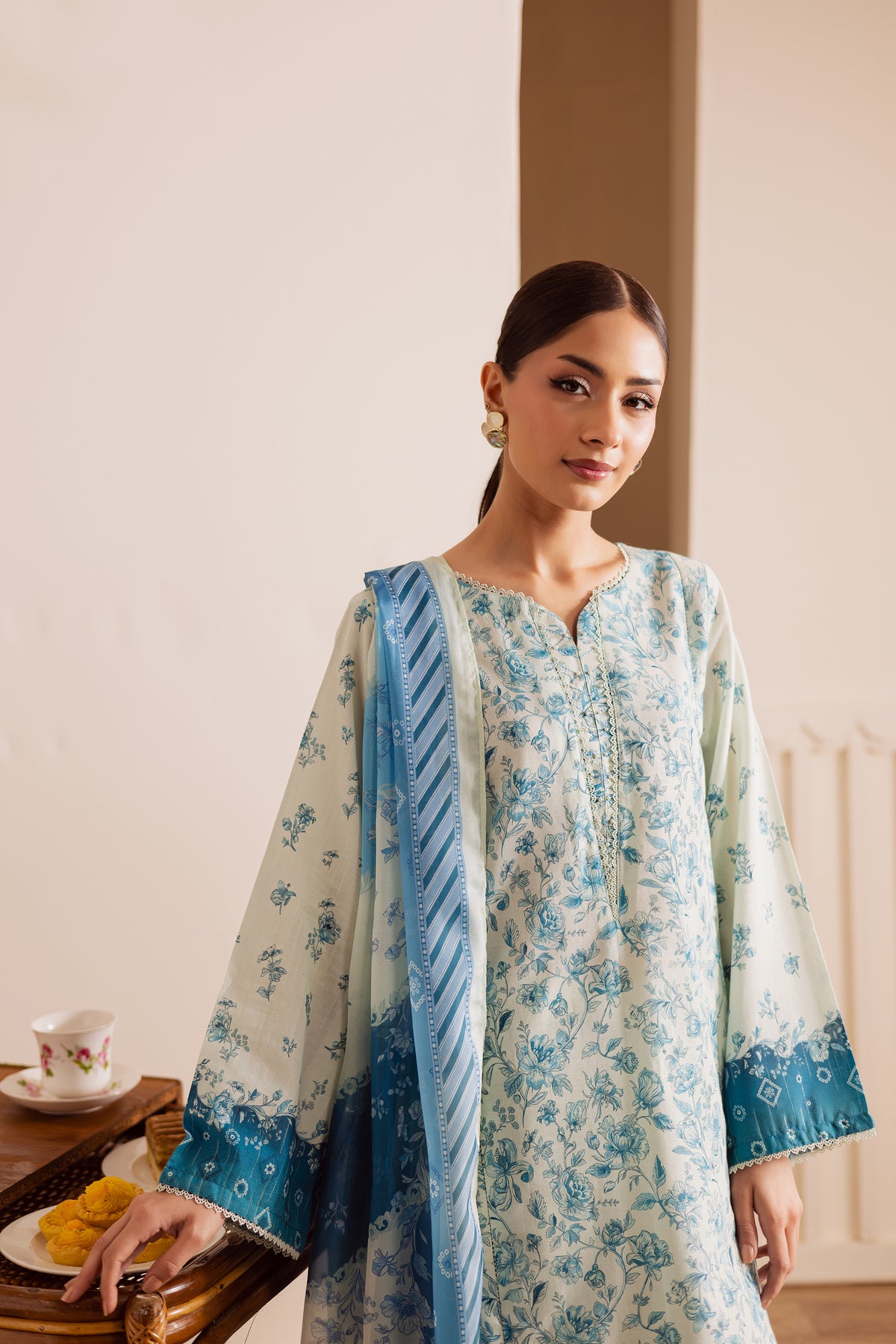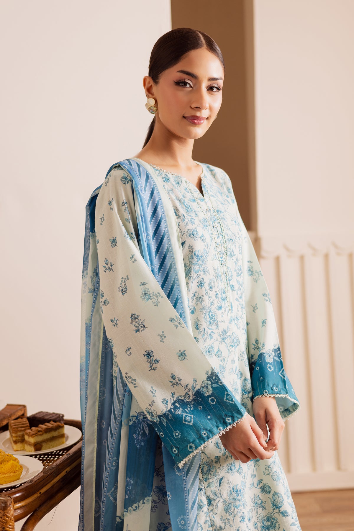 It is paired with a matching printed lawn jacquard trouser that complements the shirt’s design, offering a cohesive and stylish ensemble.