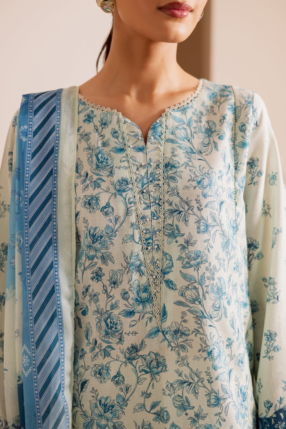 A printed paneled sky blue lawn zari jacquard shirt designed with a flattering silhouette, adorned with delicate laces and subtle embellishments at the neckline. The shirt is beautifully finished with lace accents, adding a touch of elegance to the overall look.