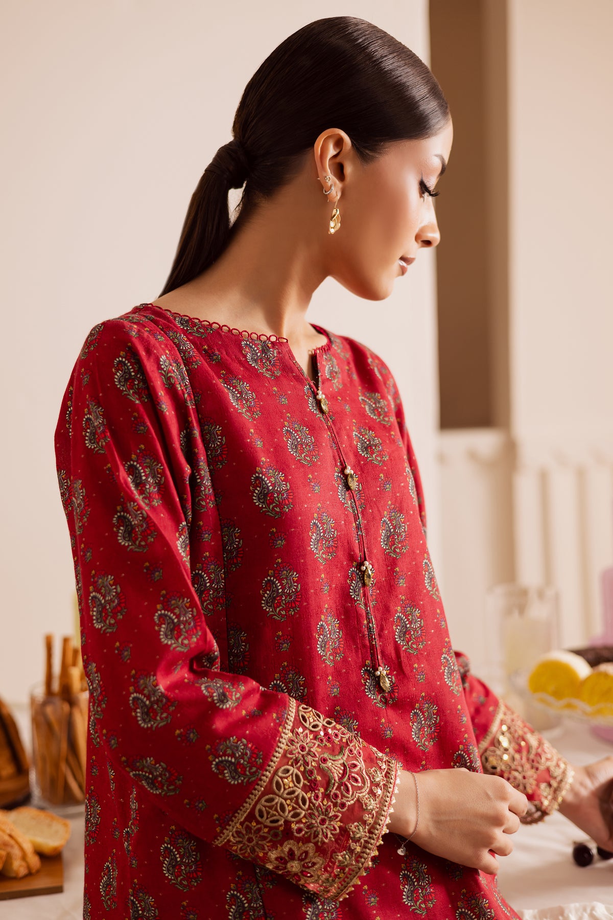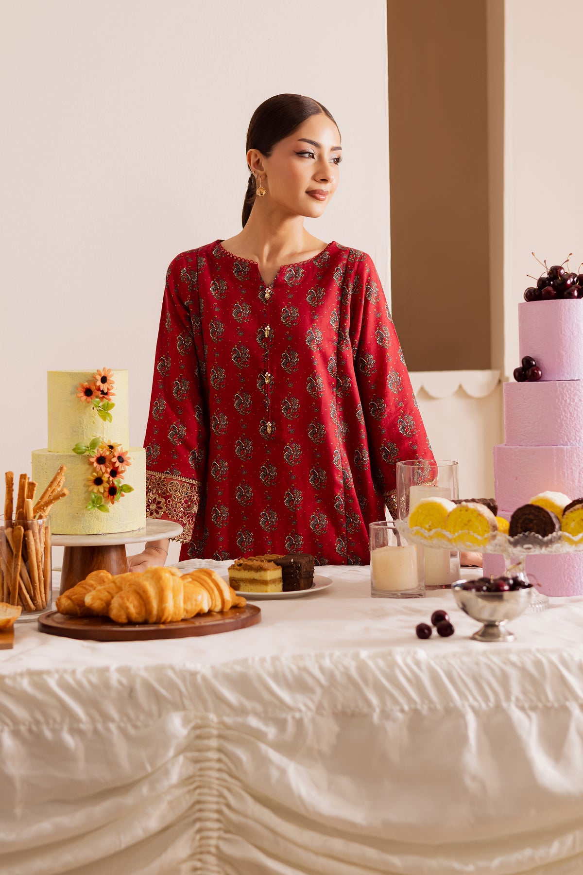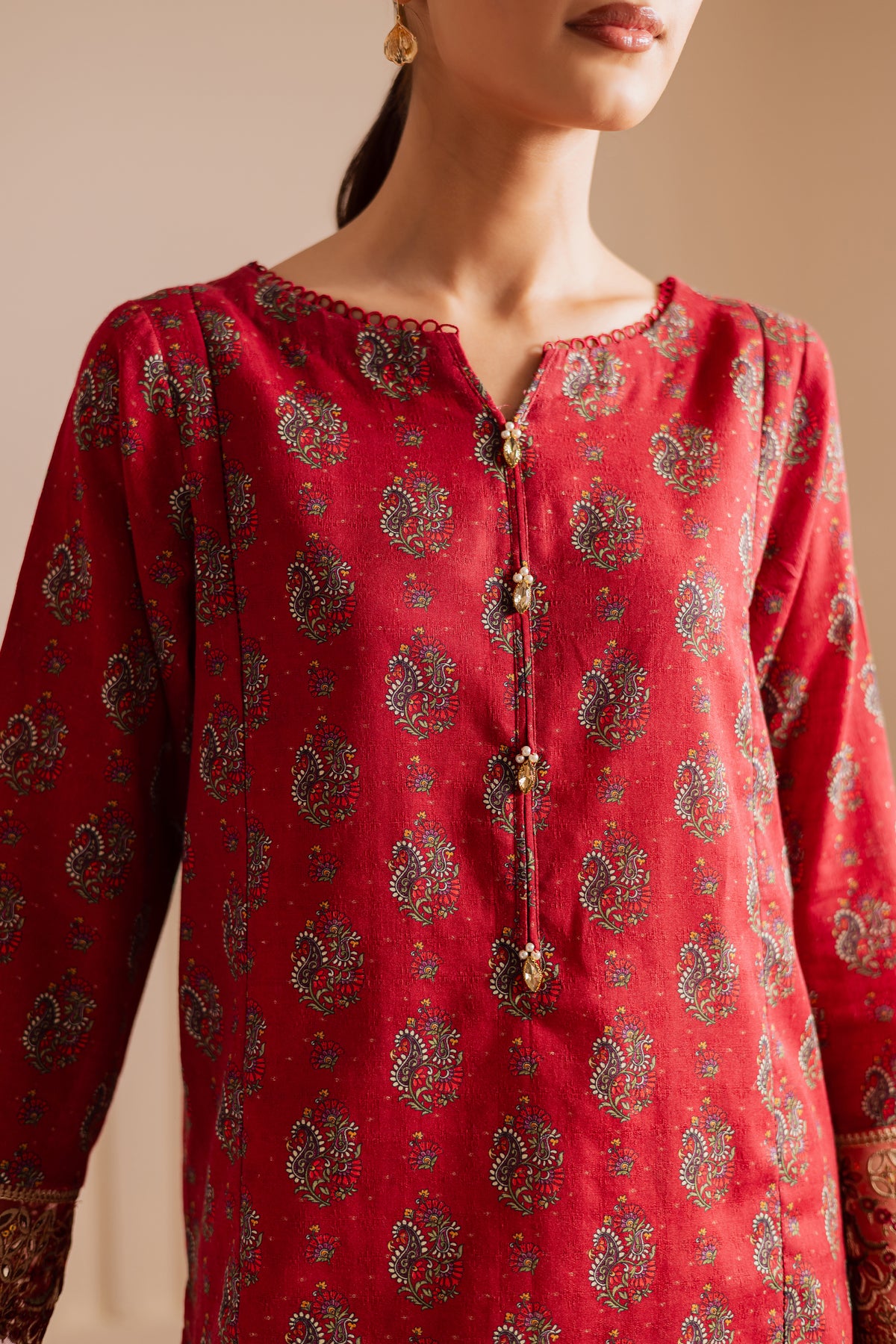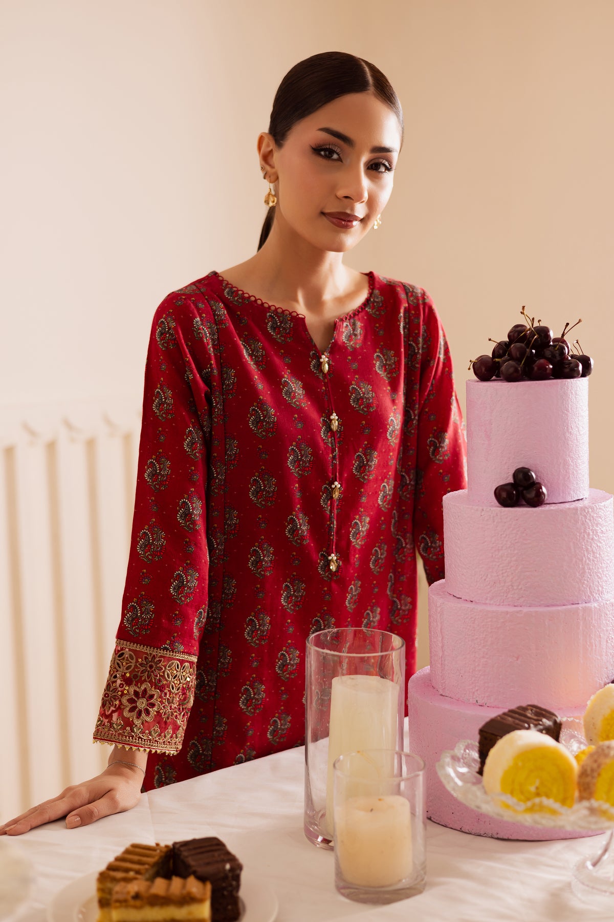 A beautifully printed red lawn zari jacquard paneled shirt, crafted to flatter with its structured silhouette. The design is elevated with intricate embroidery at the sleeve hems and delicate embellishments at the neckline, adding a touch of elegance and sophistication.