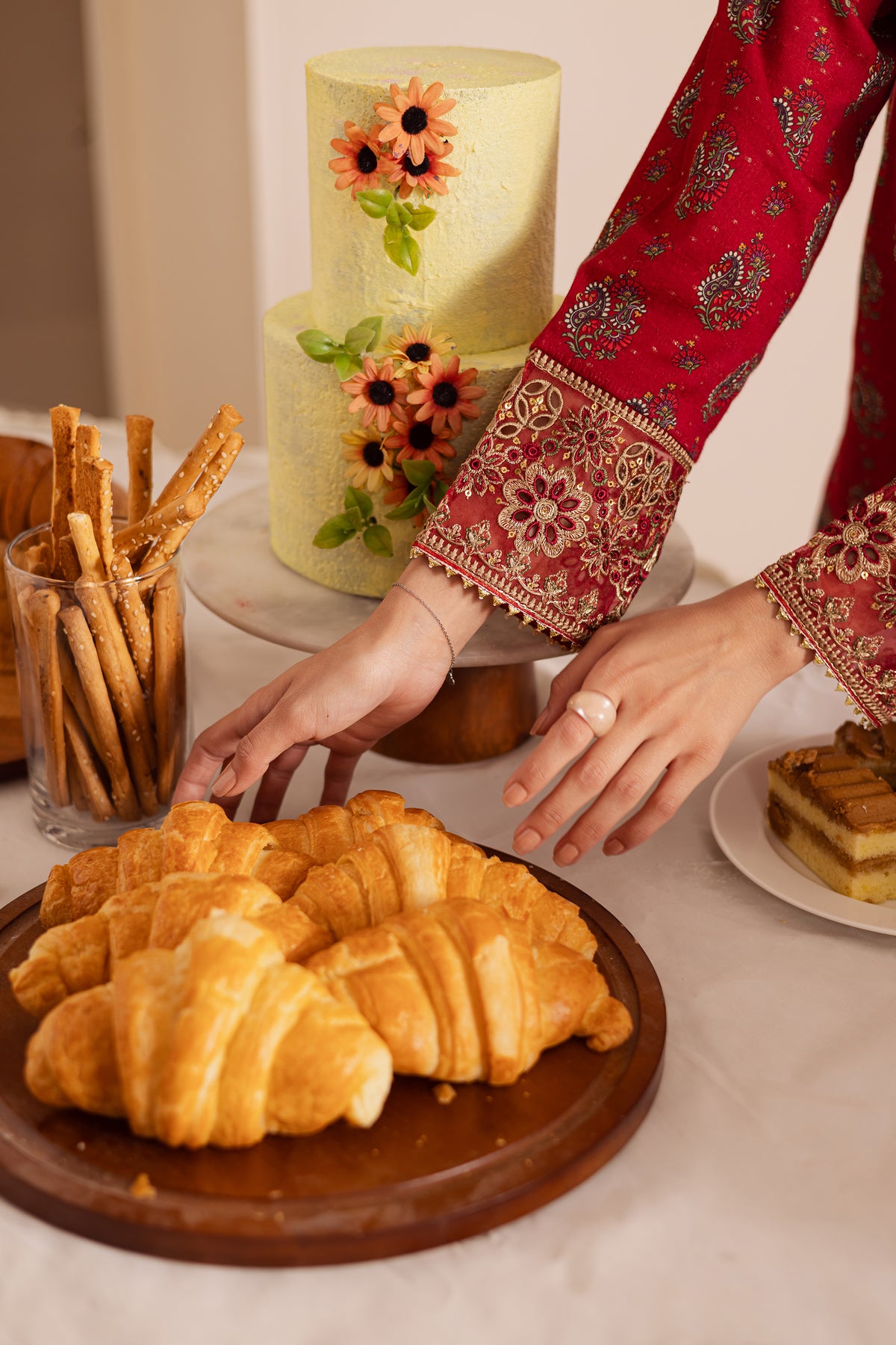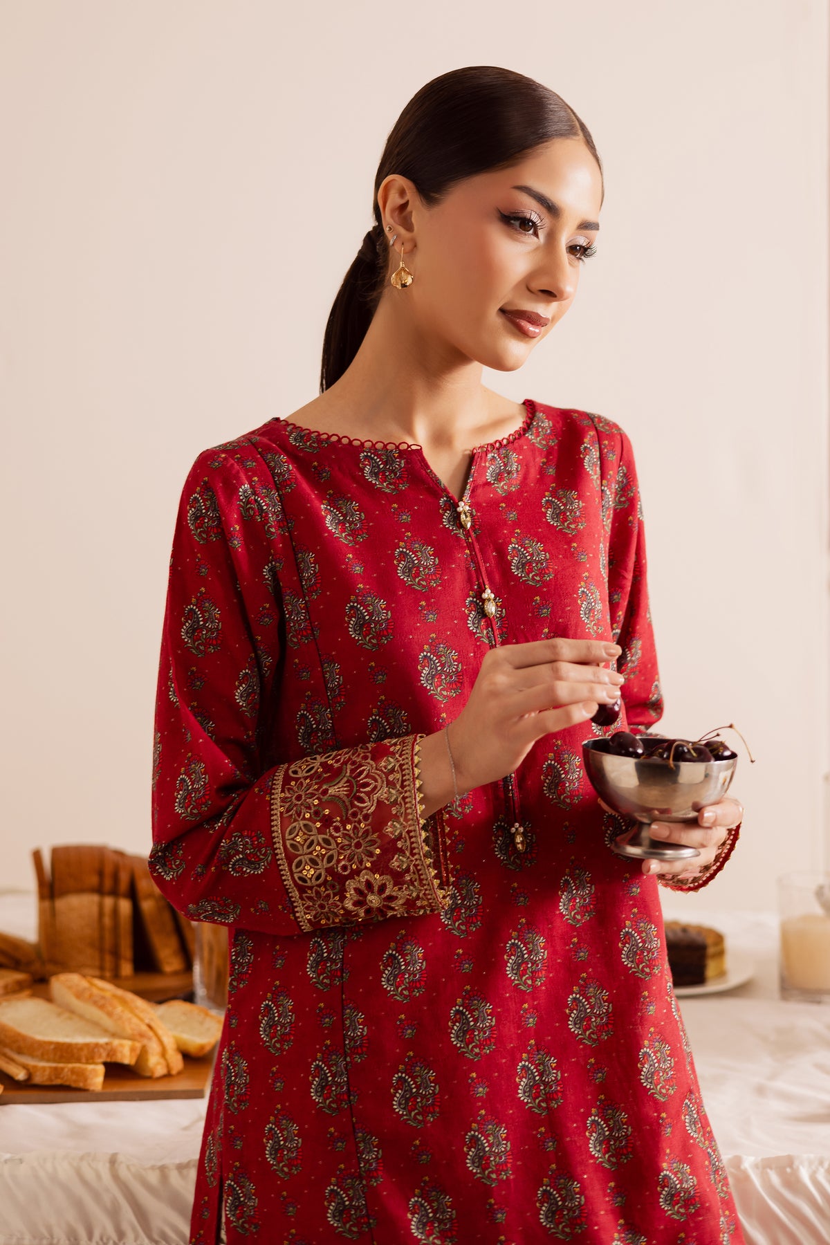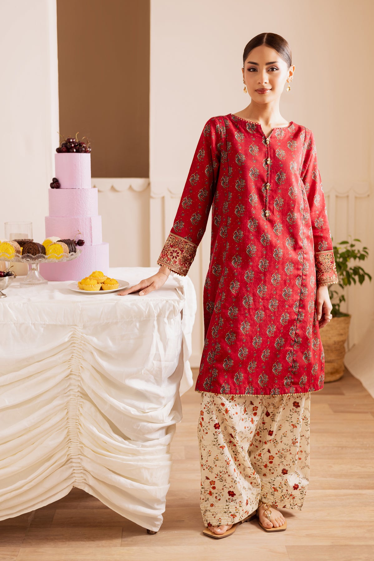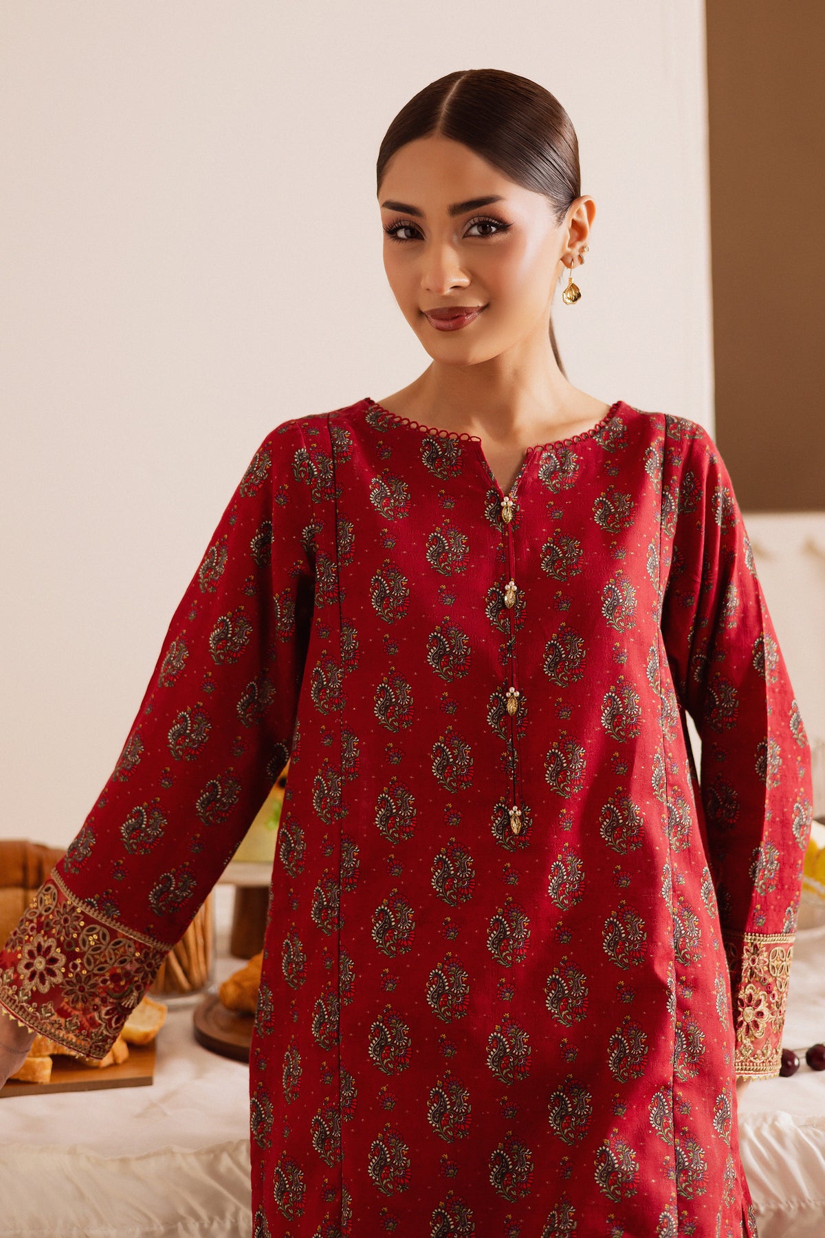 A beautifully printed red lawn zari jacquard paneled shirt, crafted to flatter with its structured silhouette. The design is elevated with intricate embroidery at the sleeve hems and delicate embellishments at the neckline, adding a touch of elegance and sophistication.