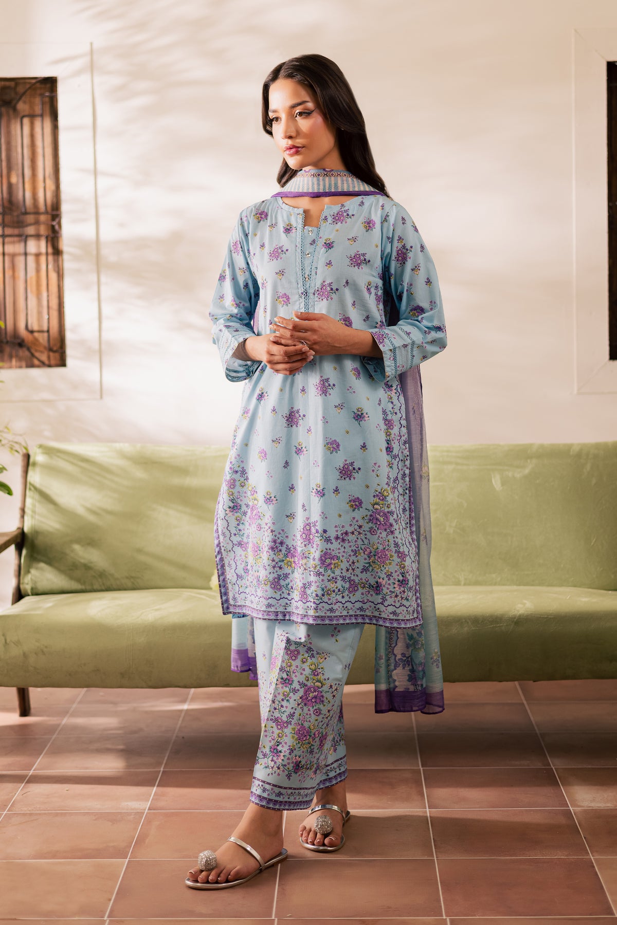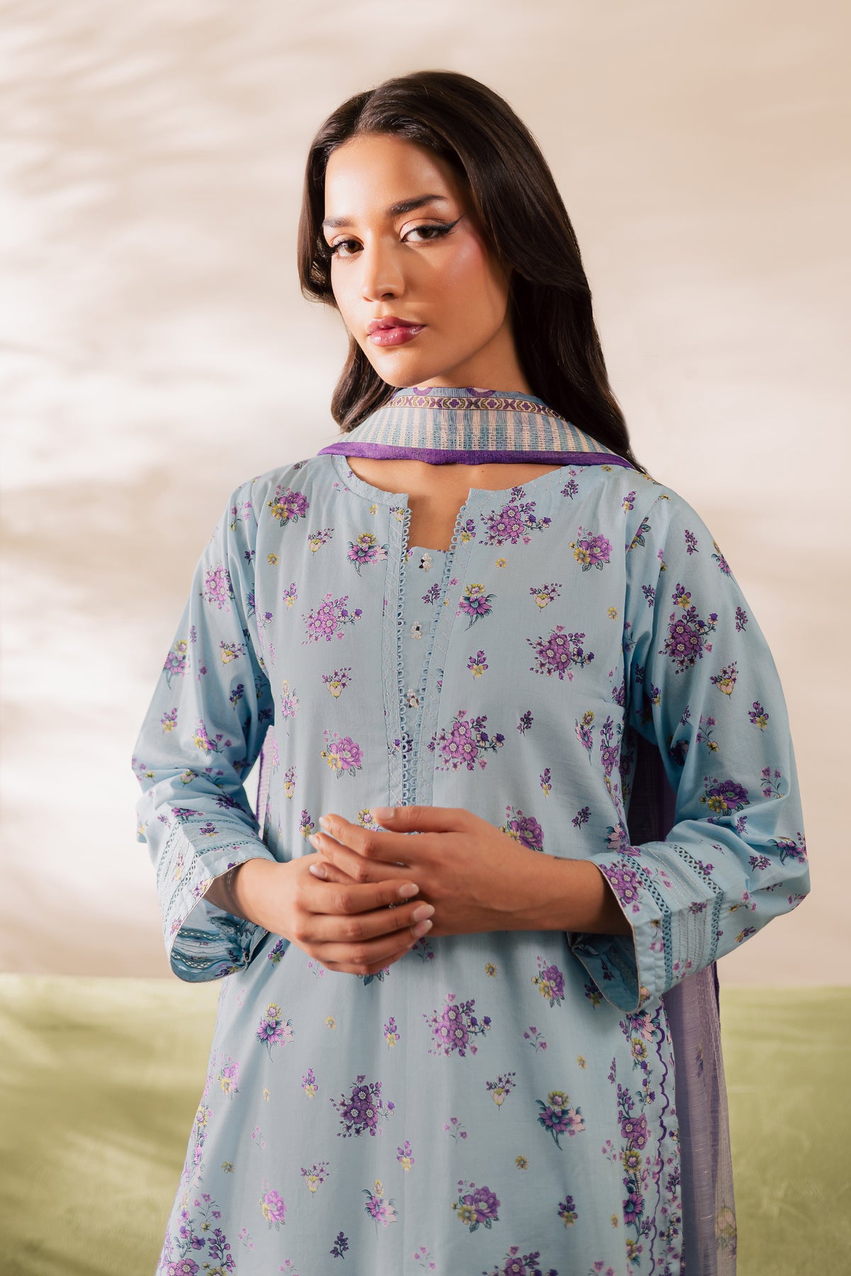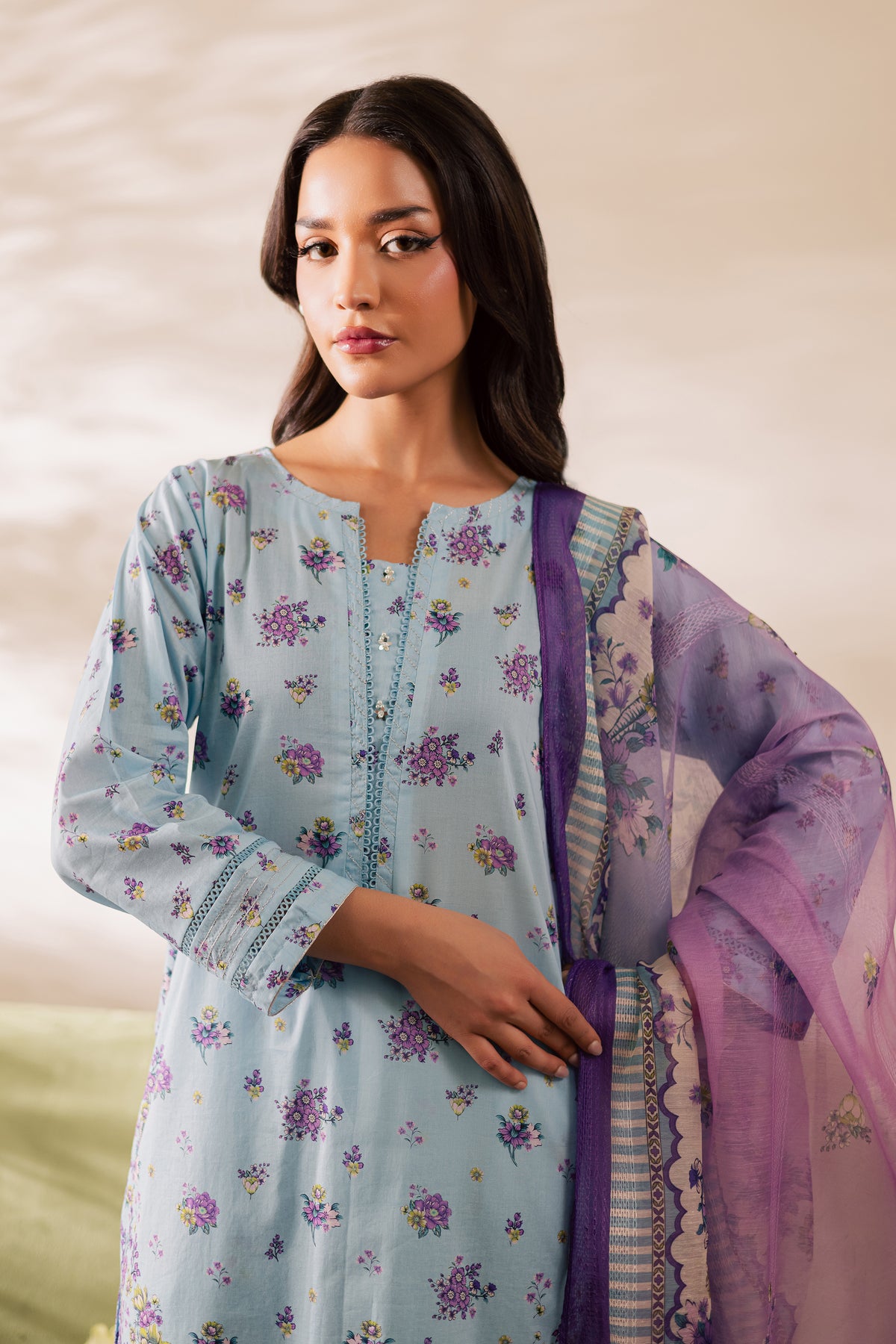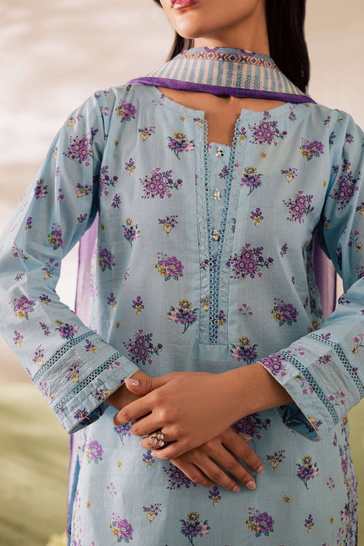A stylish printed lawn sky blue shirt featuring a beautifully embellished neckline adorned with lace and a delicate pearl collage. The sleeves are finished with matching lace, adding a graceful touch to the overall design.