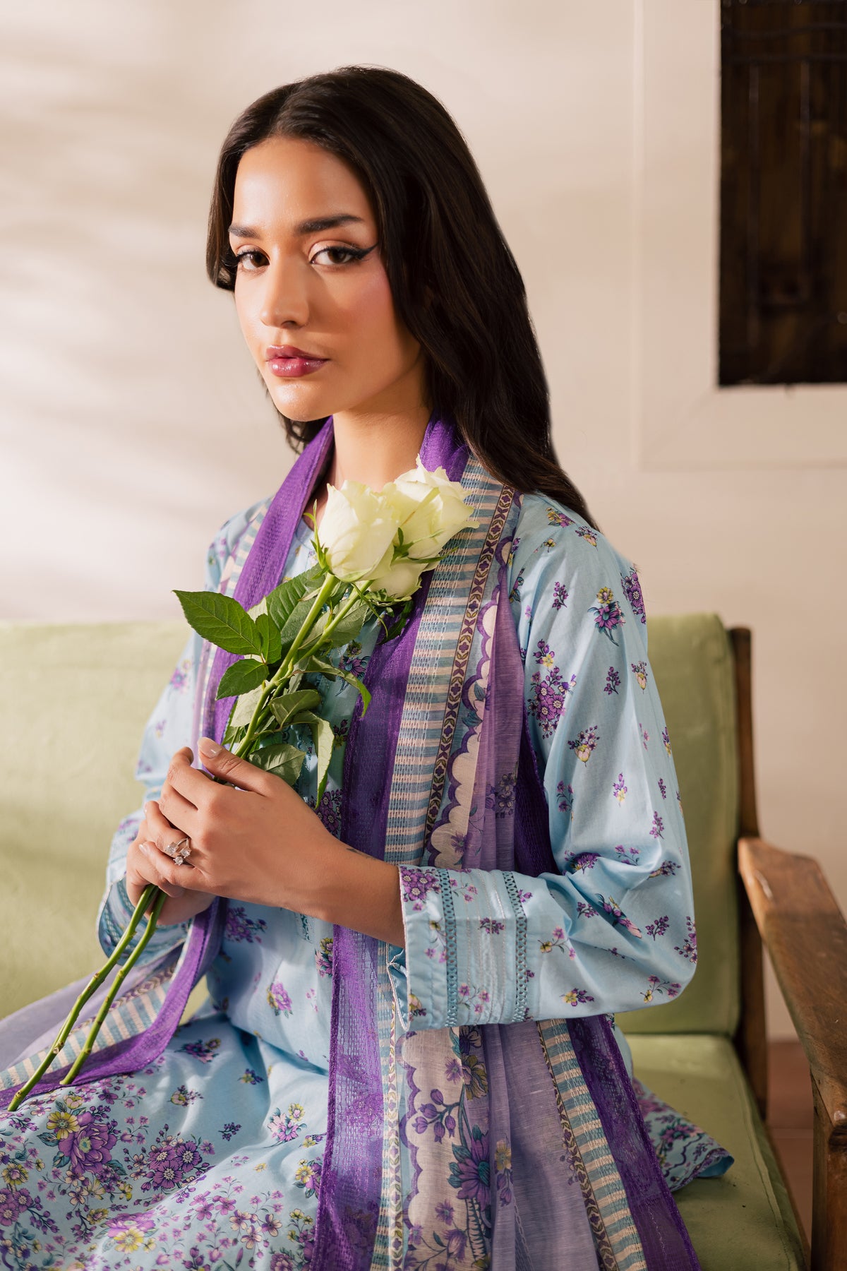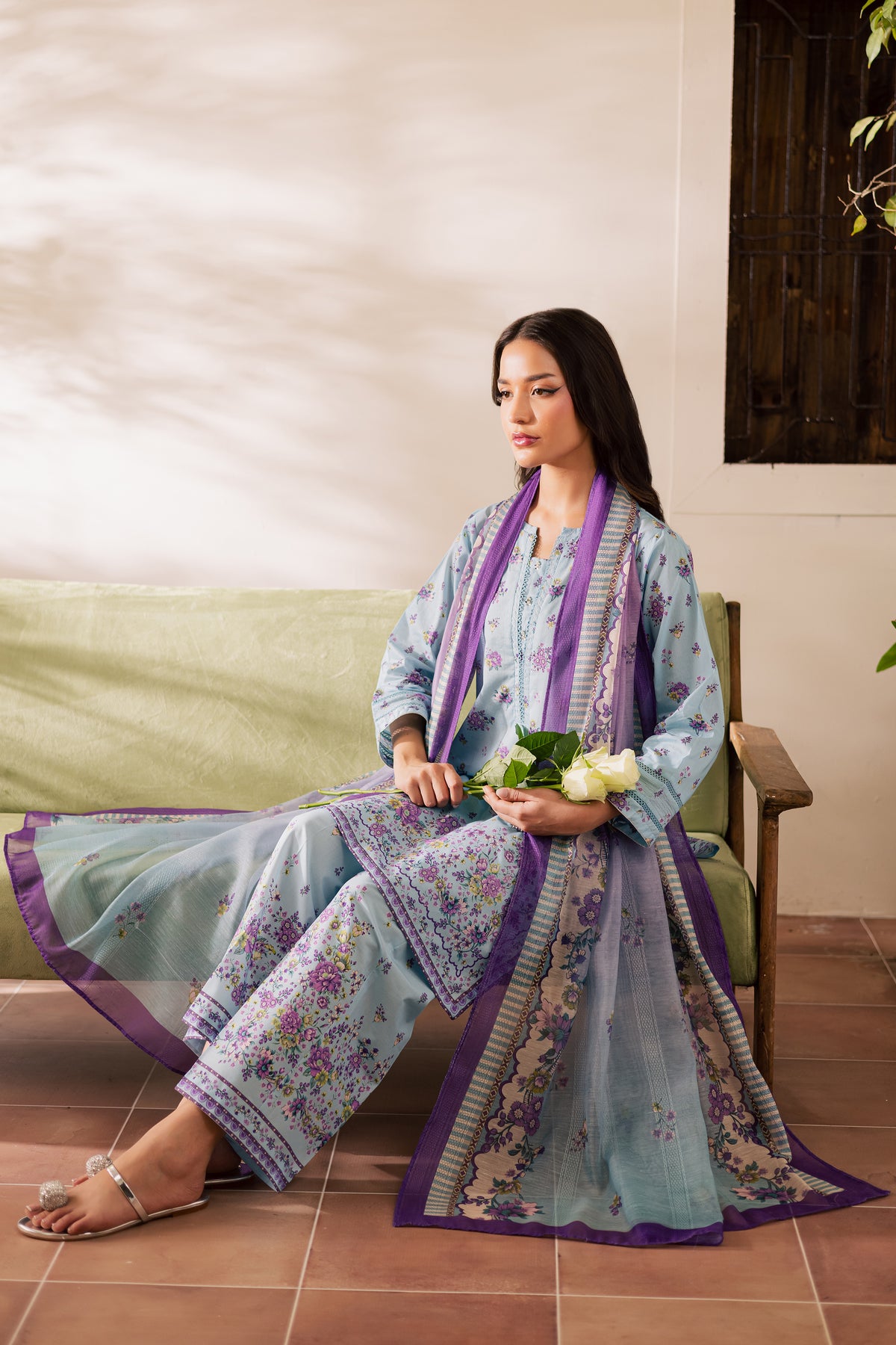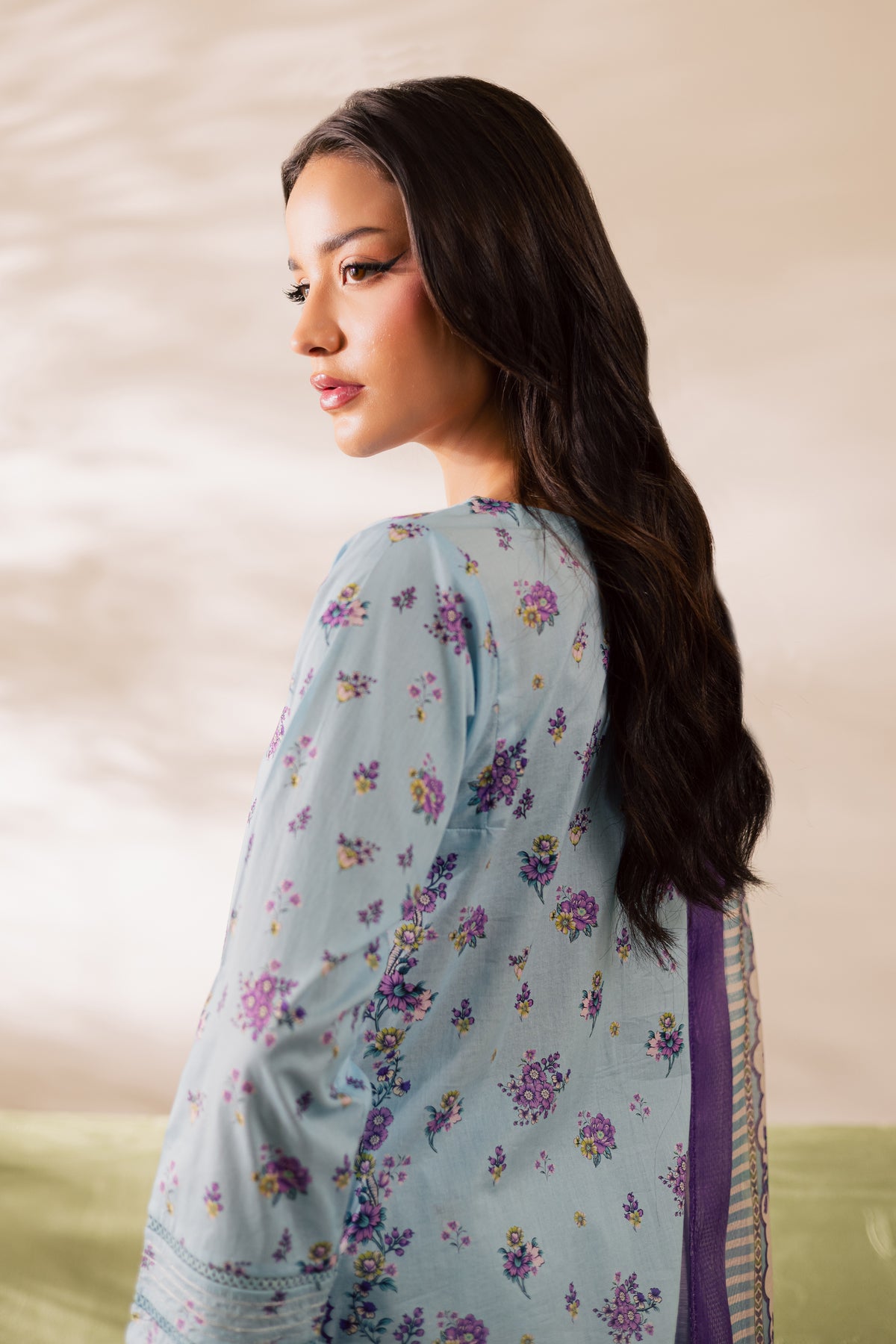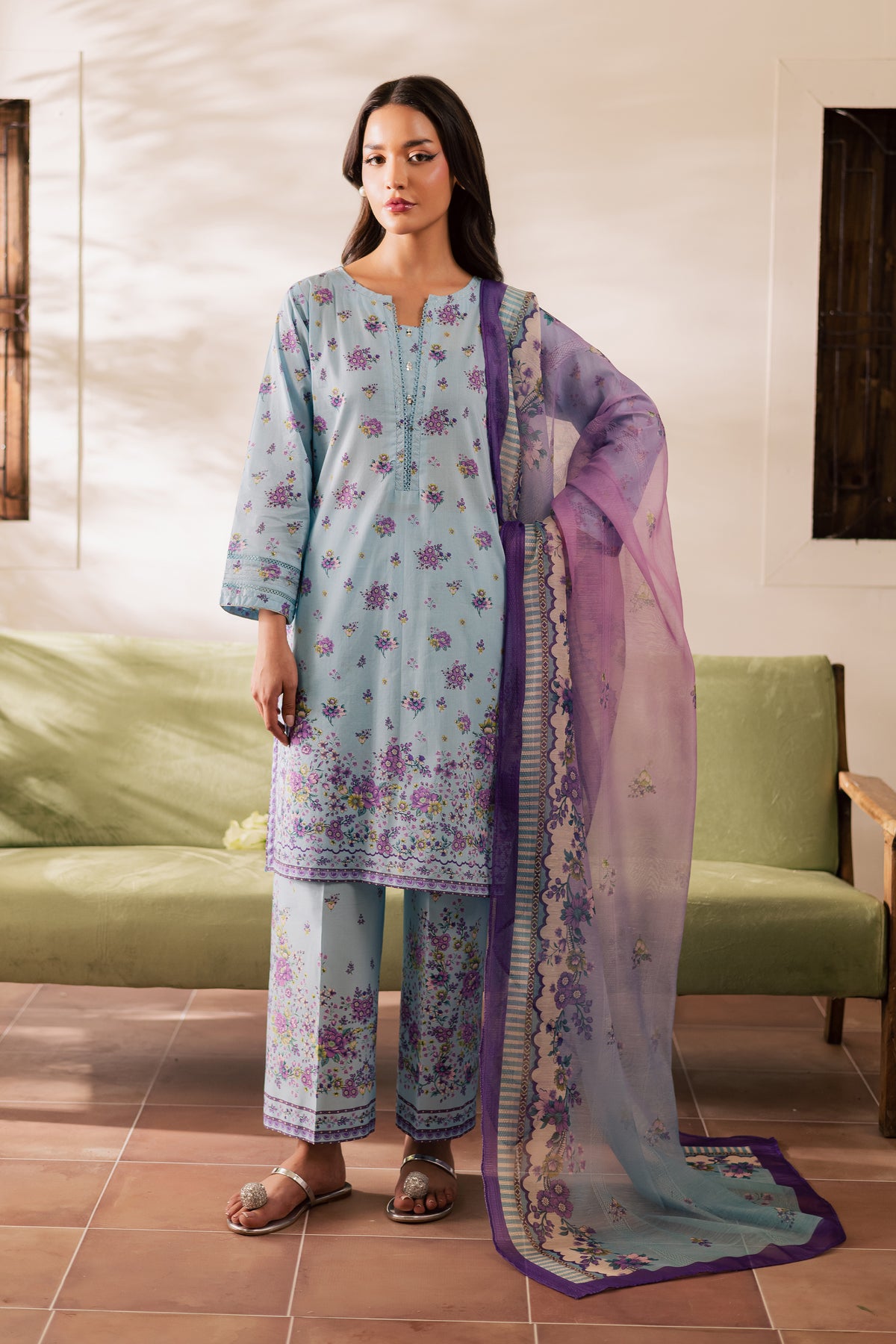 A stylish printed lawn sky blue shirt featuring a beautifully embellished neckline adorned with lace and a delicate pearl collage. The sleeves are finished with matching lace, adding a graceful touch to the overall design.