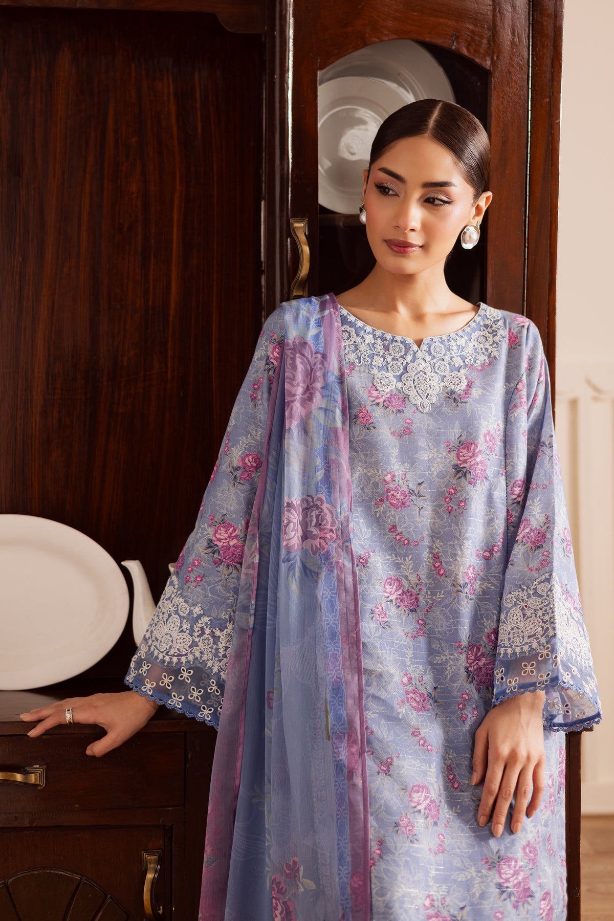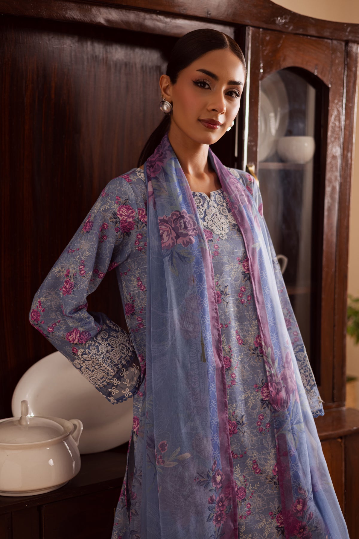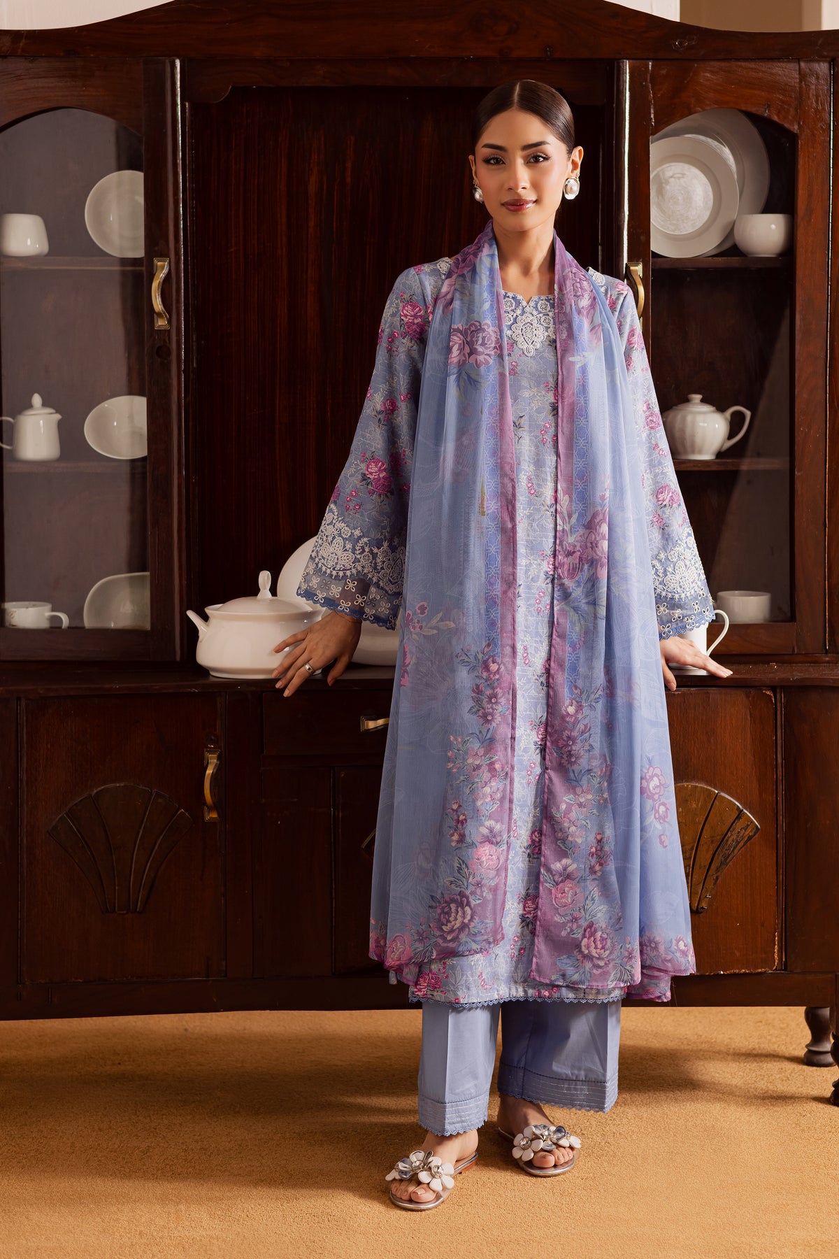 A printed sky blue lawn zari jacquard shirt adorned with delicate monotone embroidery at the neckline and sleeves, offering a subtle yet refined look ideal for everyday elegance.