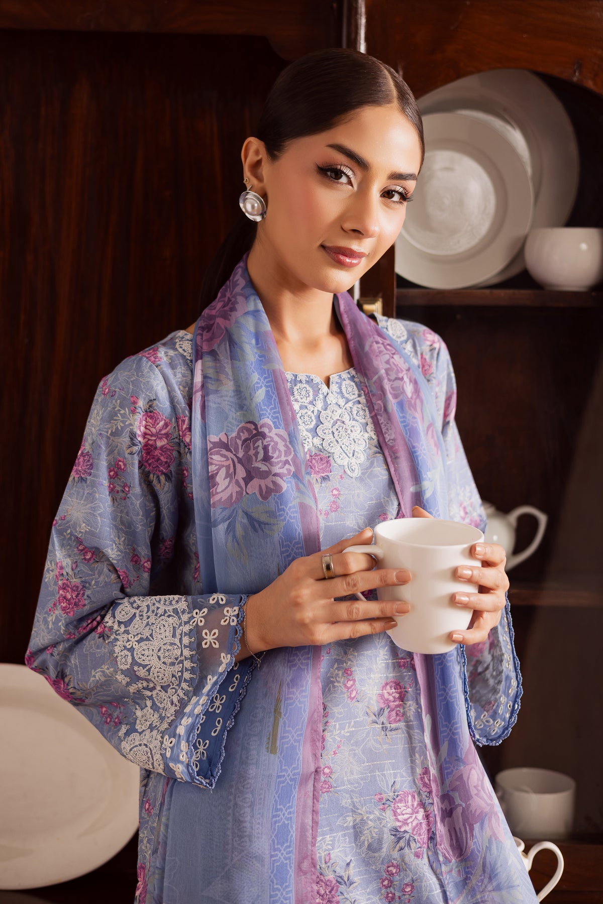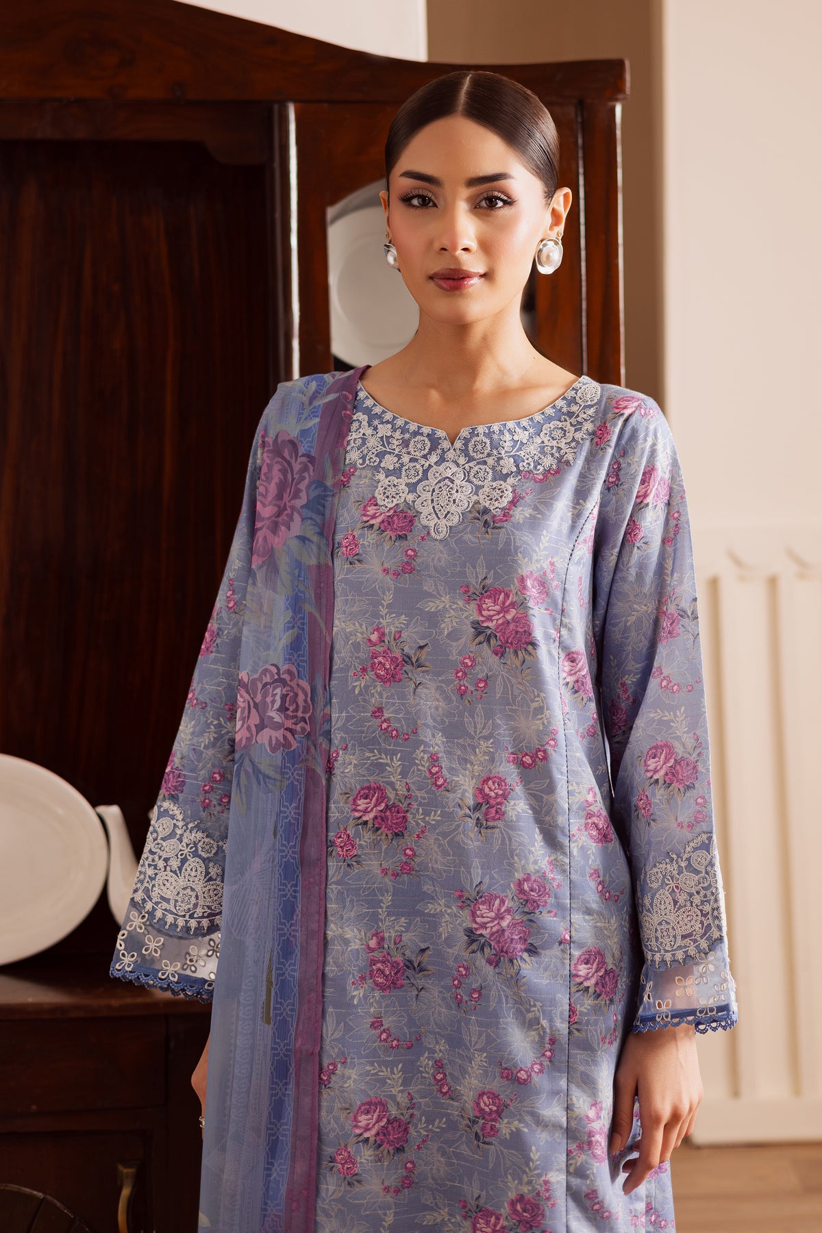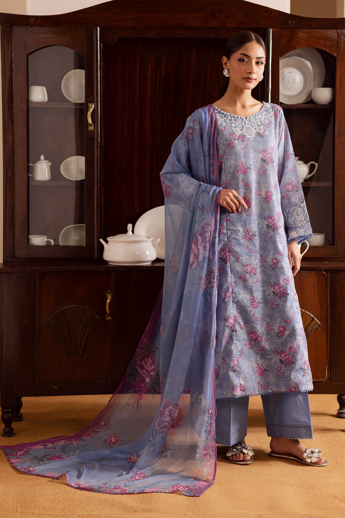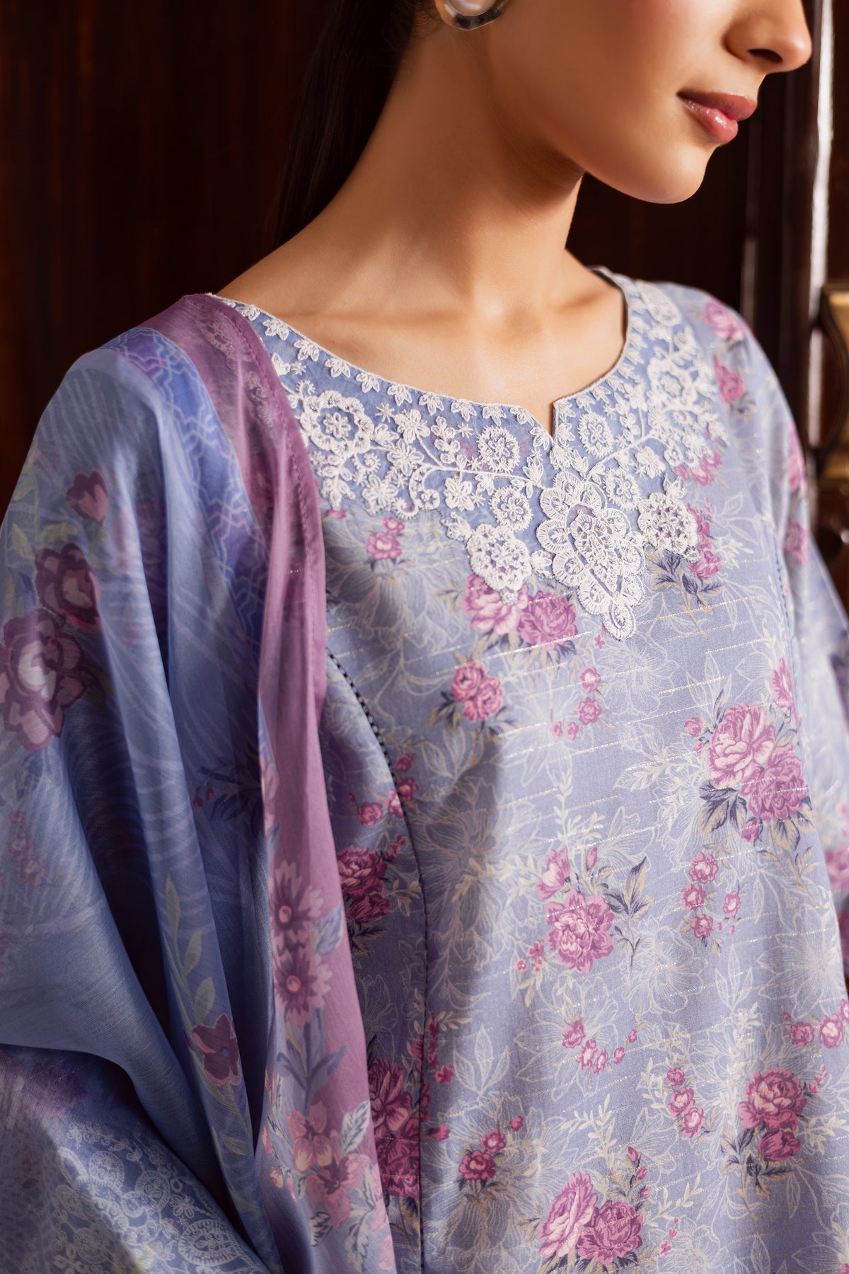 A printed sky blue lawn zari jacquard shirt adorned with delicate monotone embroidery at the neckline and sleeves, offering a subtle yet refined look ideal for everyday elegance.