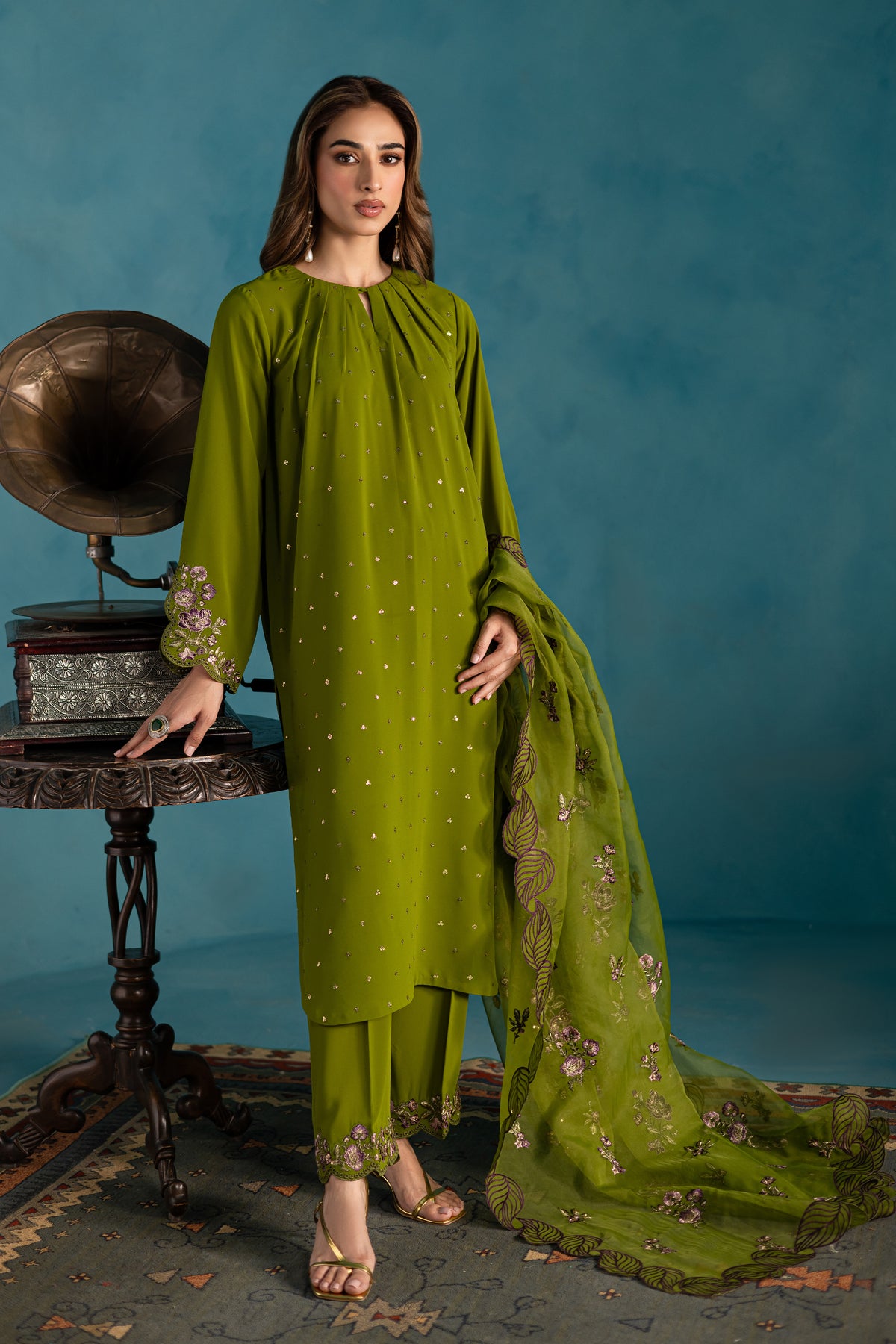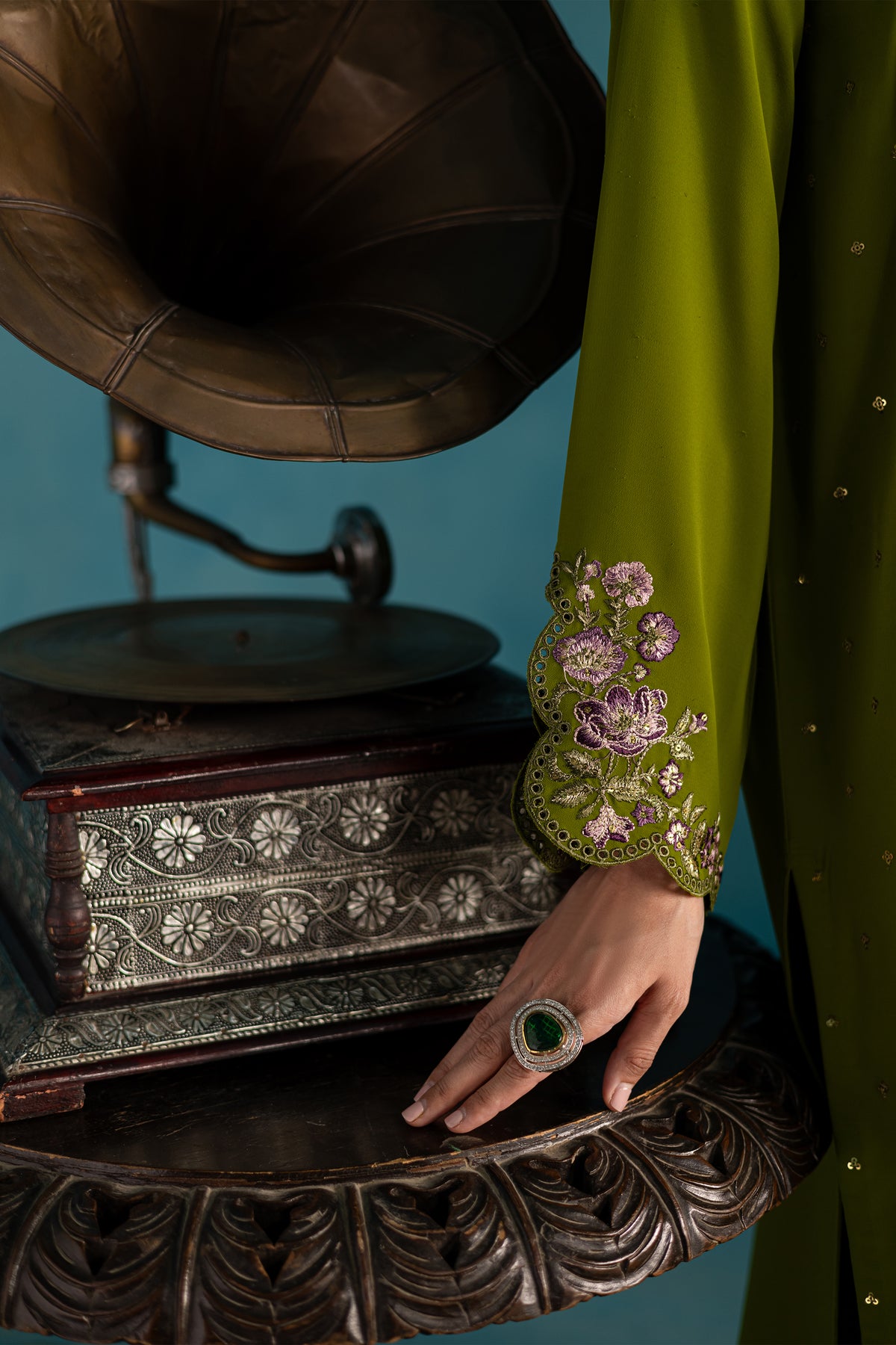 A parrot green georgette shirt featuring an embroidered sequin spray, adding a touch of sparkle and sophistication. The neckline is designed with delicate pleats, creating a refined and structured look, while the sleeves are finished with a stylish cut at the cuff for an added modern twist.