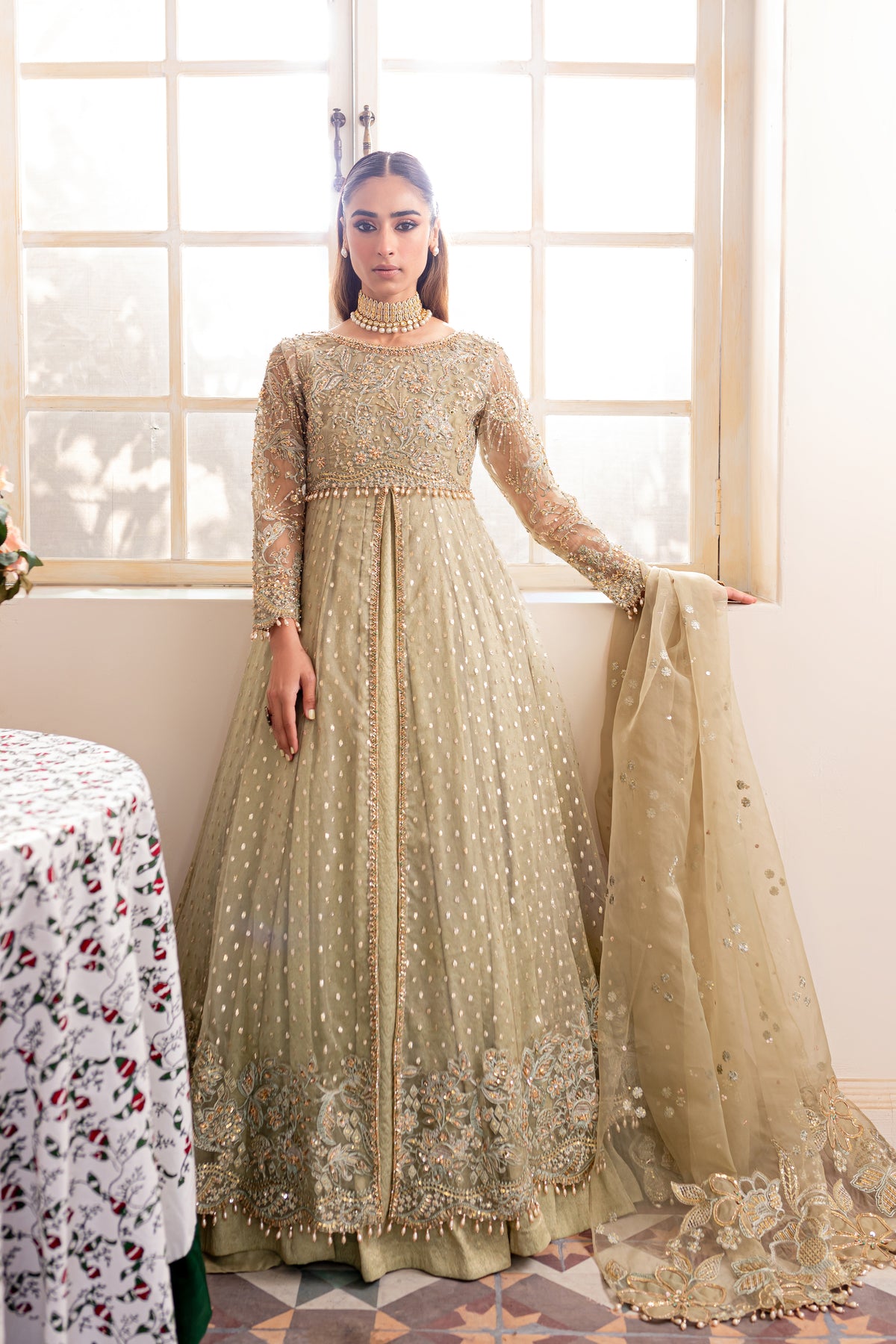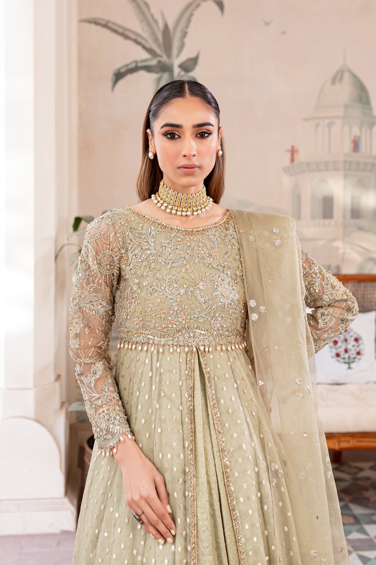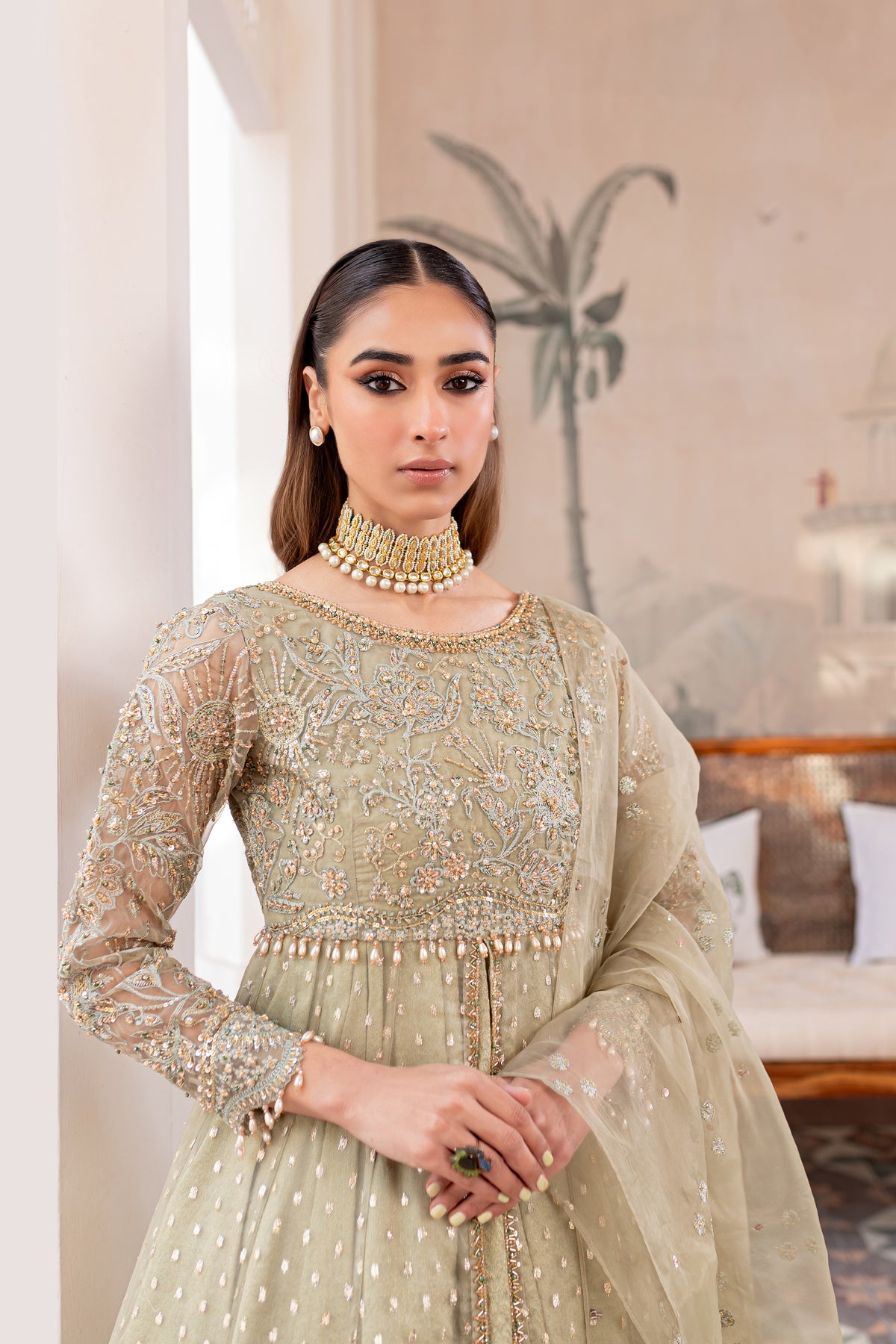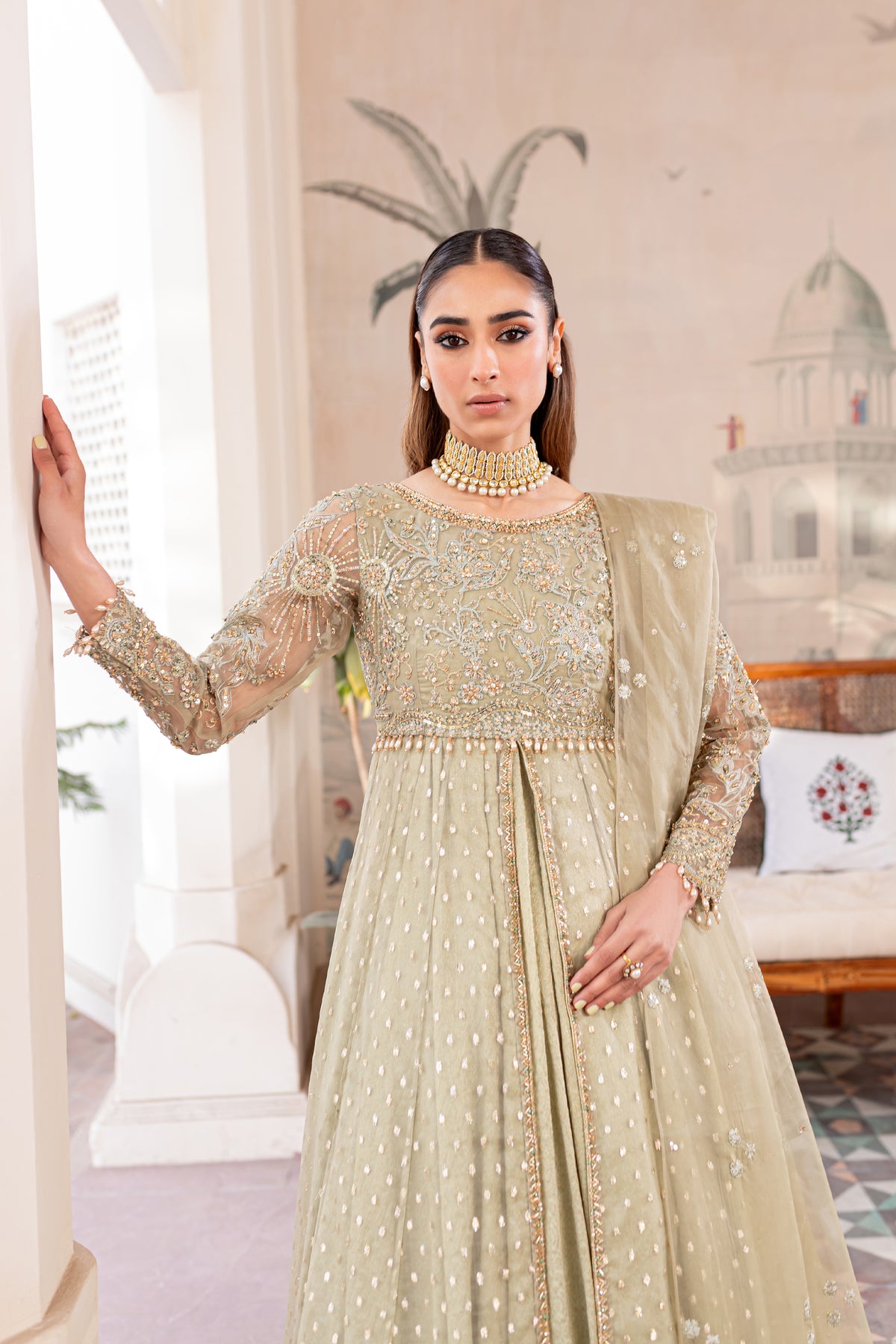 Skillfully designed front open frock made from premium quality organza badla in the shades of pistachio features heavy embroidery all over. Striking details withhold intricate adda work on neckline, yoke, and sleeves enhanced with floral motifs at hem. Further adorned with hangings at frock hem and sleeves.