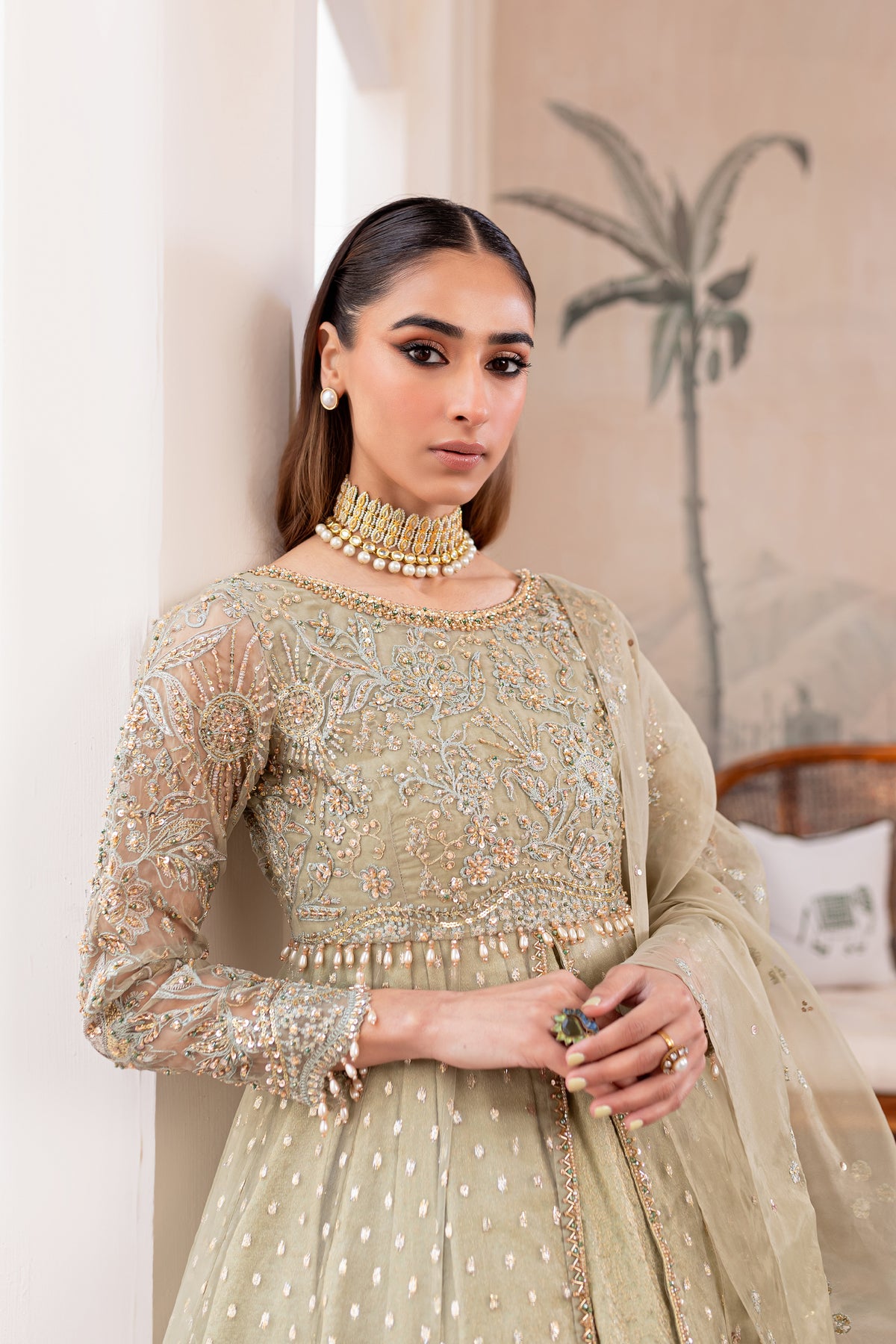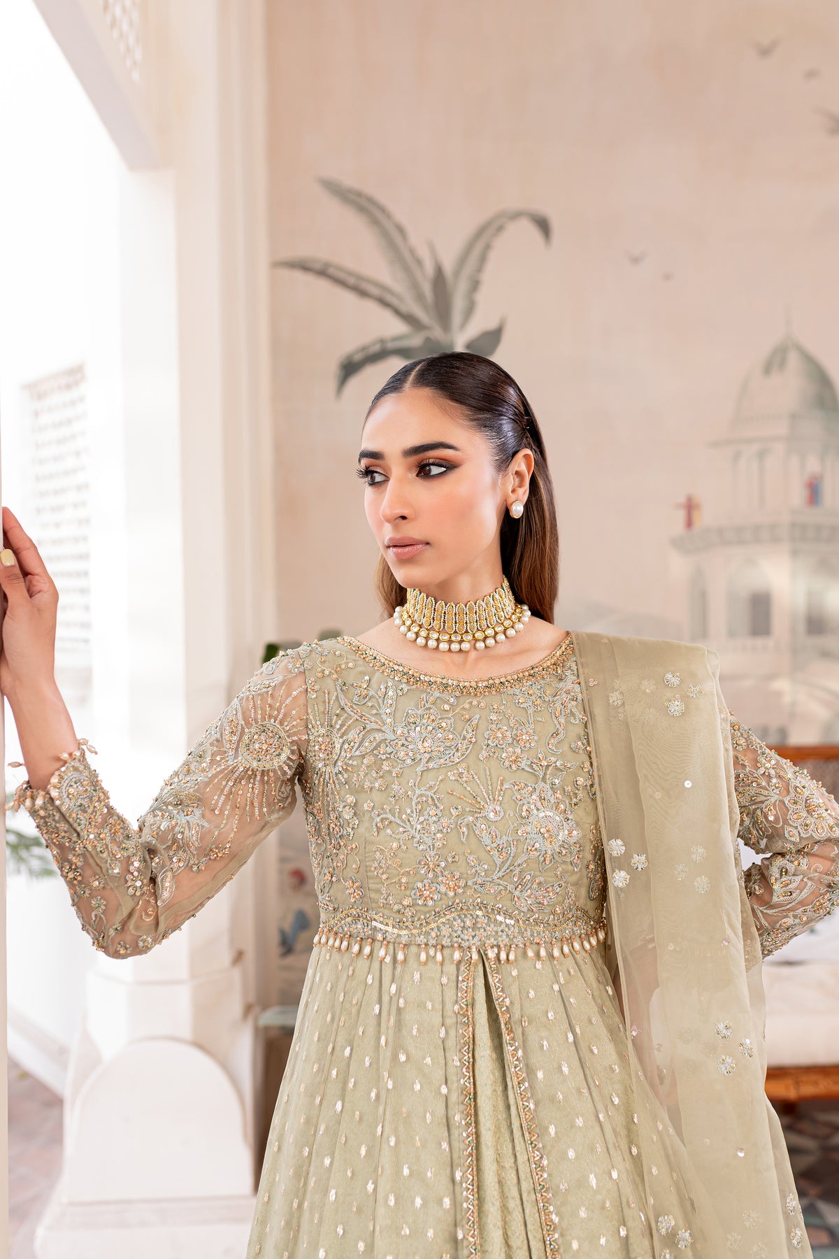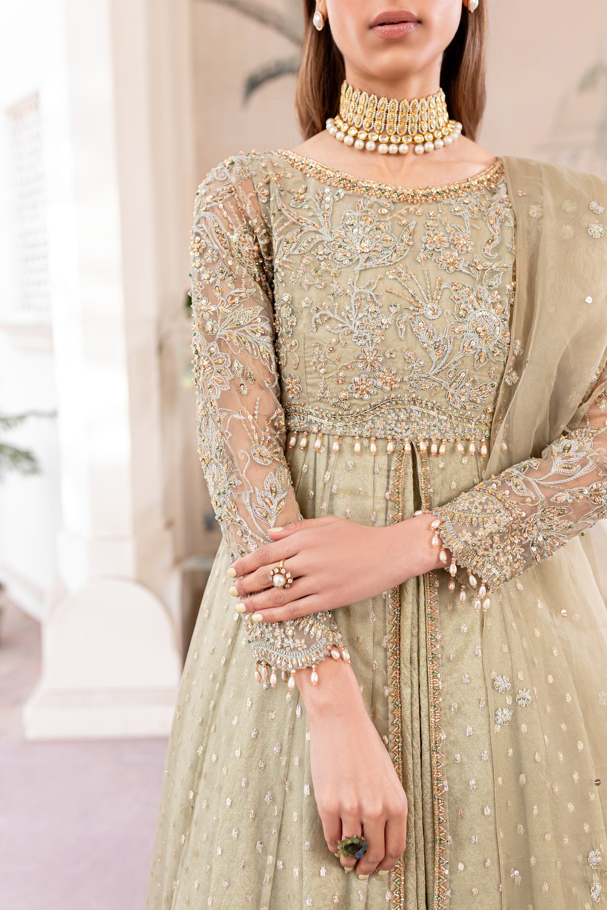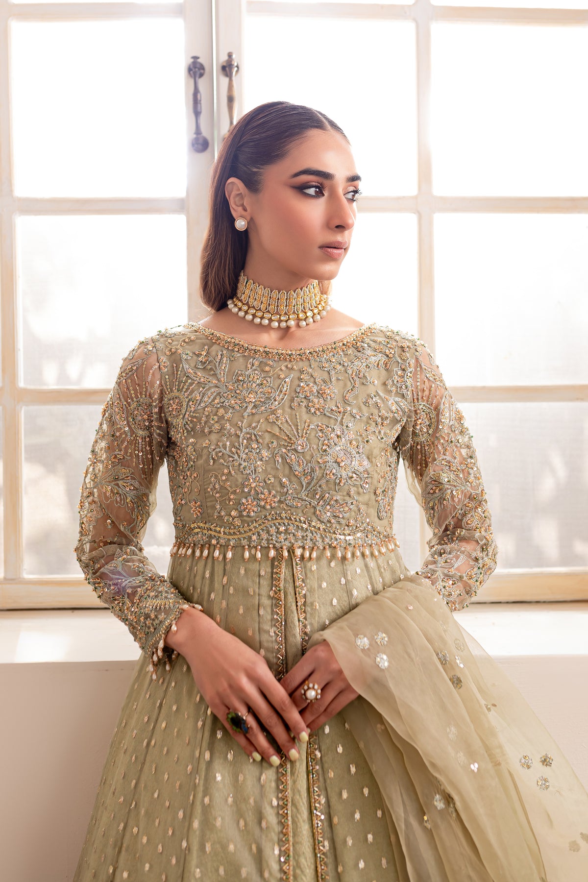 Skillfully designed front open frock made from premium quality organza badla in the shades of pistachio features heavy embroidery all over. Striking details withhold intricate adda work on neckline, yoke, and sleeves enhanced with floral motifs at hem. Further adorned with hangings at frock hem and sleeves.