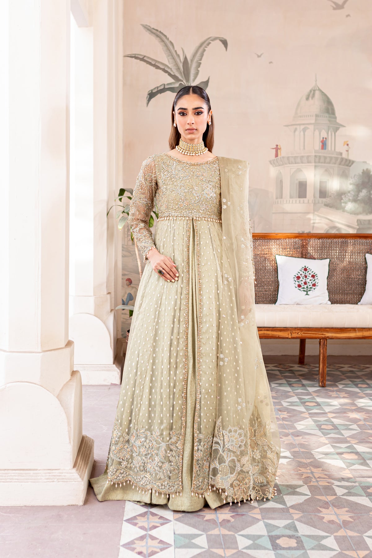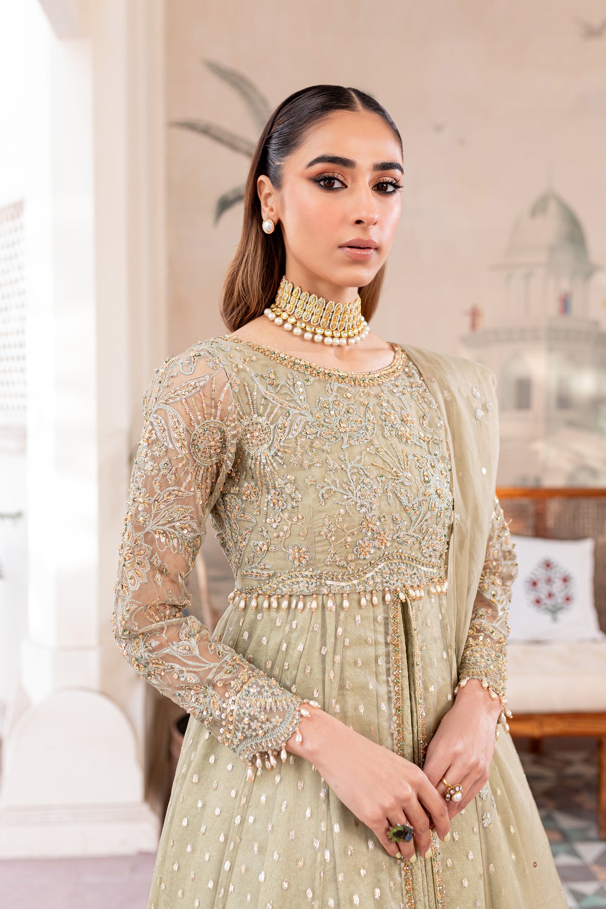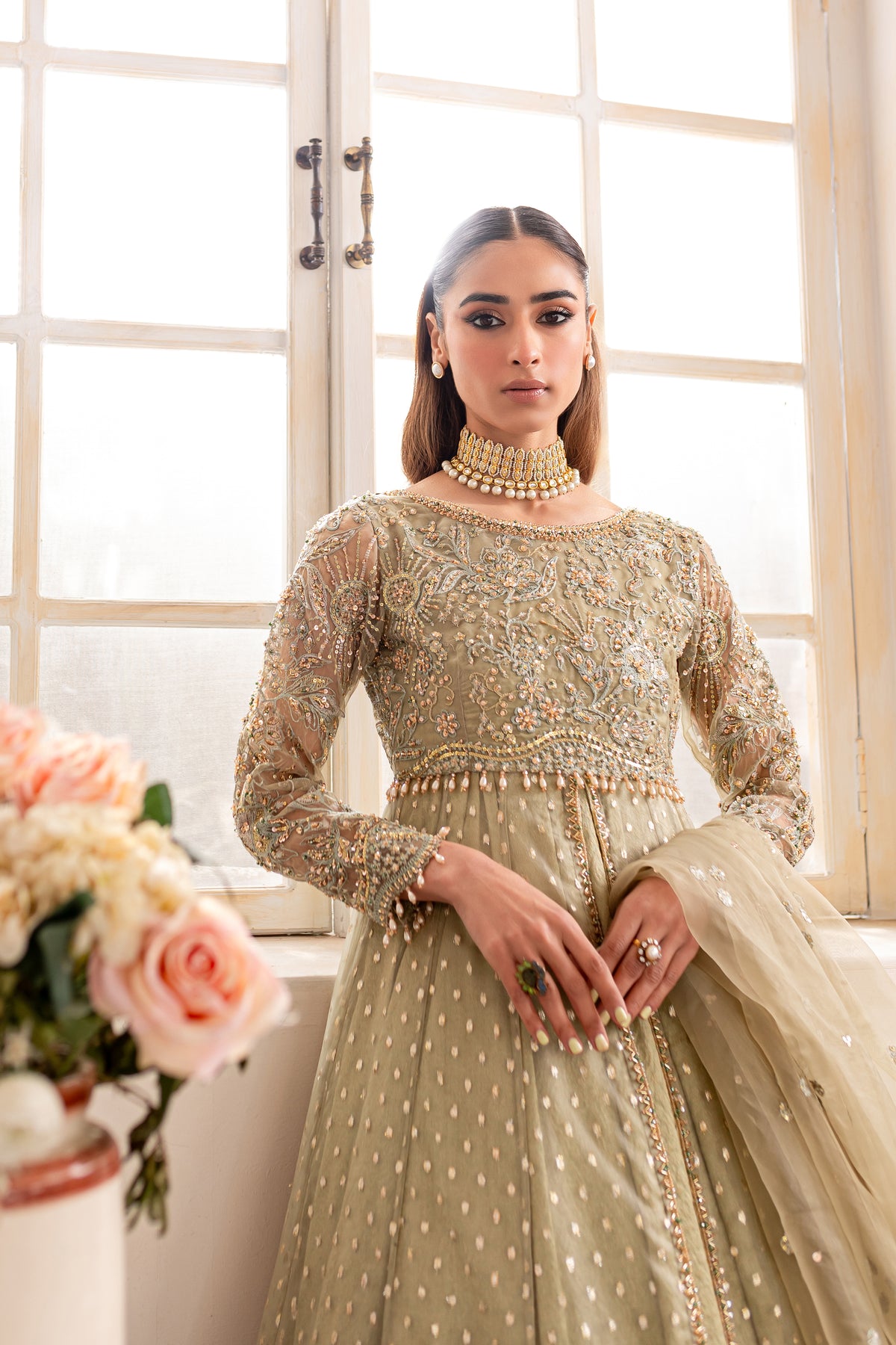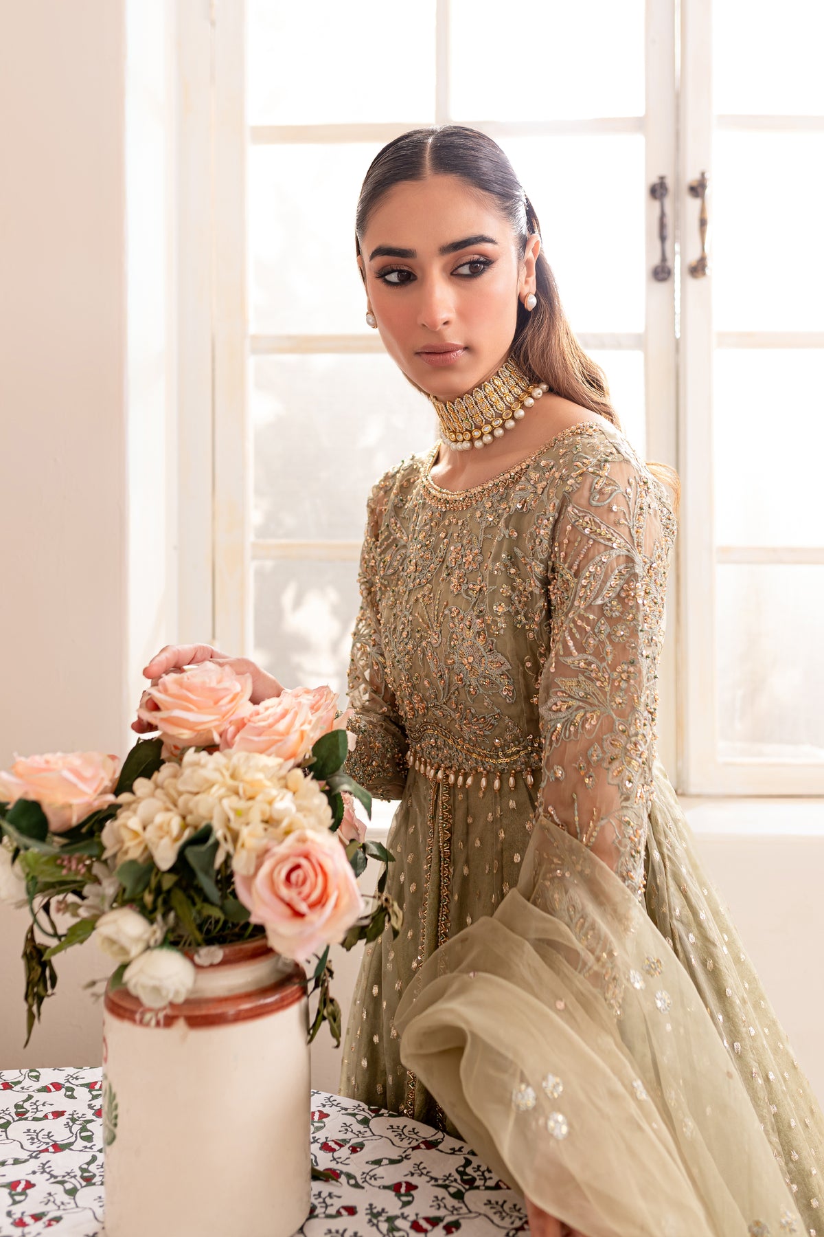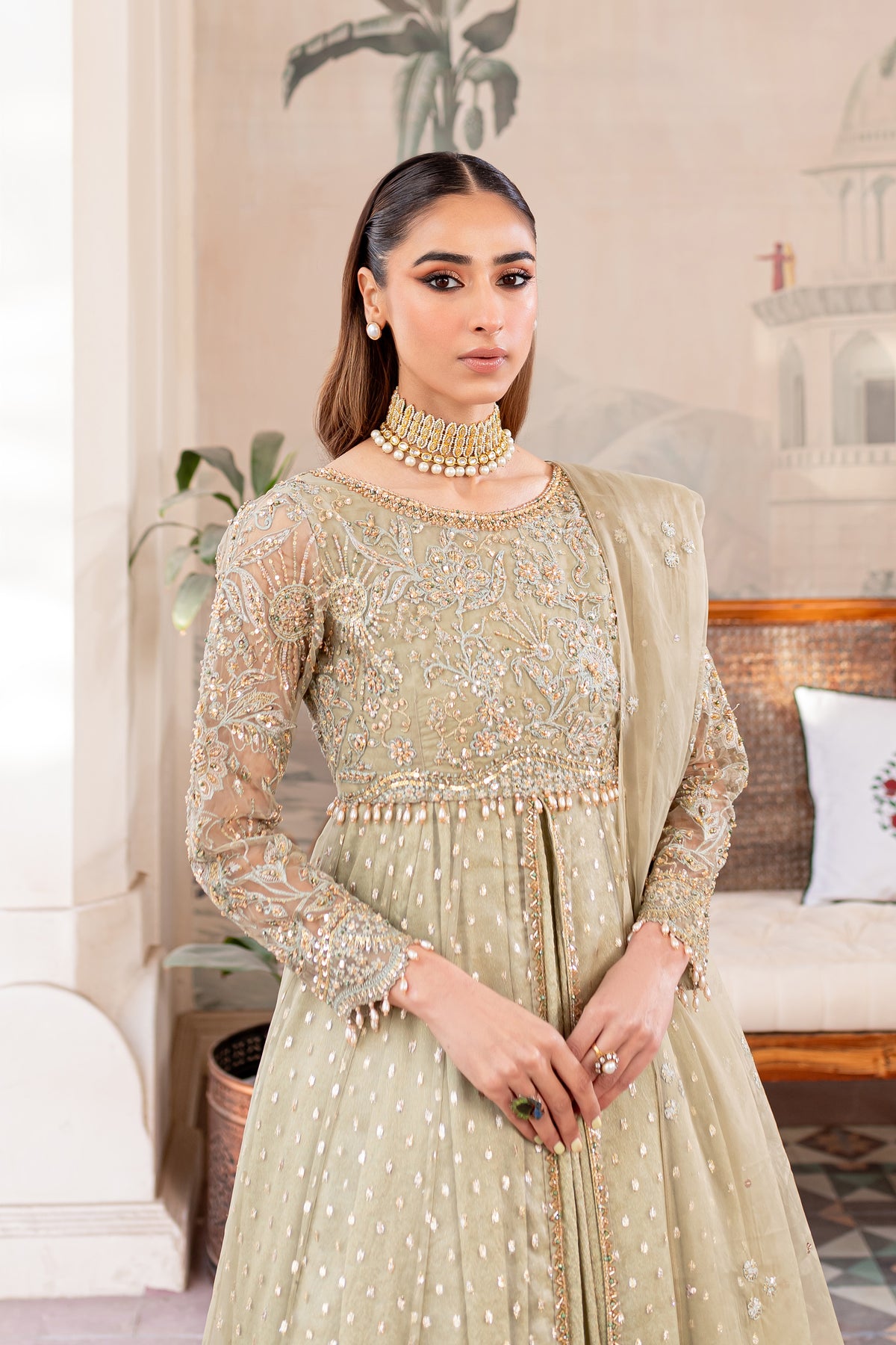 Skillfully designed front open frock made from premium quality organza badla in the shades of pistachio features heavy embroidery all over. Striking details withhold intricate adda work on neckline, yoke, and sleeves enhanced with floral motifs at hem. Further adorned with hangings at frock hem and sleeves.