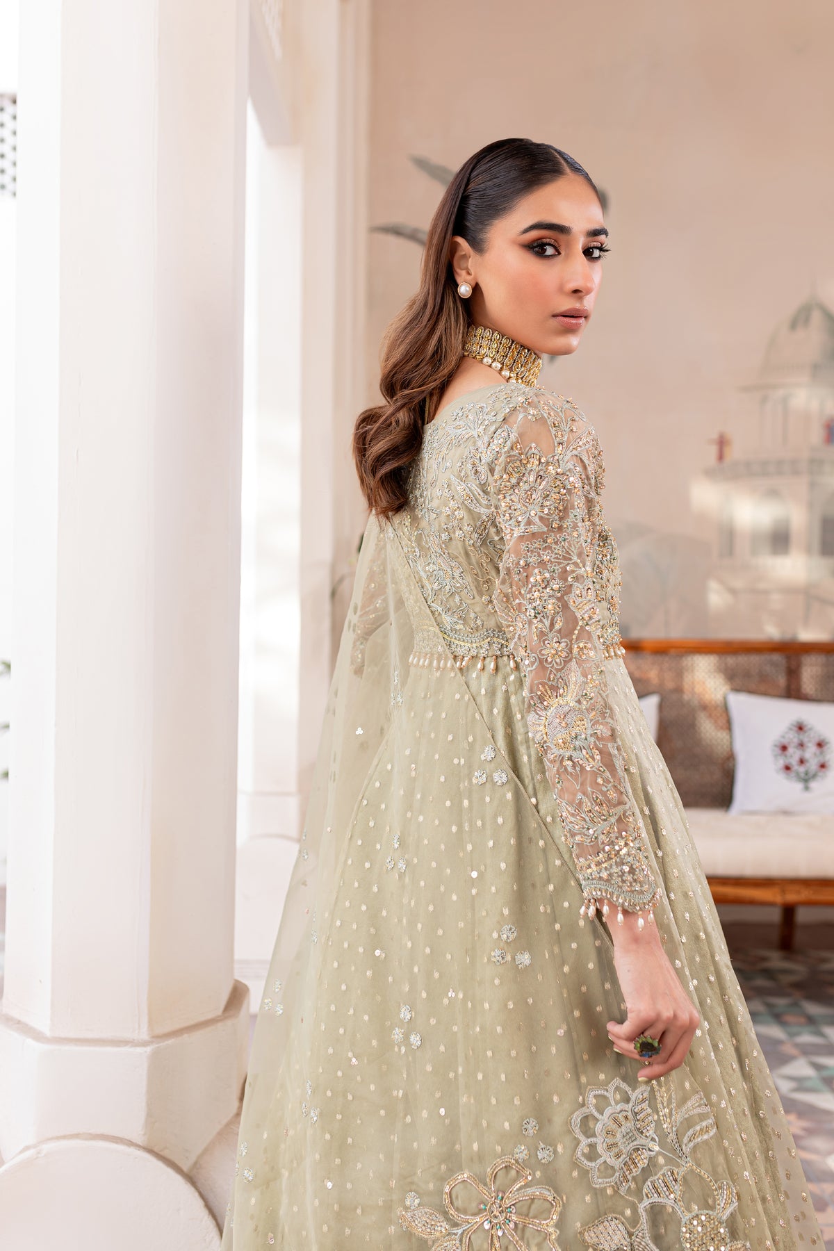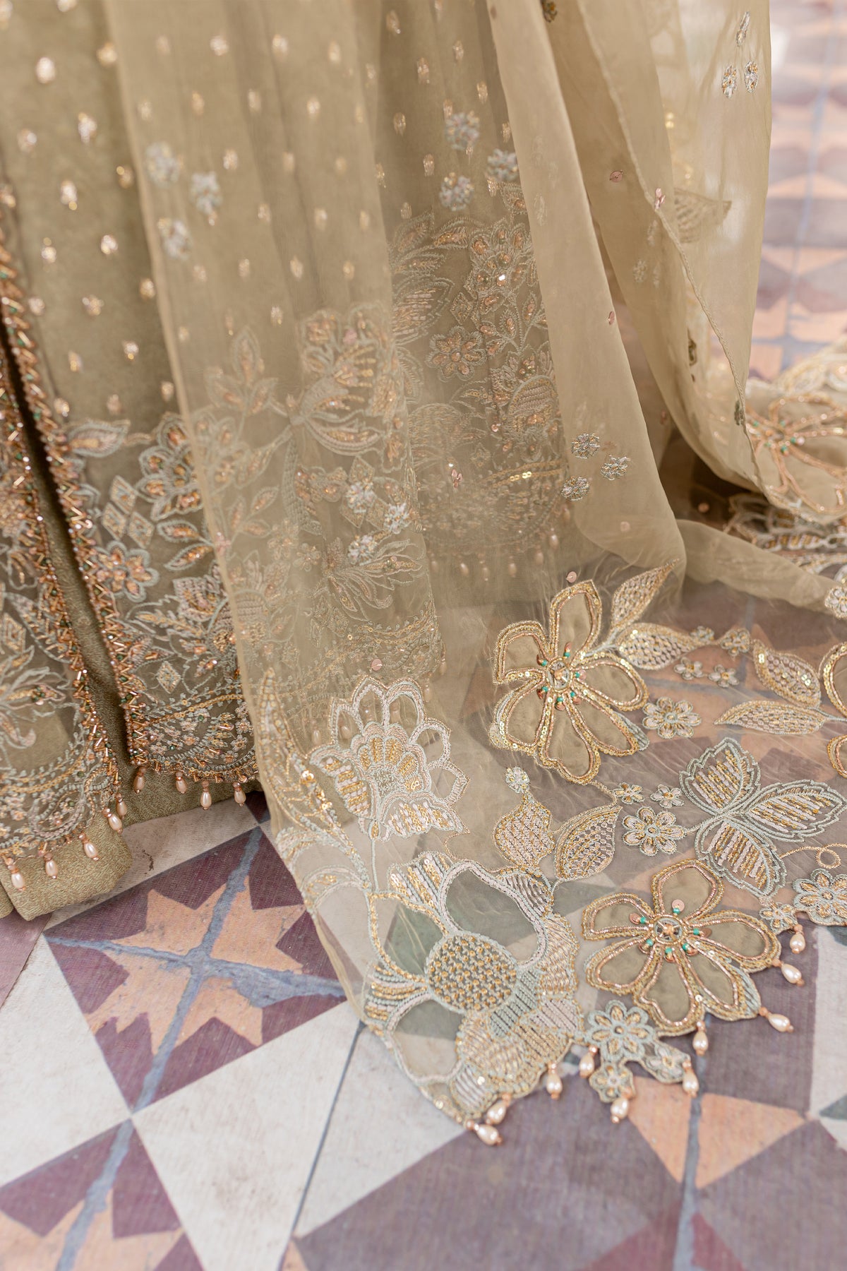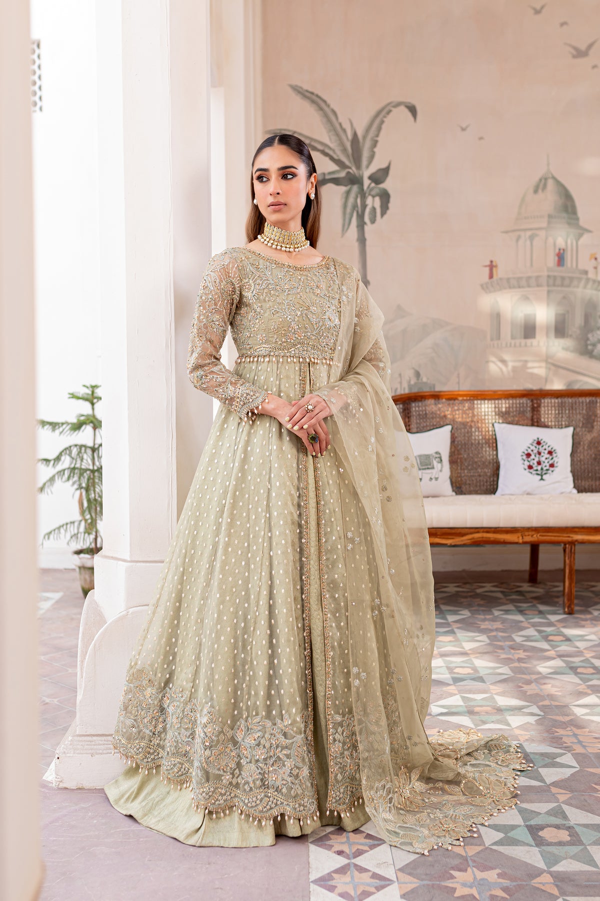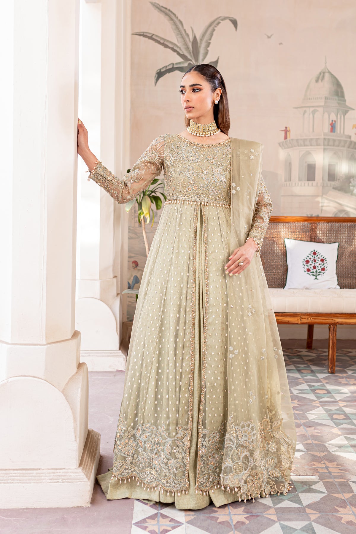 Skillfully designed front open frock made from premium quality organza badla in the shades of pistachio features heavy embroidery all over. Striking details withhold intricate adda work on neckline, yoke, and sleeves enhanced with floral motifs at hem. Further adorned with hangings at frock hem and sleeves.