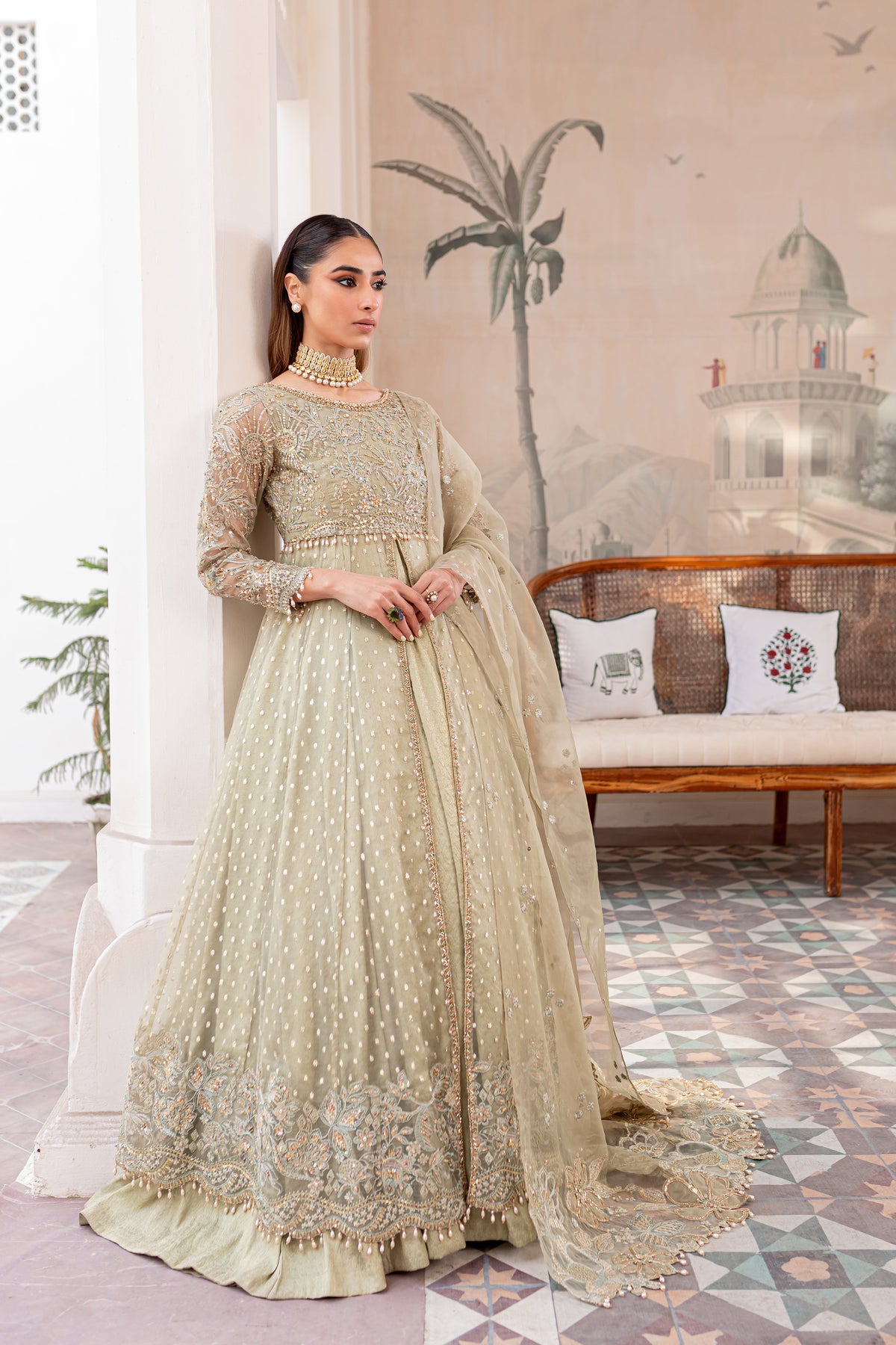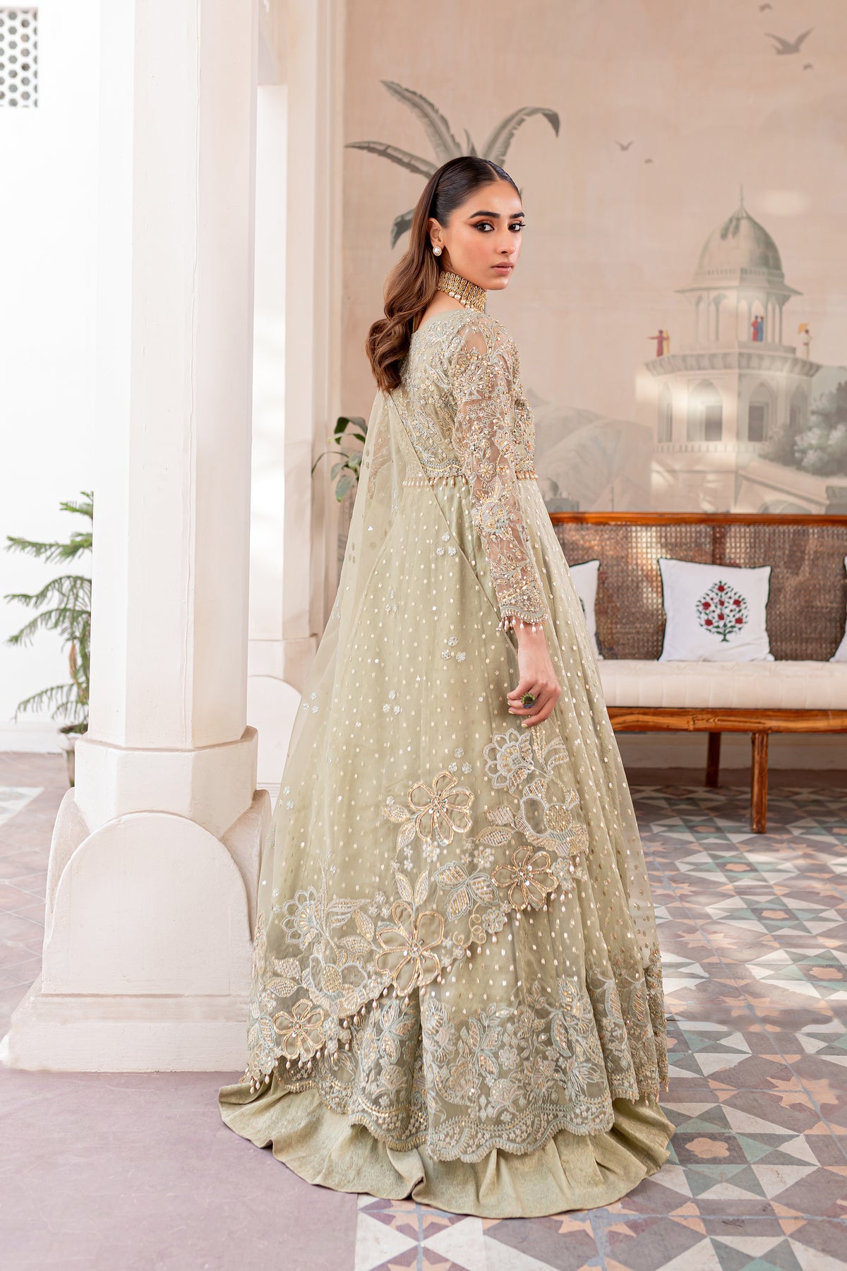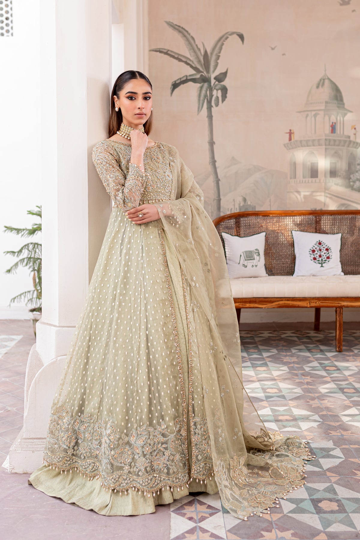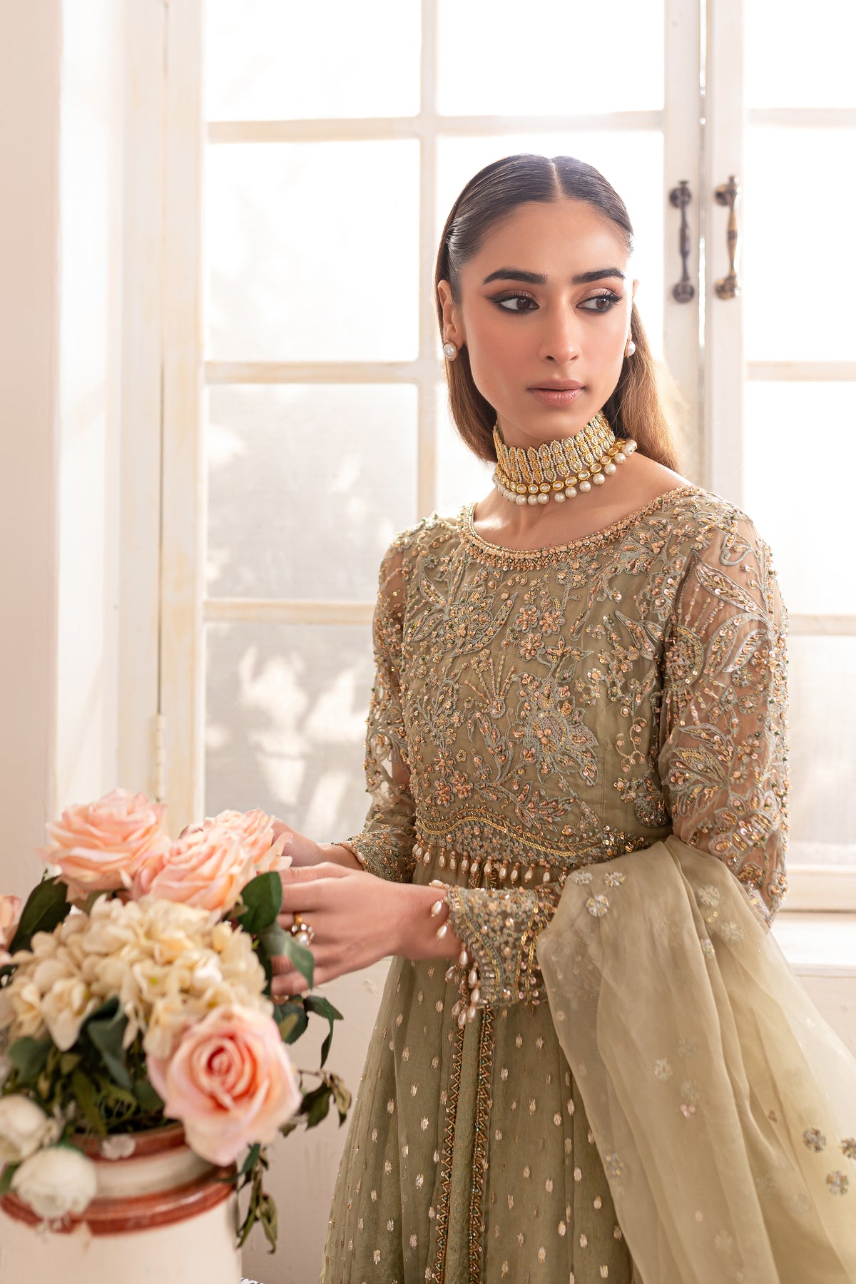 Skillfully designed front open frock made from premium quality organza badla in the shades of pistachio features heavy embroidery all over. Striking details withhold intricate adda work on neckline, yoke, and sleeves enhanced with floral motifs at hem. Further adorned with hangings at frock hem and sleeves.
