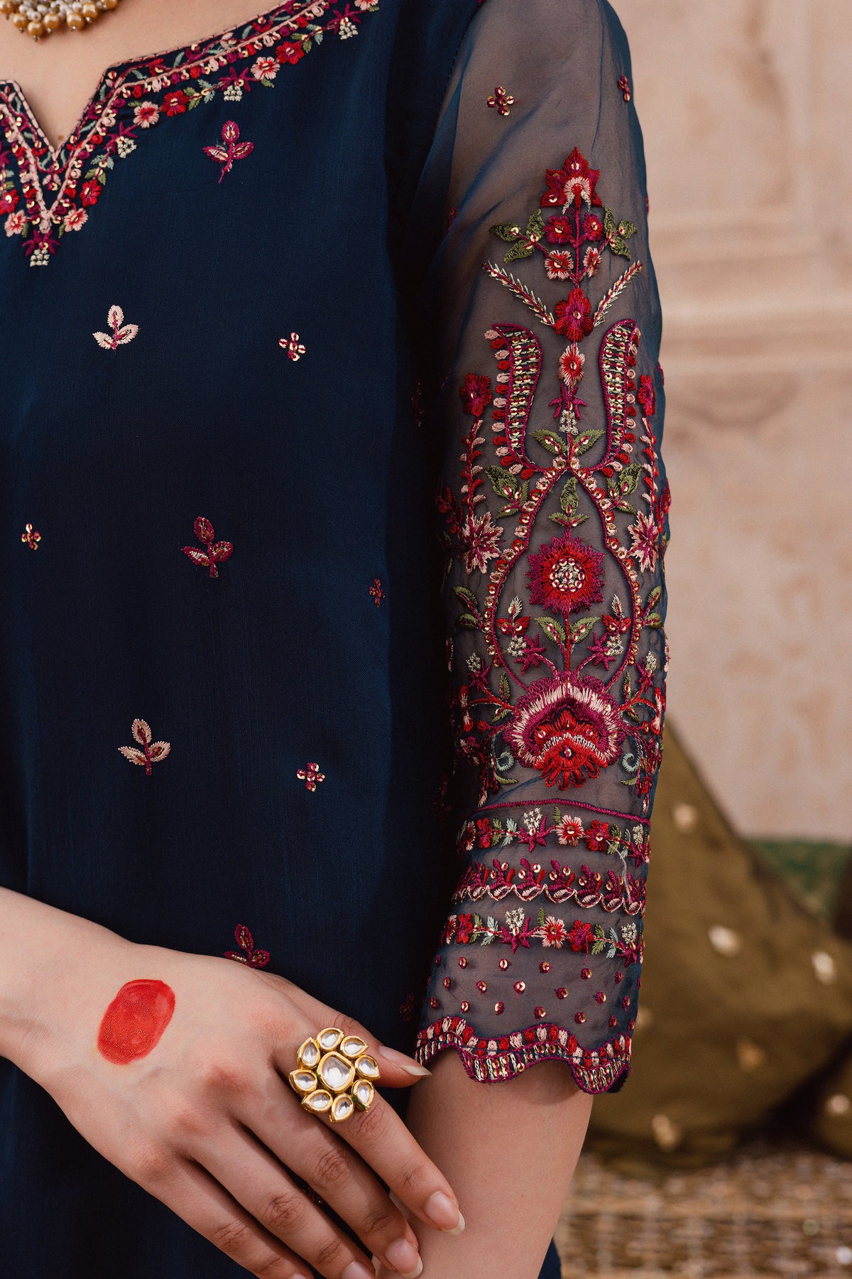 Make a graceful statement with Aleysa, featuring a raw silk short shirt adorned with embroidered borders at the hem and neckline, finished beautifully with kaviya. The organza quarter-length sleeves are composed and embroidered, adding delicate elegance.