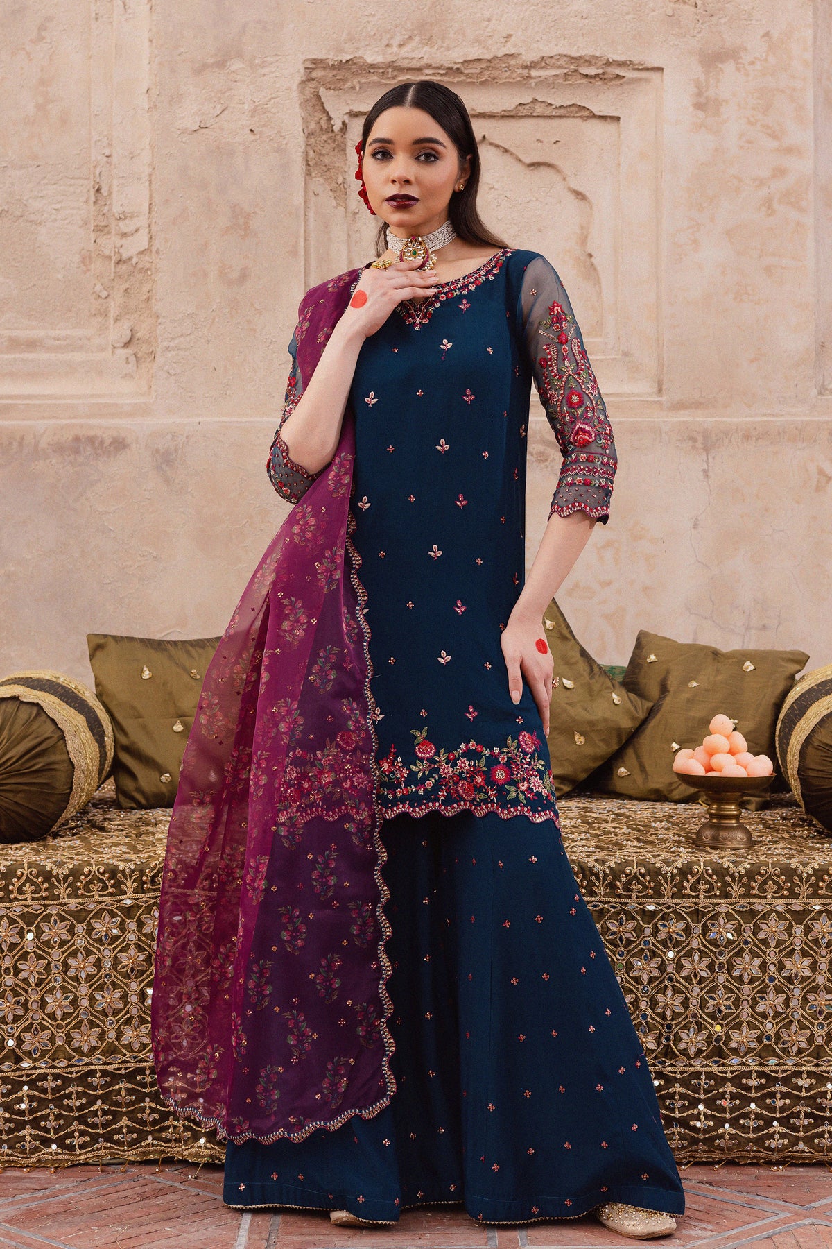 The ensemble is completed with a printed organza dupatta, embellished with an overall sequin spread and bordered on all four sides, finished with kaviya—perfect for festive and formal occasions.