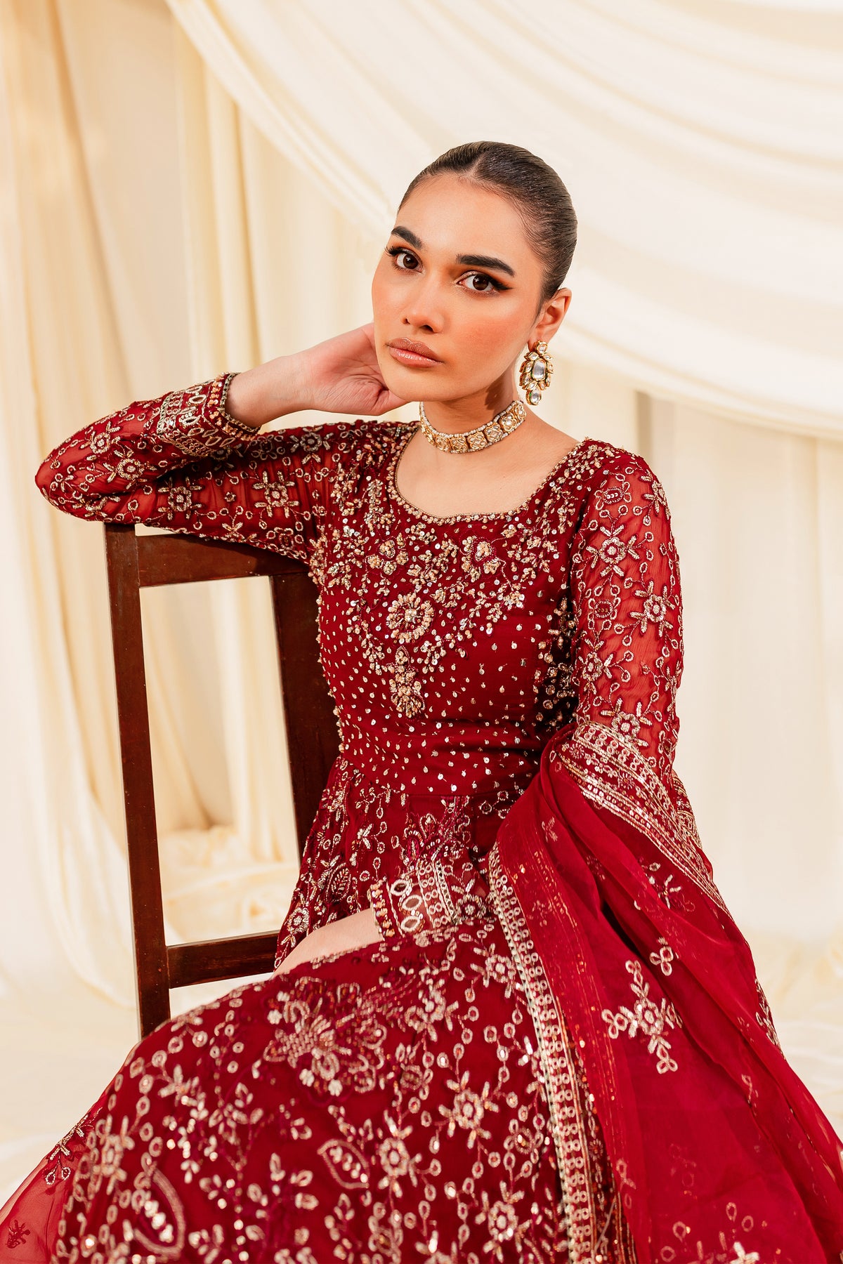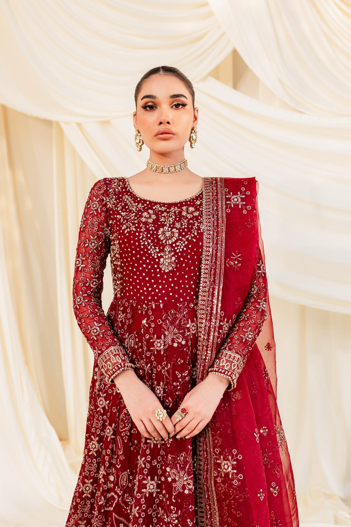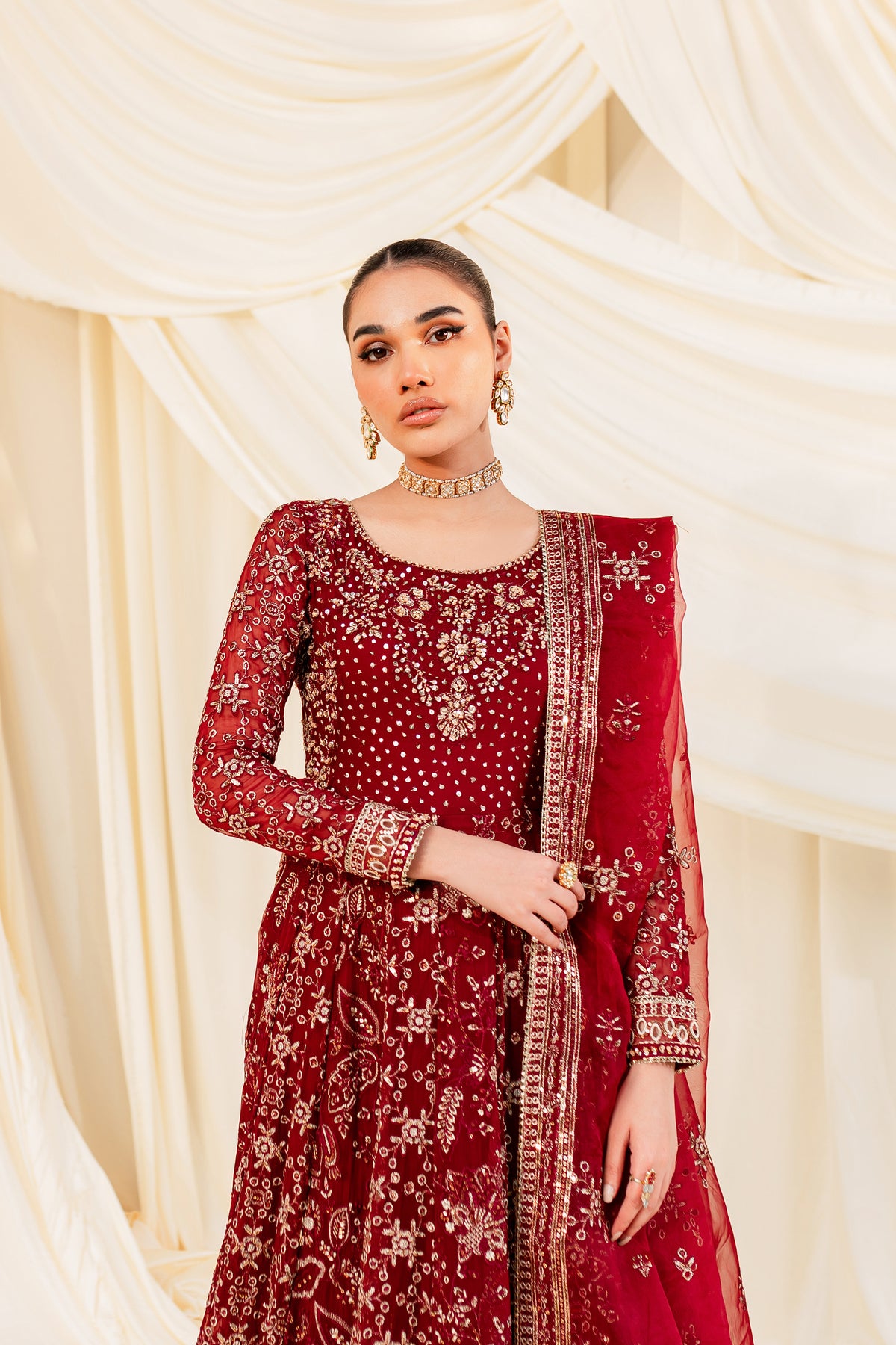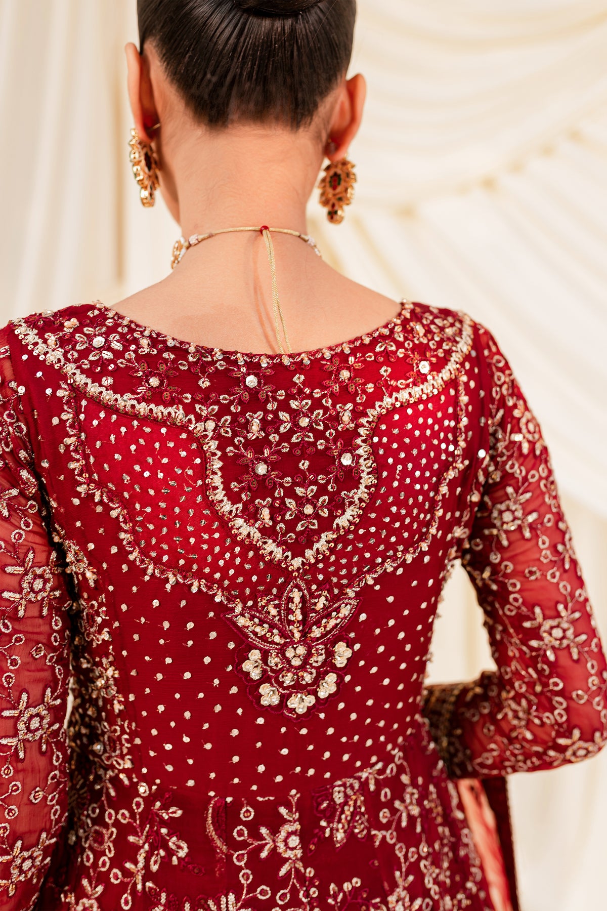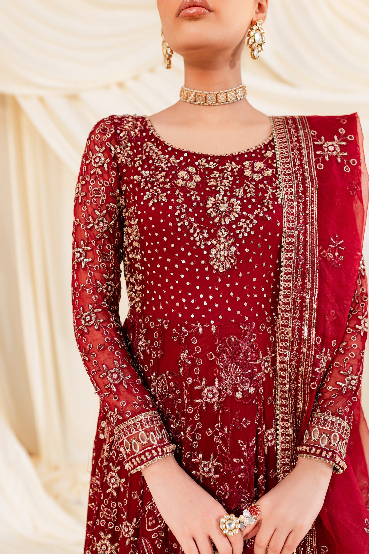 This gorgeous silhouette features a paneled frock made from premium quality crinkle in the shades of maroon. Noteworthy details unveil composed embroidery on yoke and along the panels with a touch of direct adda work. Hem of frock is adorned with organza border featuring hand work, finished with samosa lace. Further enhanced with embroidered sleeves displaying borders at hem – finished with direct adda and lace.