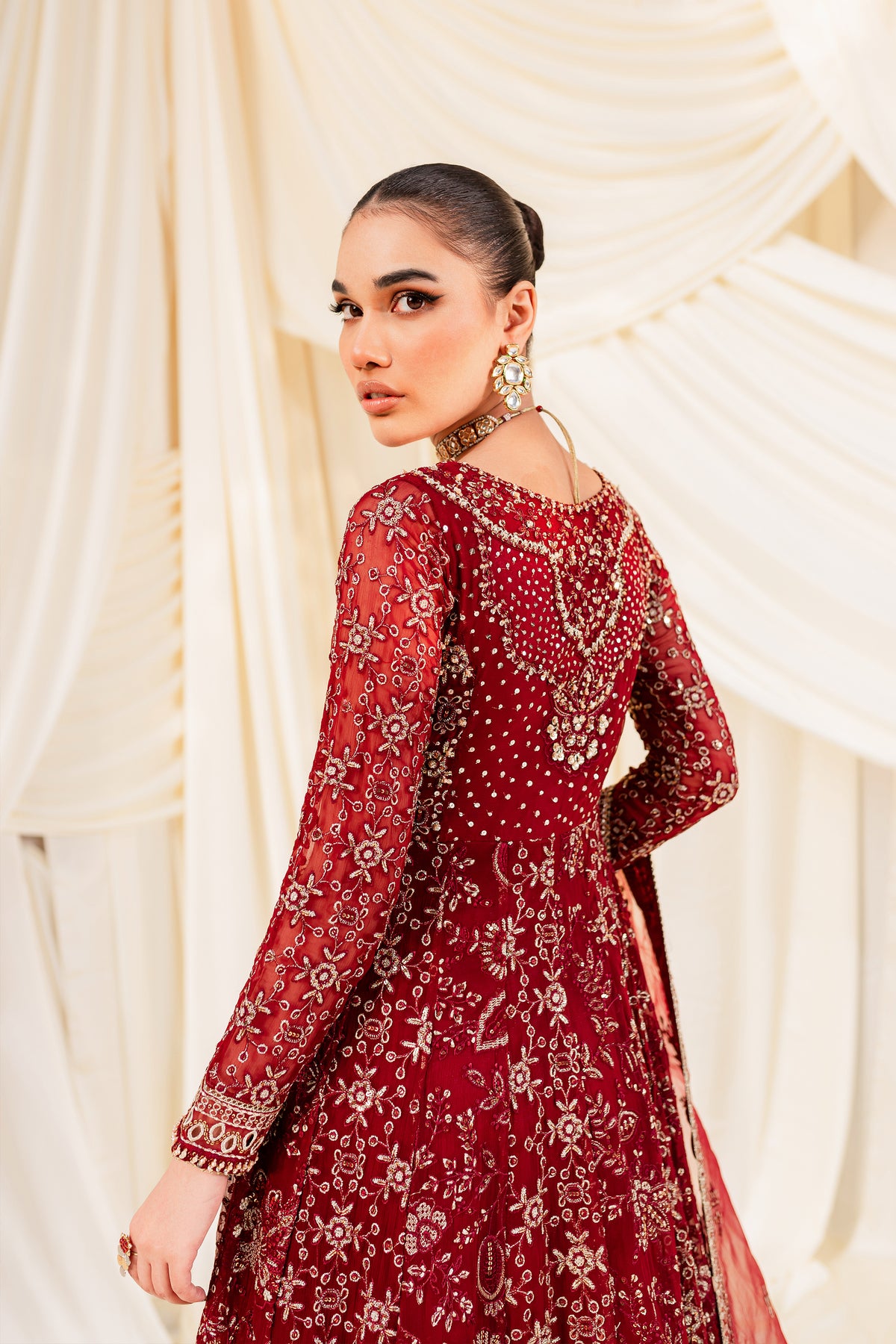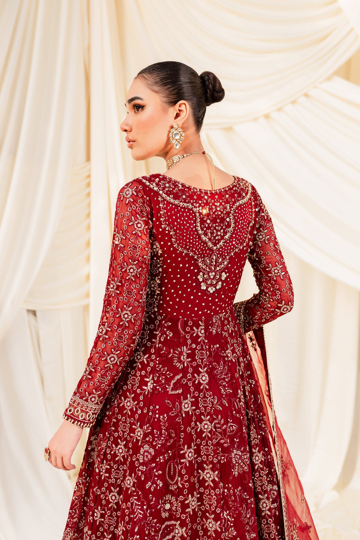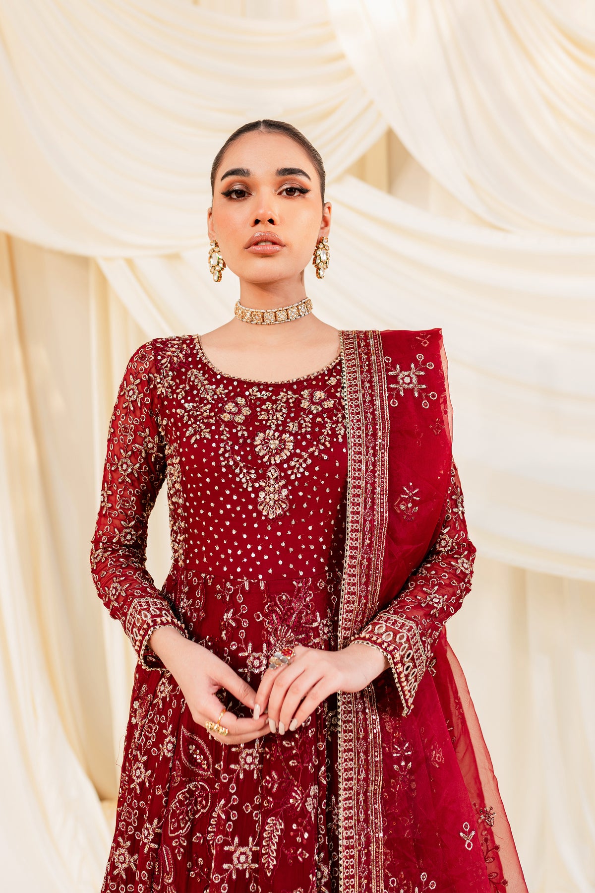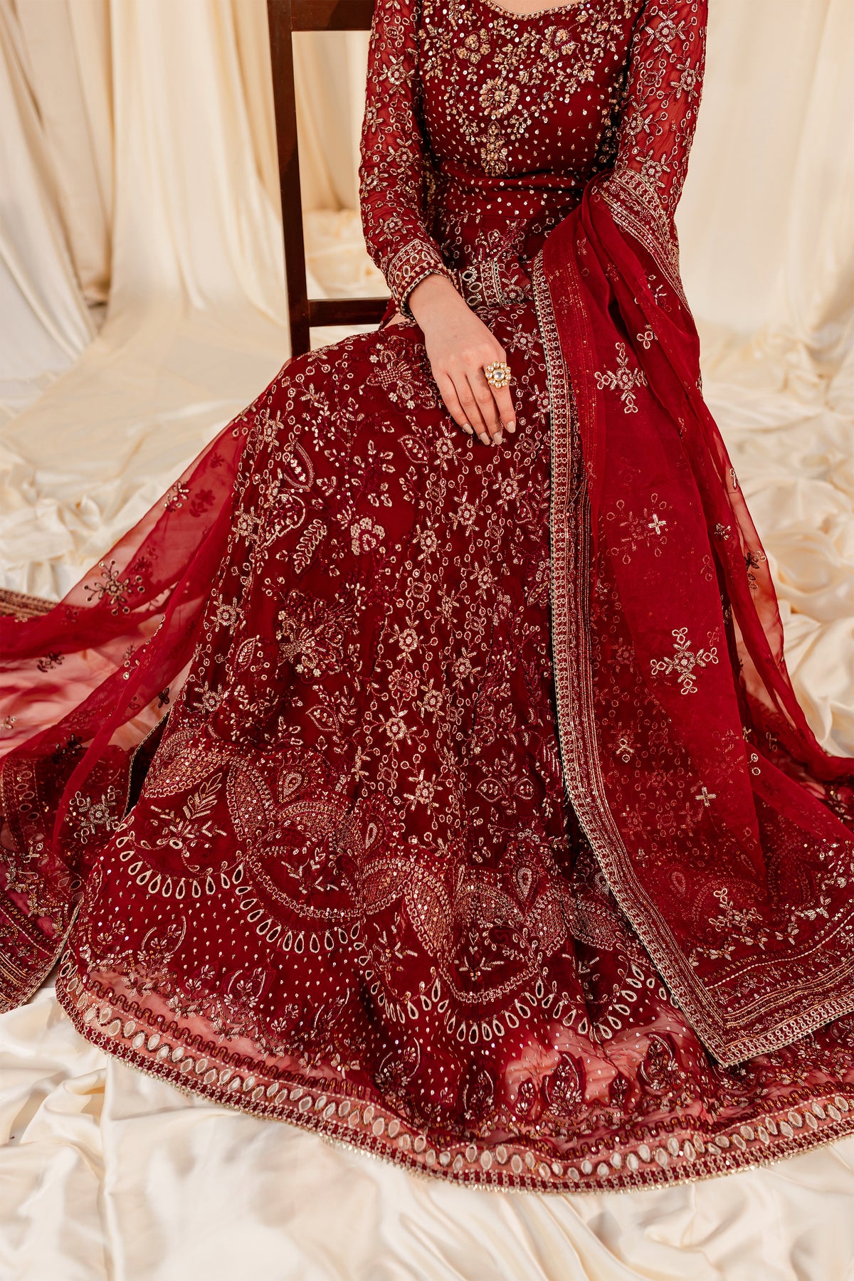 This gorgeous silhouette features a paneled frock made from premium quality crinkle in the shades of maroon. Noteworthy details unveil composed embroidery on yoke and along the panels with a touch of direct adda work. Hem of frock is adorned with organza border featuring hand work, finished with samosa lace. Further enhanced with embroidered sleeves displaying borders at hem – finished with direct adda and lace.