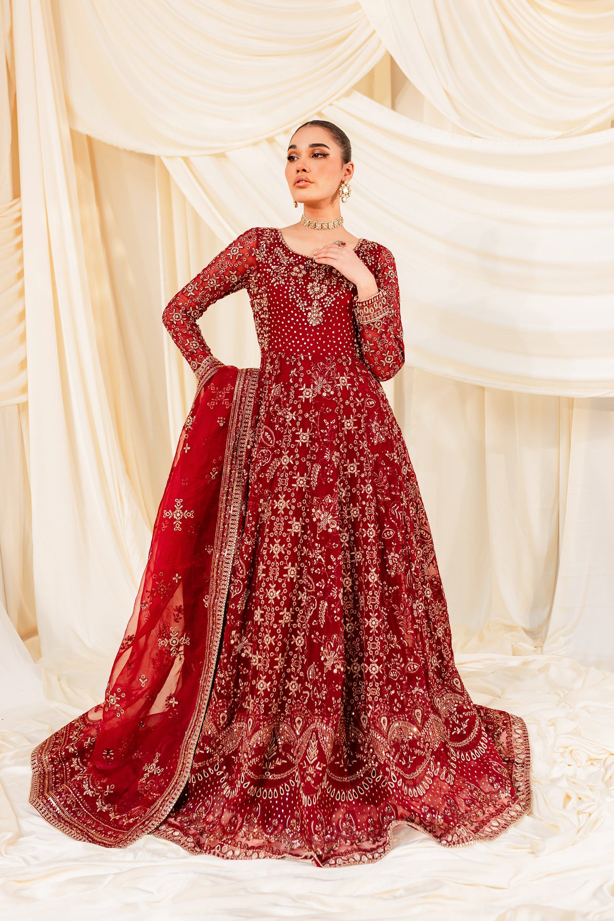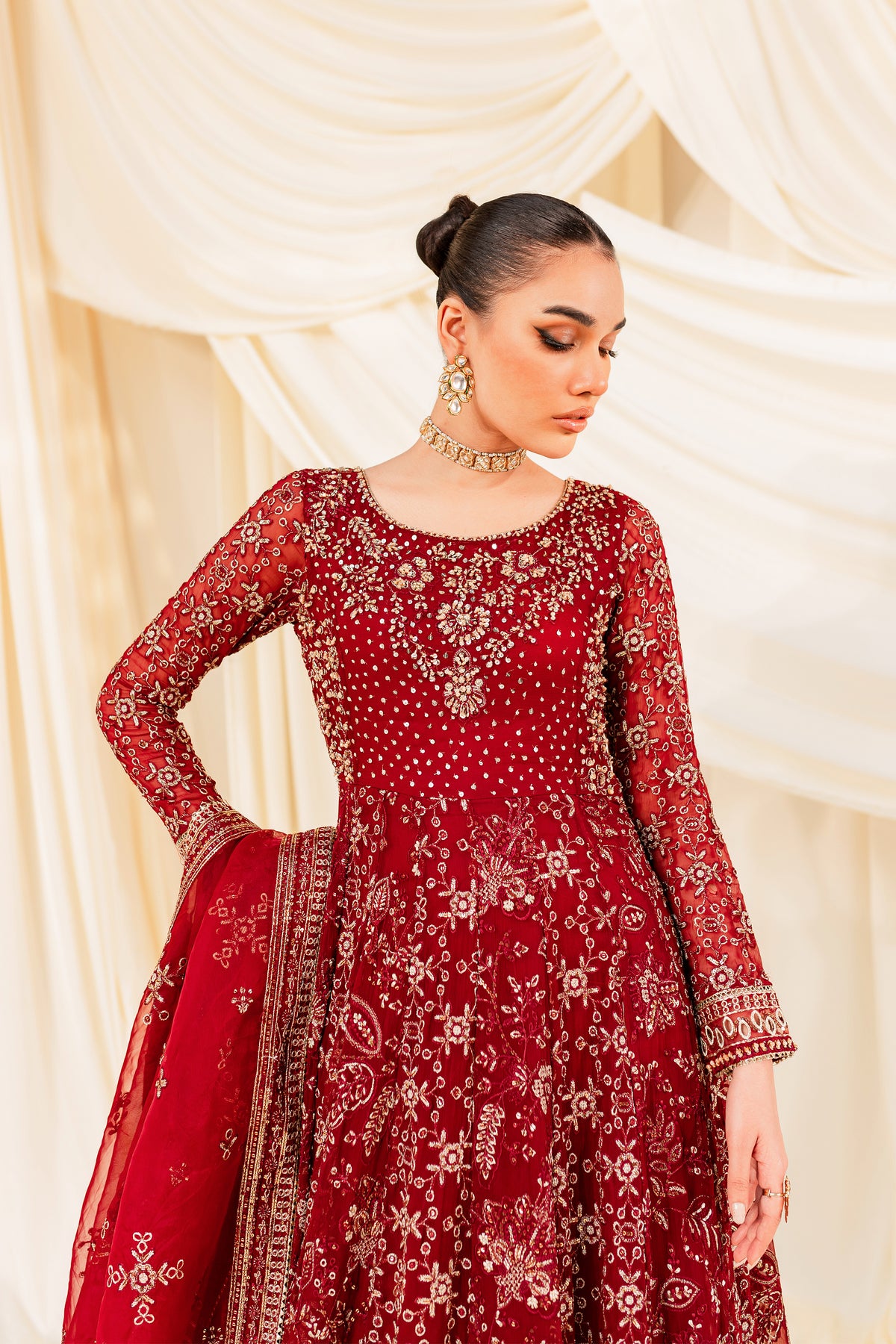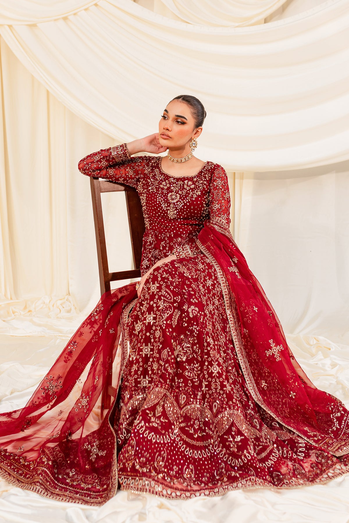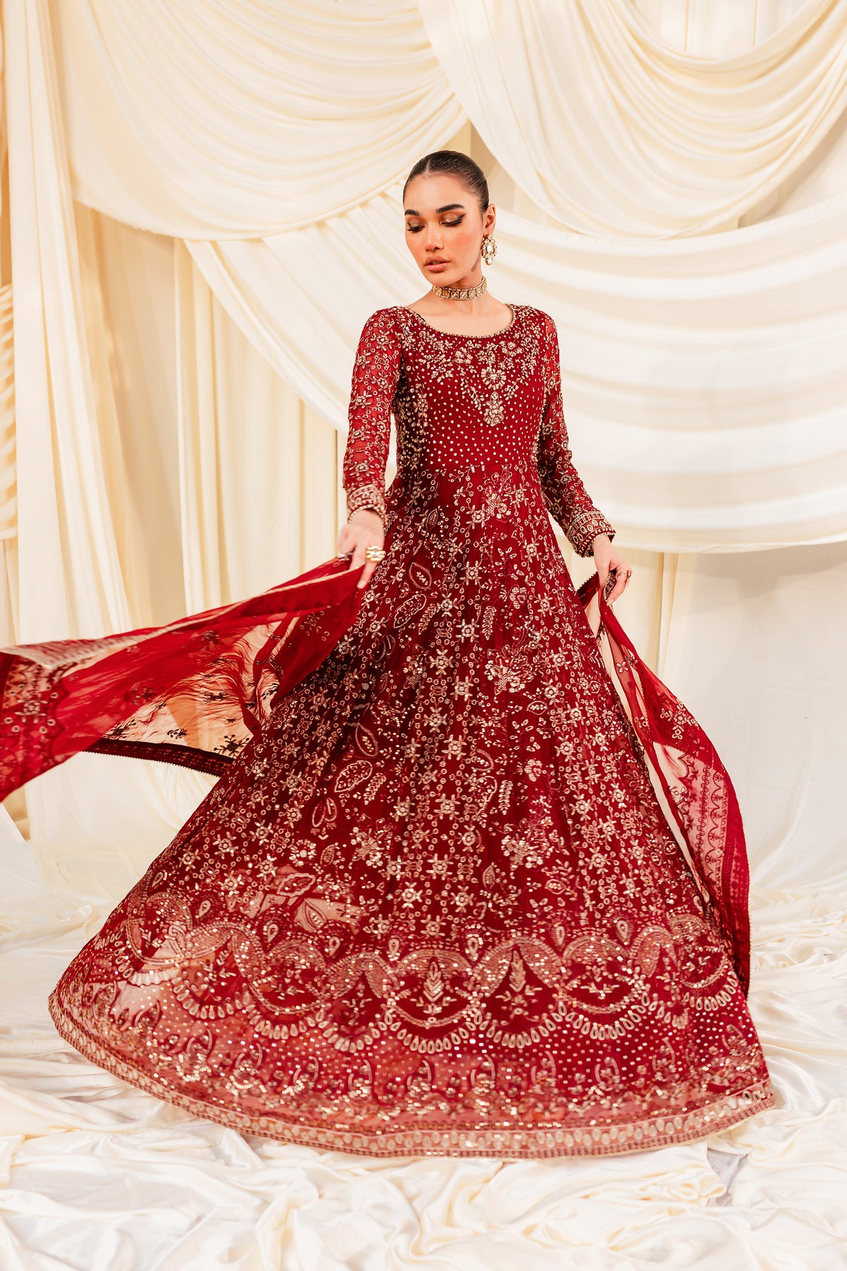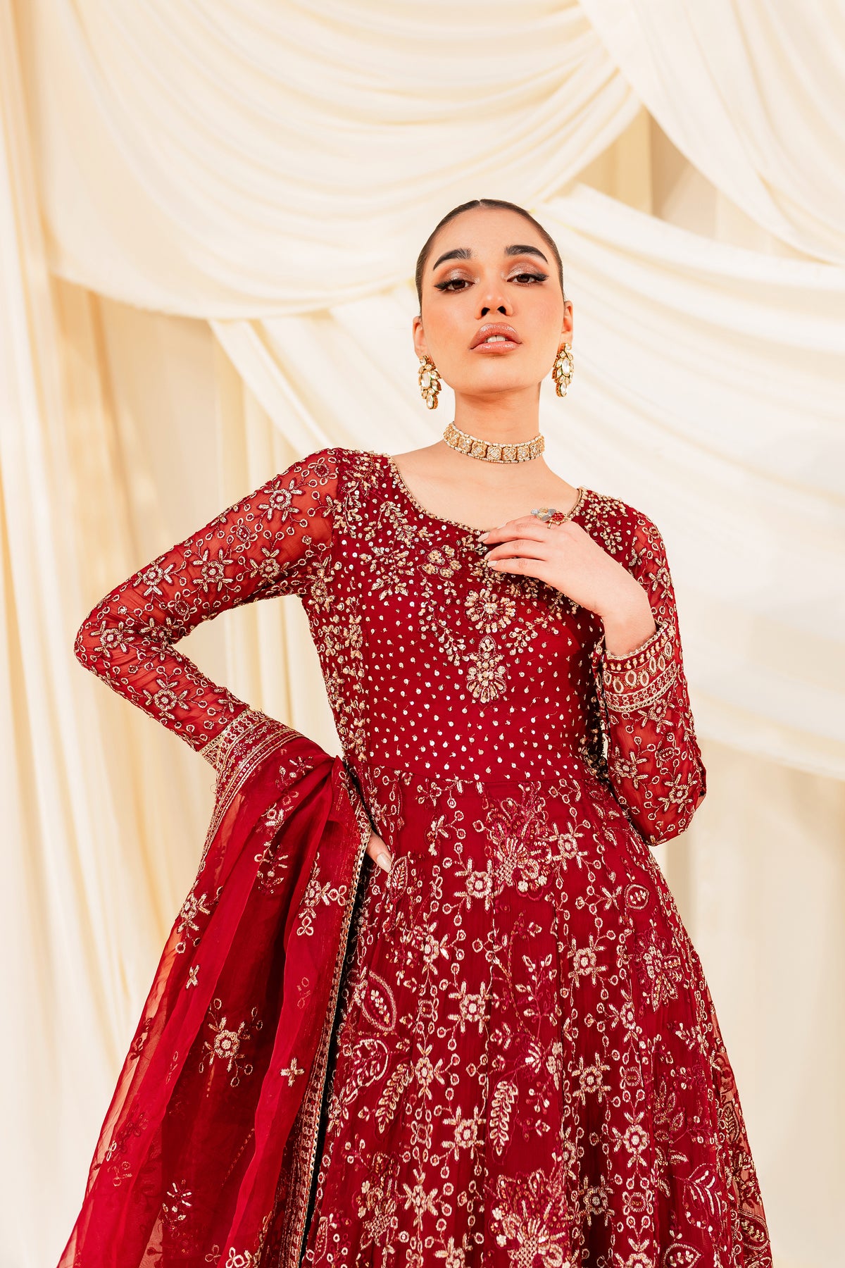 This gorgeous silhouette features a paneled frock made from premium quality crinkle in the shades of maroon. Noteworthy details unveil composed embroidery on yoke and along the panels with a touch of direct adda work. Hem of frock is adorned with organza border featuring hand work, finished with samosa lace. Further enhanced with embroidered sleeves displaying borders at hem – finished with direct adda and lace.