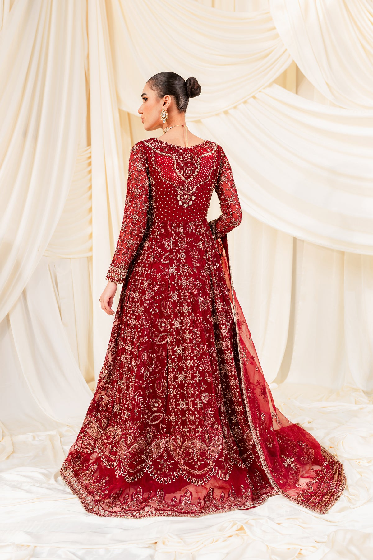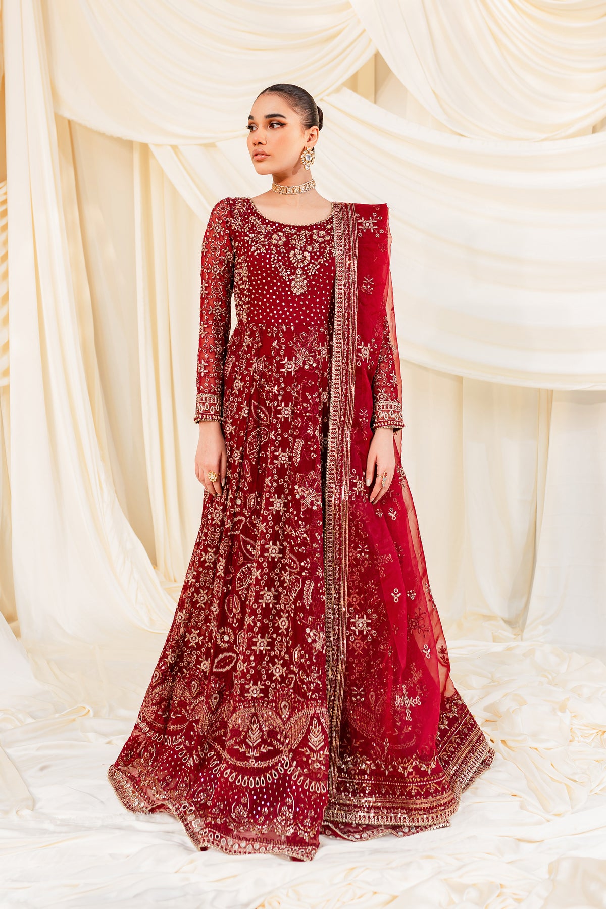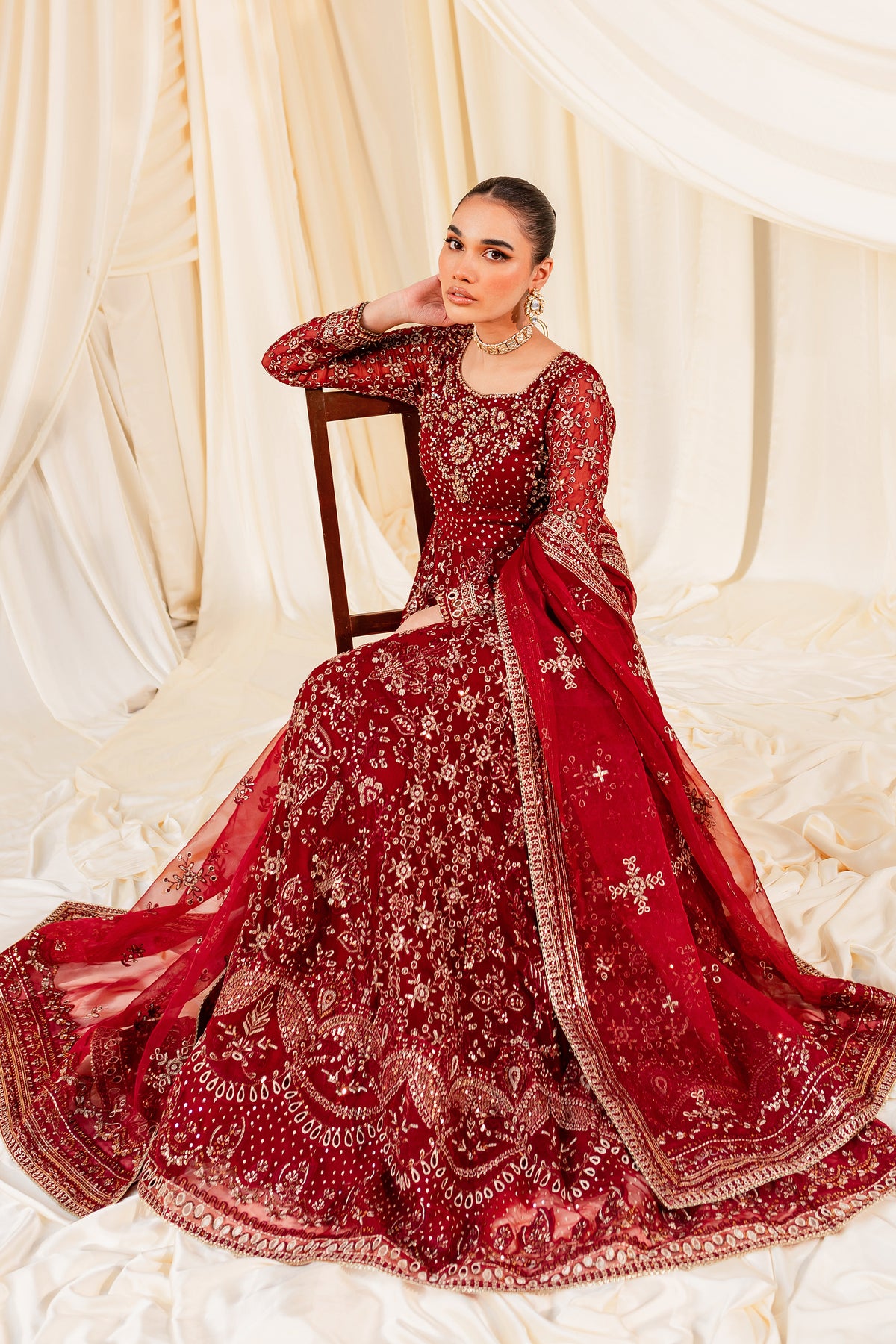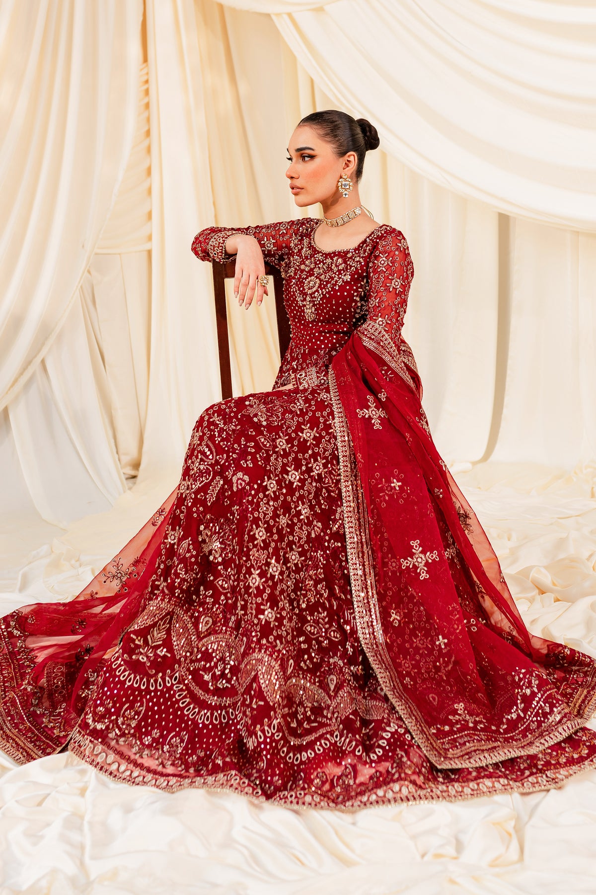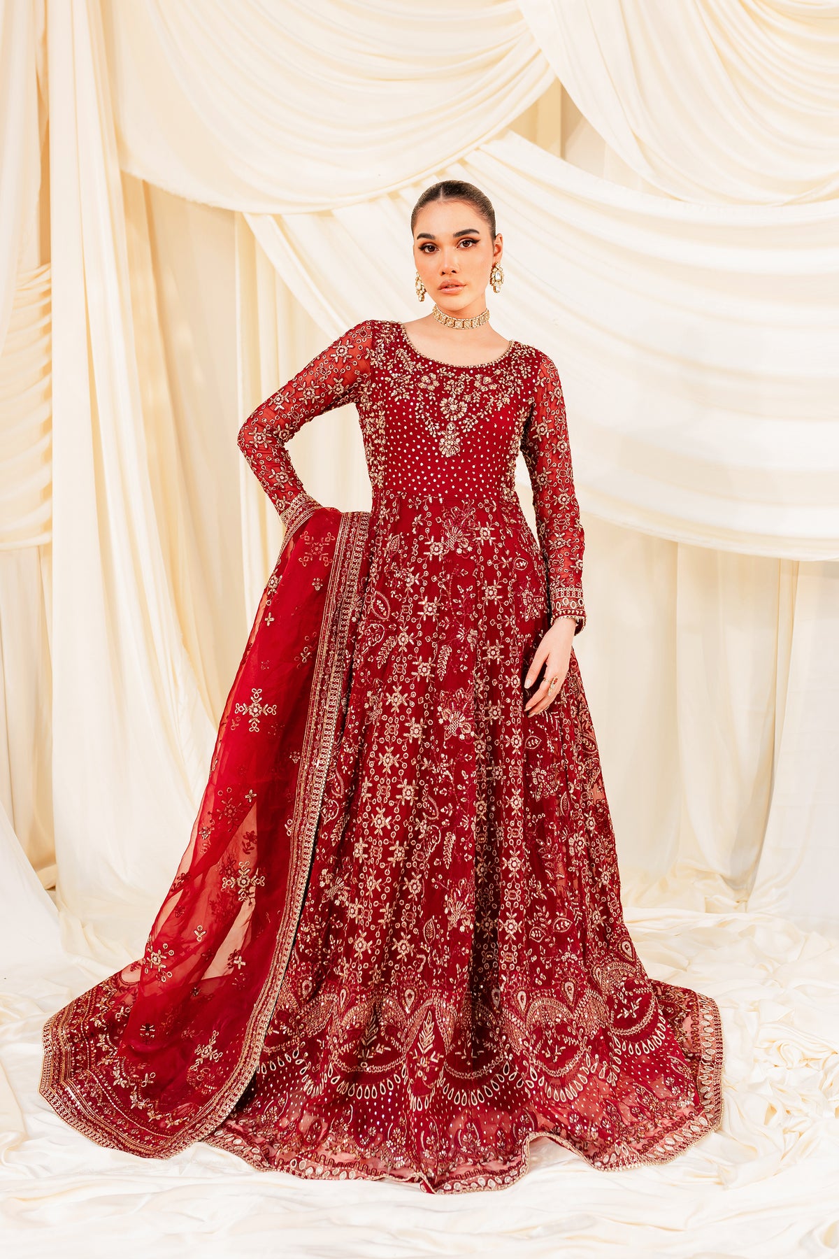 This gorgeous silhouette features a paneled frock made from premium quality crinkle in the shades of maroon. Noteworthy details unveil composed embroidery on yoke and along the panels with a touch of direct adda work. Hem of frock is adorned with organza border featuring hand work, finished with samosa lace. Further enhanced with embroidered sleeves displaying borders at hem – finished with direct adda and lace.